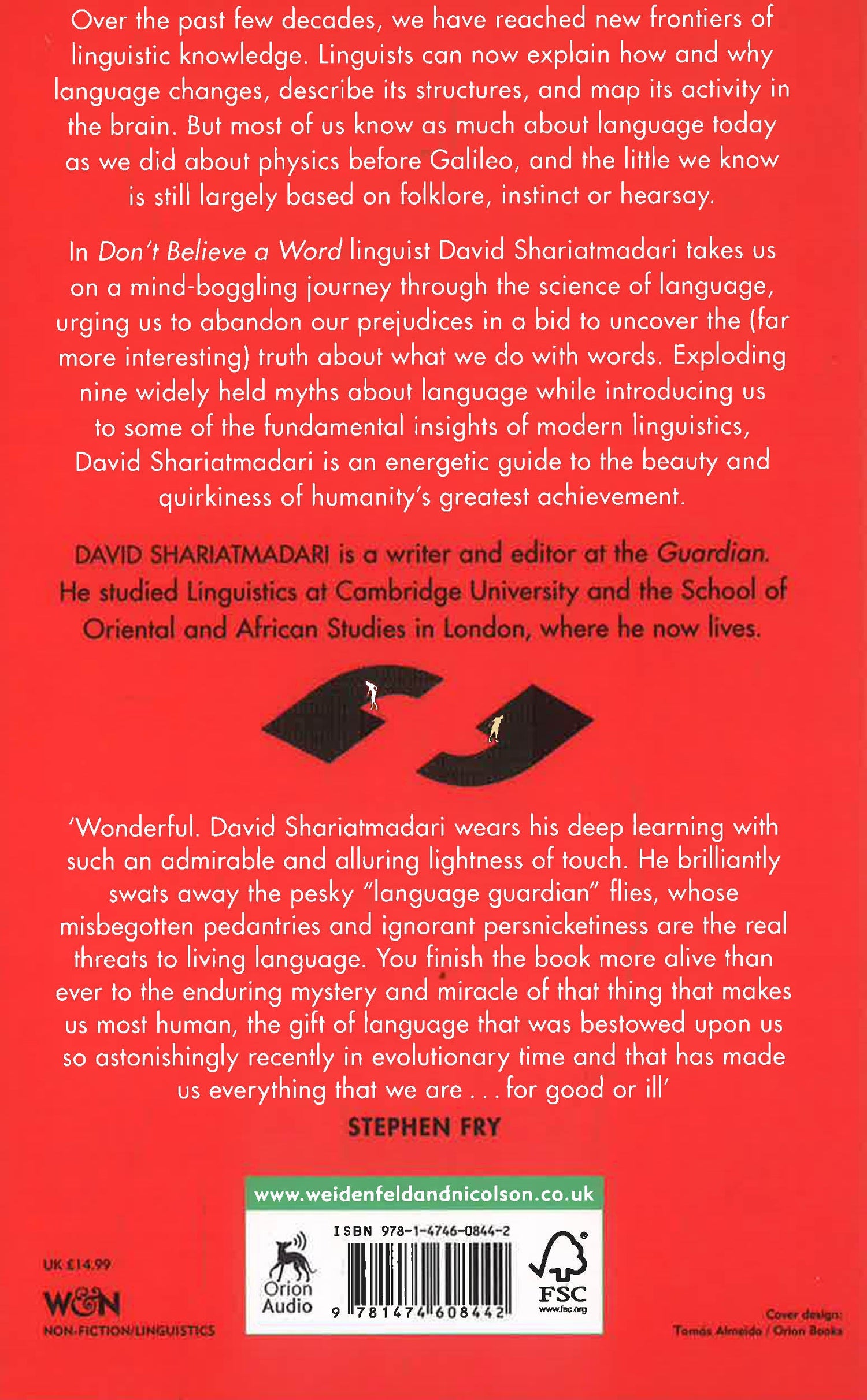 Everyone likes to think they know a bit about language:There's a term in Portuguese you simply can't translate The origin of a word tells you how it should be used Standards of grammar have taken a nosedive recently The real meaning of 'disinterested' is 'unbiased' Computers will soon be able to speak like human beings A dialect is inferior to a language The problem is, none of these statements is true. Over the past few decades, we have reached new frontiers of linguistic knowledge. Linguists can now explain how and why language changes, describe its structures, and map its activity in the brain. But most of us know as much about language today as we did about physics before Galileo, and the little we know is still largely based on folklore, instinct or hearsay. In DON'T BELIEVE A WORD linguist David Shariatmadari takes us on a mind-boggling journey through the science of language, urging us to abandon our prejudices in a bid to uncover the (far more interesting) truth about what we do with words. Exploding nine widely-held myths about language while introducing us to some of the fundamental insights of modern linguistics, David Shariatmadari is an energetic guide to the beauty and quirkiness of humanity's greatest achievement.