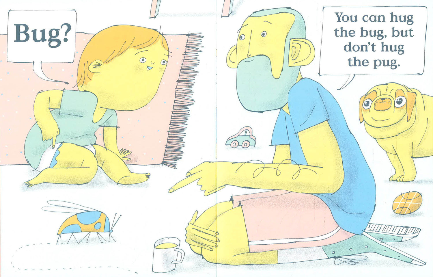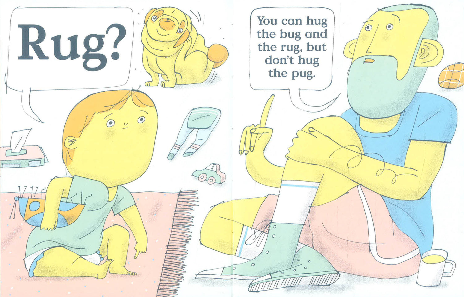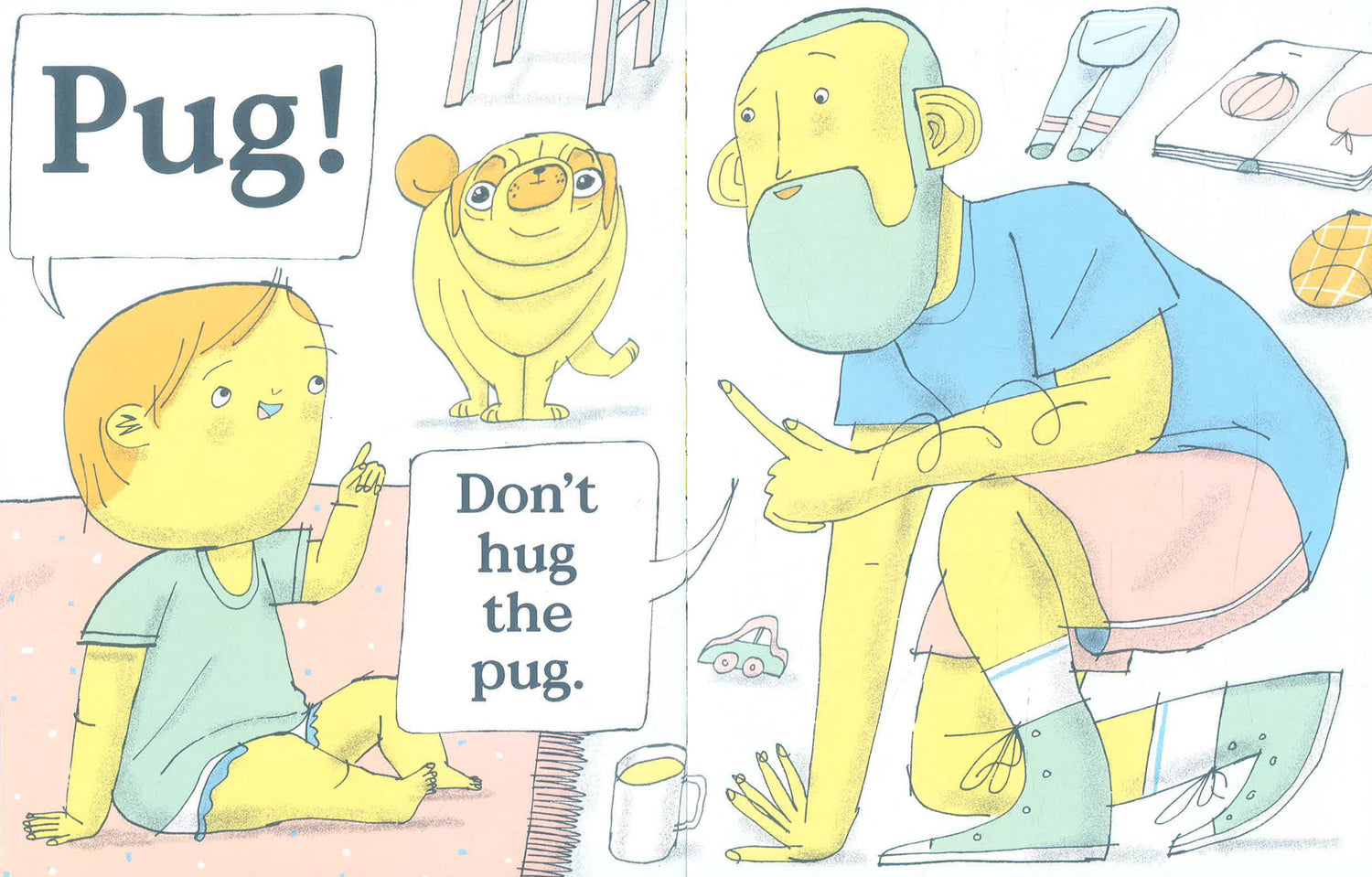 Long-listed for the BookTrust Storytime Prize 2020. A great book to read aloud, children will love joining in with 'Don't hug the pug!' and be highly amused by the rather smelly outcome! -- Book Activist A sweet story with an unexpected twist at the end. -- Parent's In Touch A simple story told in comic-book form about a baby that does a lot of hugging.... with one caveat! Baby likes to cuddle. Grown-Up lets him cuddle the rug, the jug, the bug and the slug. But DON'T HUG THE PUG! Why not? What's wrong with the pug....? A hilarious and deceptively simple story that will have little ones shrieking with laughter. The combination of speech bubbles, rhymes, very short sentences and a stinky twist makes this a perfect book for both the pre-school audience and early readers.