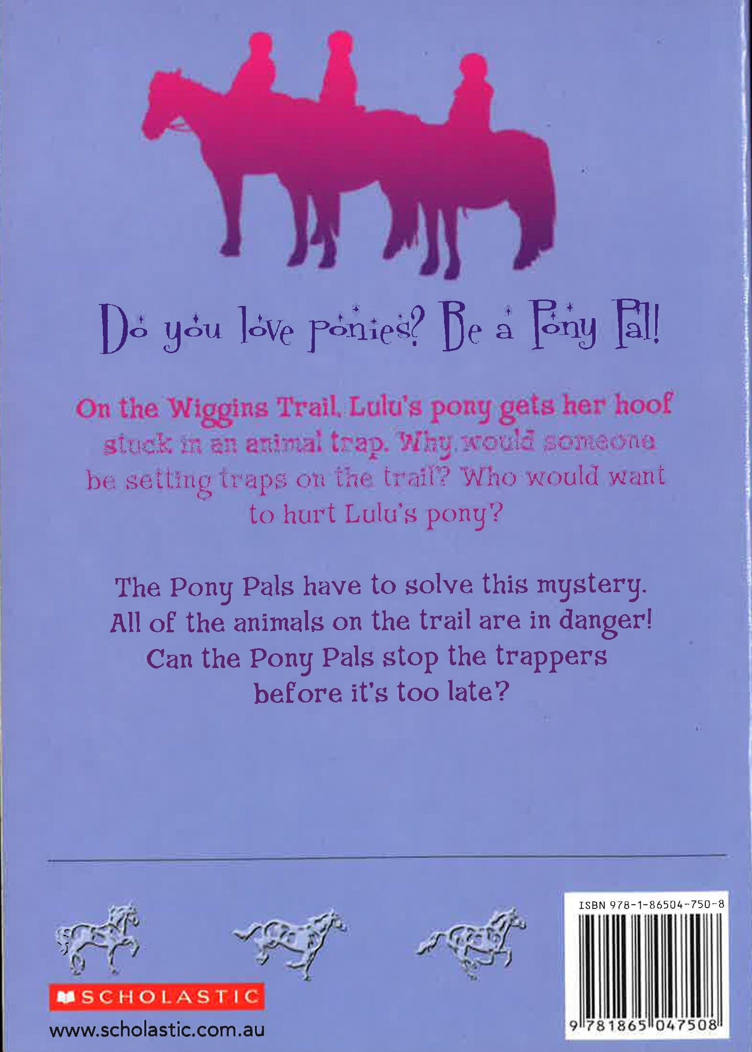 The Pony Pals are trail-riding on the Wiggins Estate when Snow White steps into a trap. Who is setting animal traps on the Wiggins’s private property? Can the Pony Pals stop the trappers before a pony is hurt?