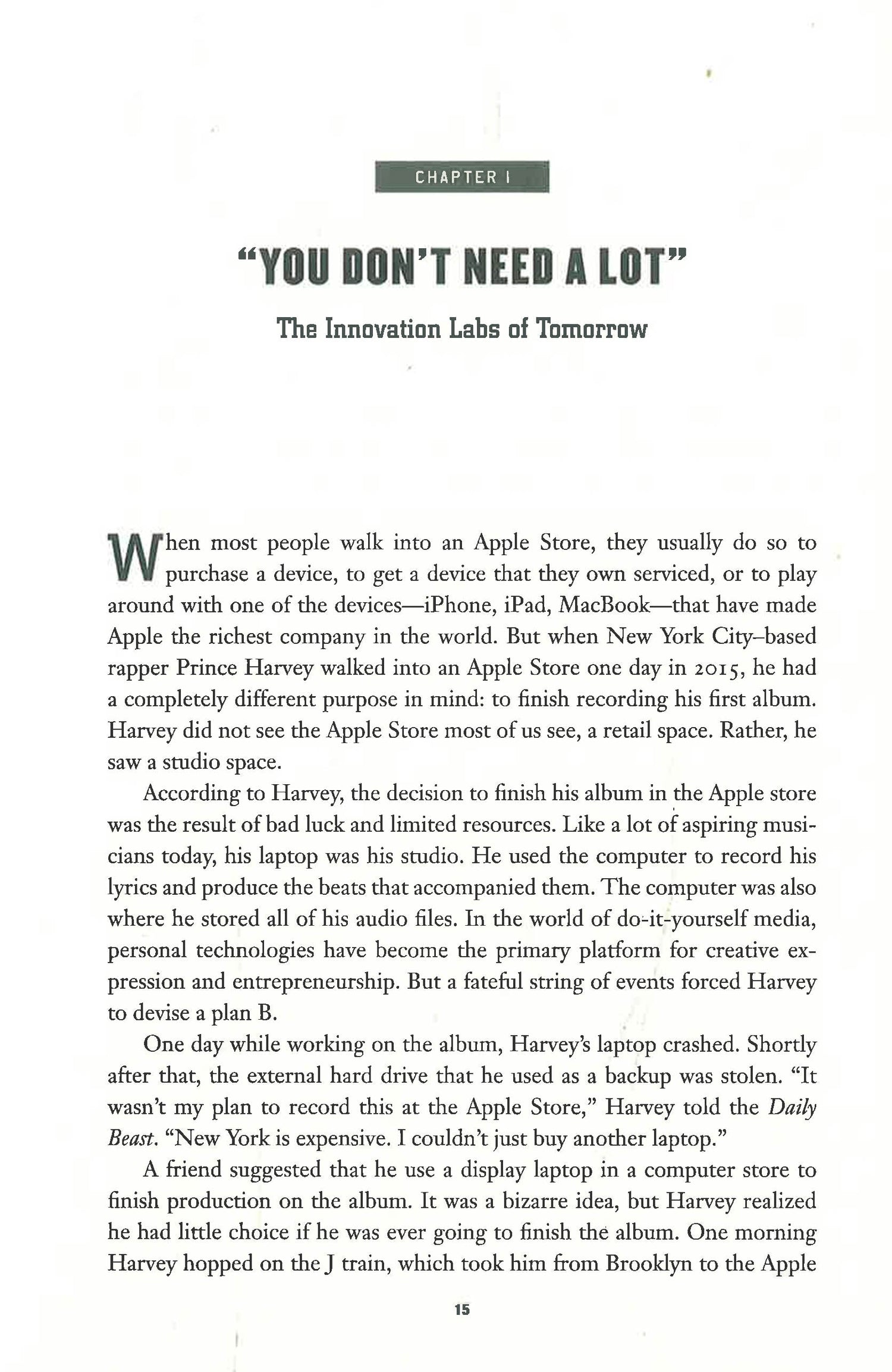 We meet people like Prince Harvey, a New York-based hip-hop artist who recorded his album entirely on an Apple showroom laptop; screenwriter, producer, and actor Issa Rae, who first used YouTube and Kickstarter to develop the web series that became her hit HBO show Insecure; the Empowerment Plan, a nonprofit organization created by product design student Veronika Scott in Detroit; and start-up companies like Qeyno Group in San Francisco and Juegos Rancheros in Austin that help make tech more accessible to people of color.
