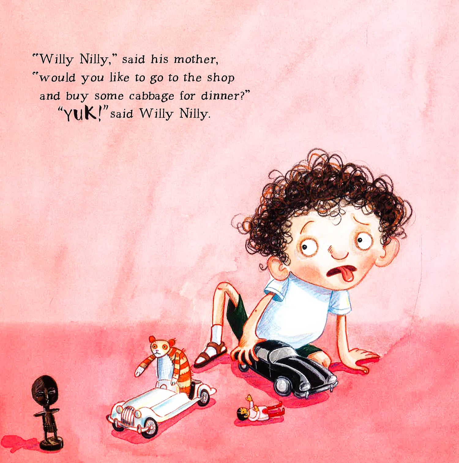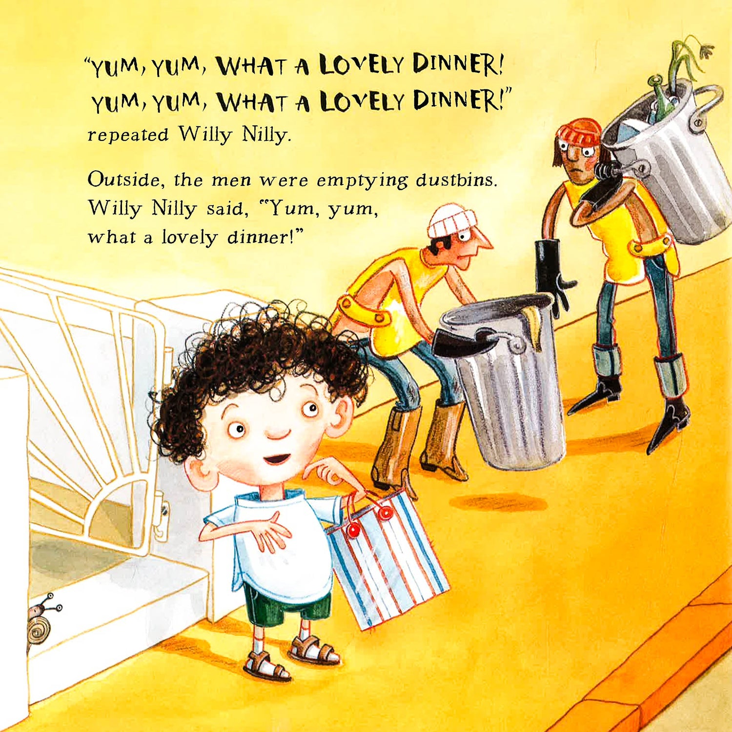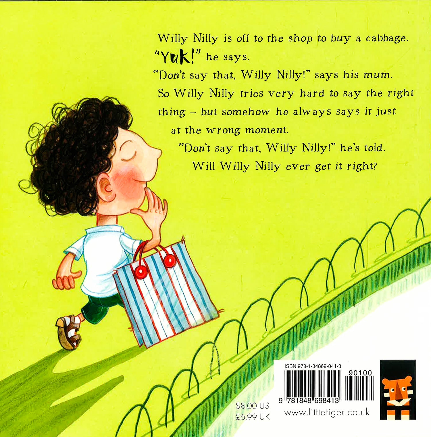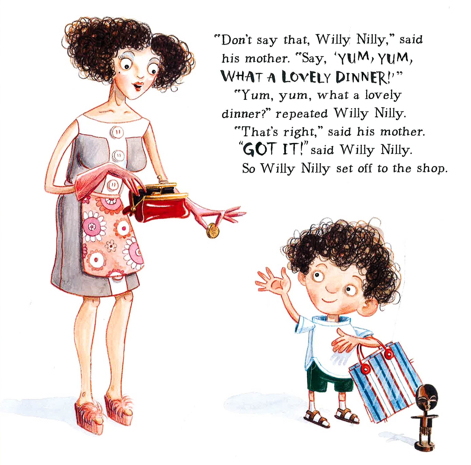 Willy Nilly is no Epaminondas in this cartoonish, contemporary version of the old classic. When Willy Nilly’s mom sends him to buy cabbage for dinner, he says, “YUK!” She retorts, “No, you must say YUM, YUM, WHAT A LOVELY DINNER.” On his way to the store, Willy Nilly says exactly that to the garbage man who advises him to say “GOOD RIDDANCE TO BAD GARBAGE,” which Willy Nilly then repeats to the neighbors moving away. Willy Nilly proceeds to misapply the comment from each person he meets to the next one; the park keeper, a parrot, Granny Macaroon, a window cleaner and finally to a baby reaching for a tower of cans in the grocery: “HEY, LOOK OUT!” bringing things full circle. Each time Willy Nilly is admonished and given a new reply, he says, “GOT IT!” in large type like the responses. Colorful, exaggerated illustrations play up the absurdity, especially the white marble-eyed people and Willy Nilly with cauliflower ears and large head in his shorts, socks and sandals. This modern spin lacks the charm of previous versions, making this moderately silly variation only for those who haven’t heard the original.