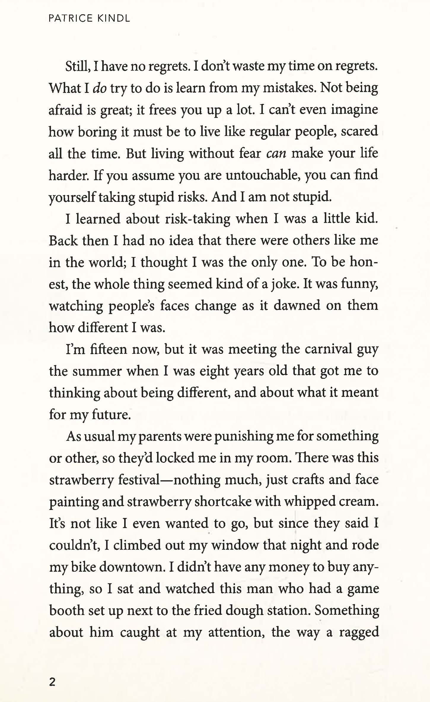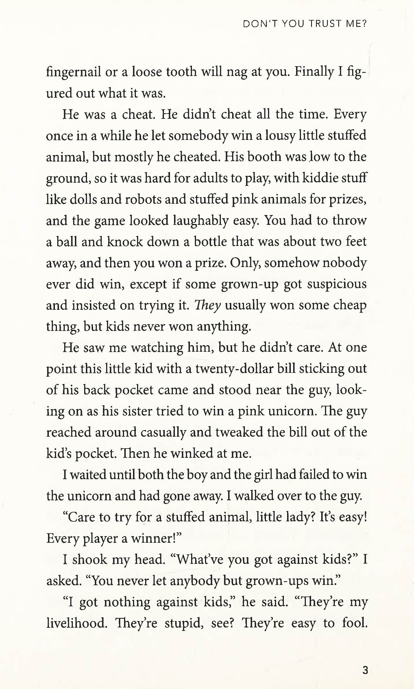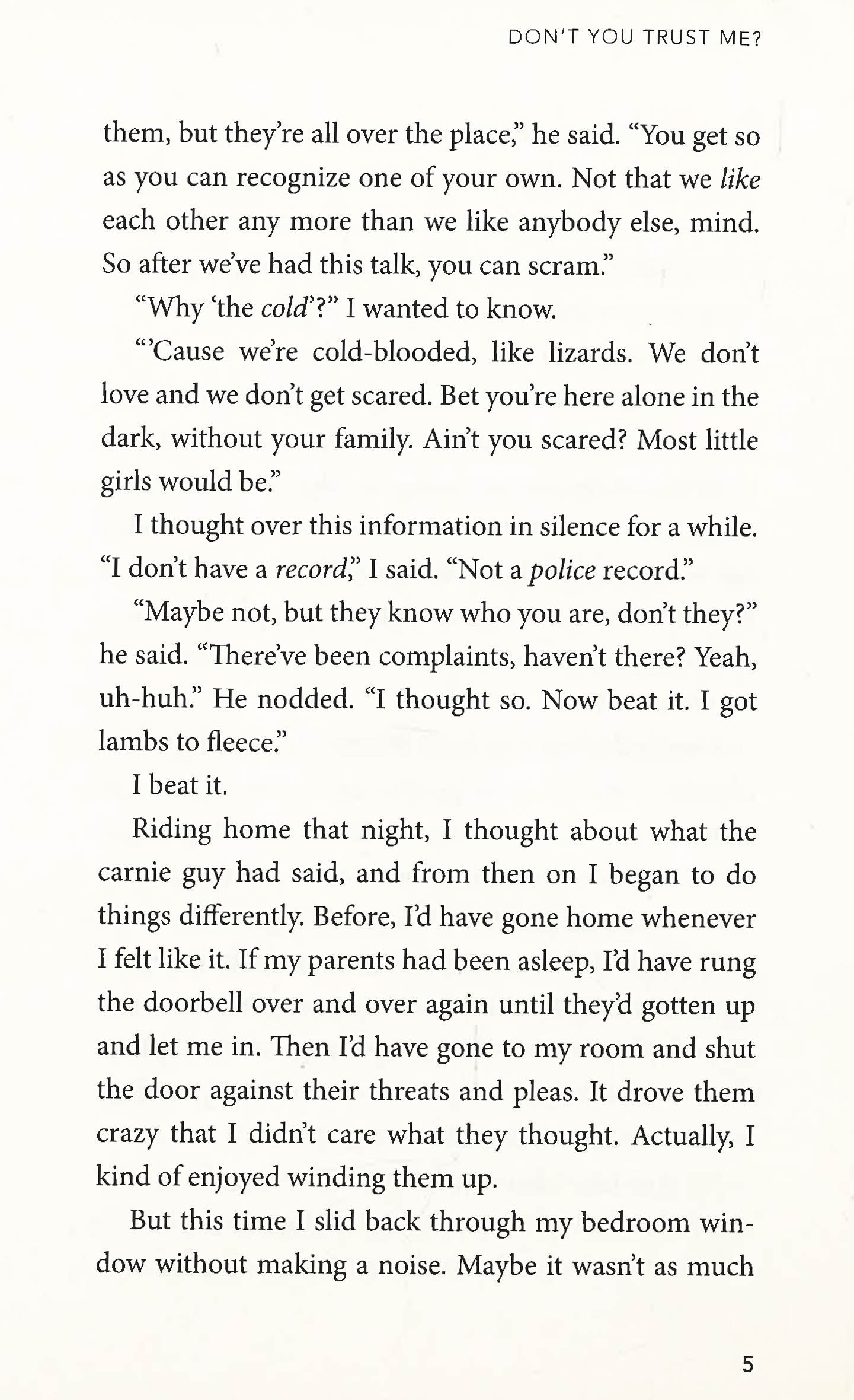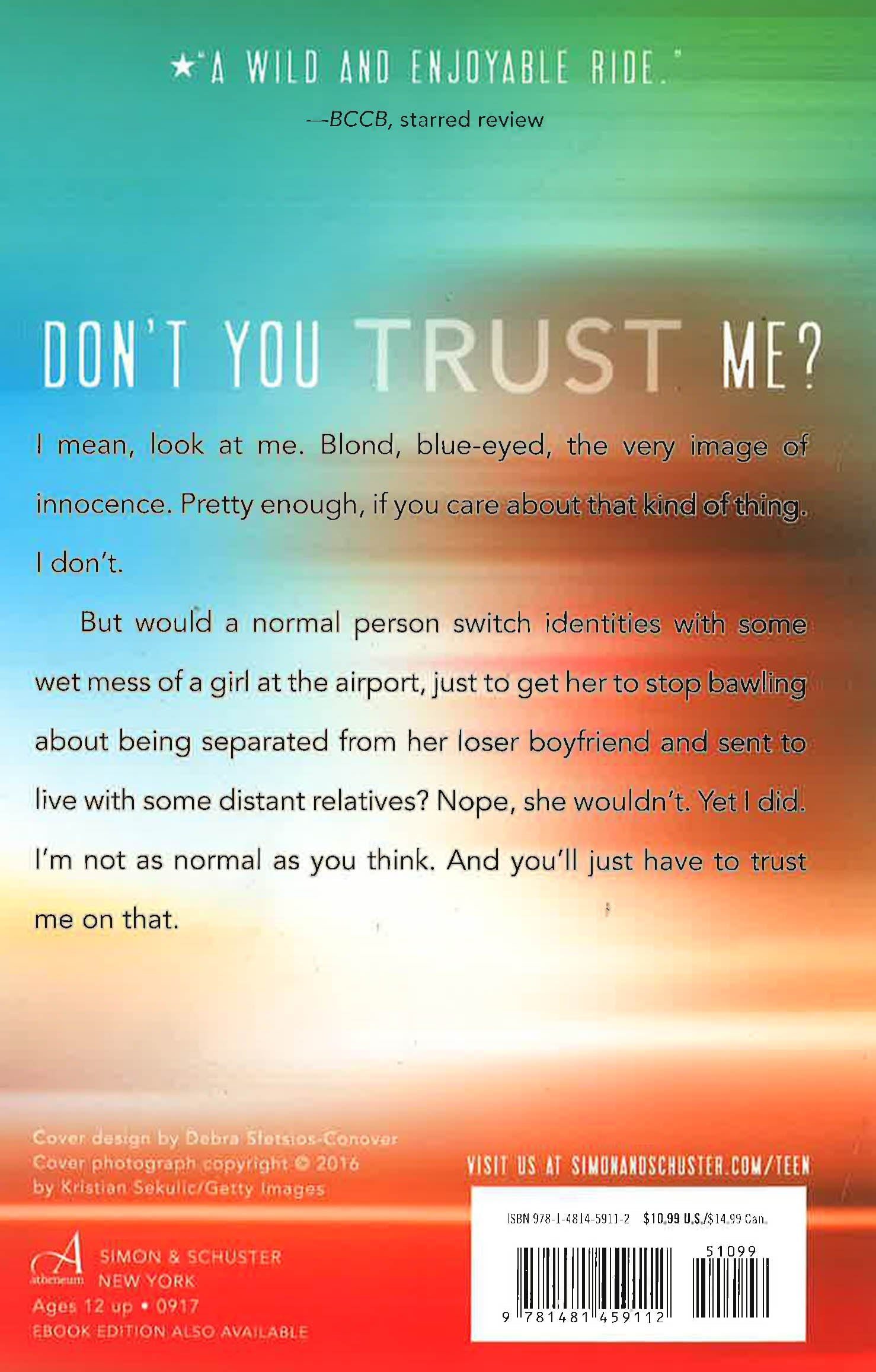 Don?t you trust me? I mean, look at me. Blond, blue-eyed, the very image of innocence. Pretty enough, if you care about that kind of thing. I don?t.But would a normal person switch identities with some wet mess of a girl at the airport, just to get her to stop bawling about being separated from her loser boyfriend and sent to live with some distant relatives? Nope, she wouldn?t. Yet I did. I?m not as normal as you think. And you?ll just have to trust me on that.