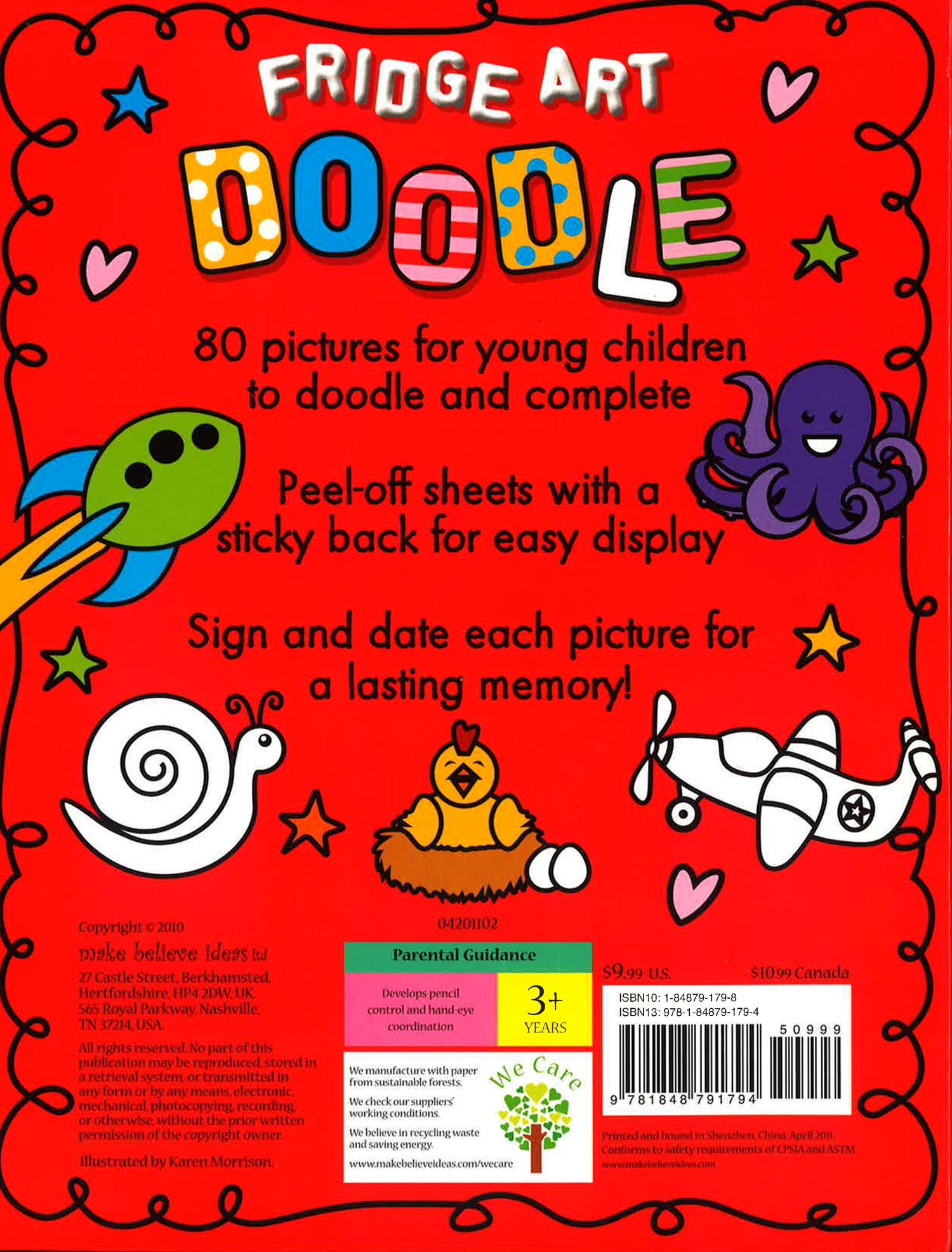 Fridge Art: Doodle is packed full of fun pictures to doodle and complete. Stuck to the inside of the book is a fun and colorful poster pad packed with creative drawing activities. The pad has a sticky edge on the back of each piece of paper, so once children have completed their little masterpiece, they can easily peel it off the pad and stick it on the fridge, wall, or wherever they like. There is also a space on each page for them to sign their work, so that everyone will know who created it!