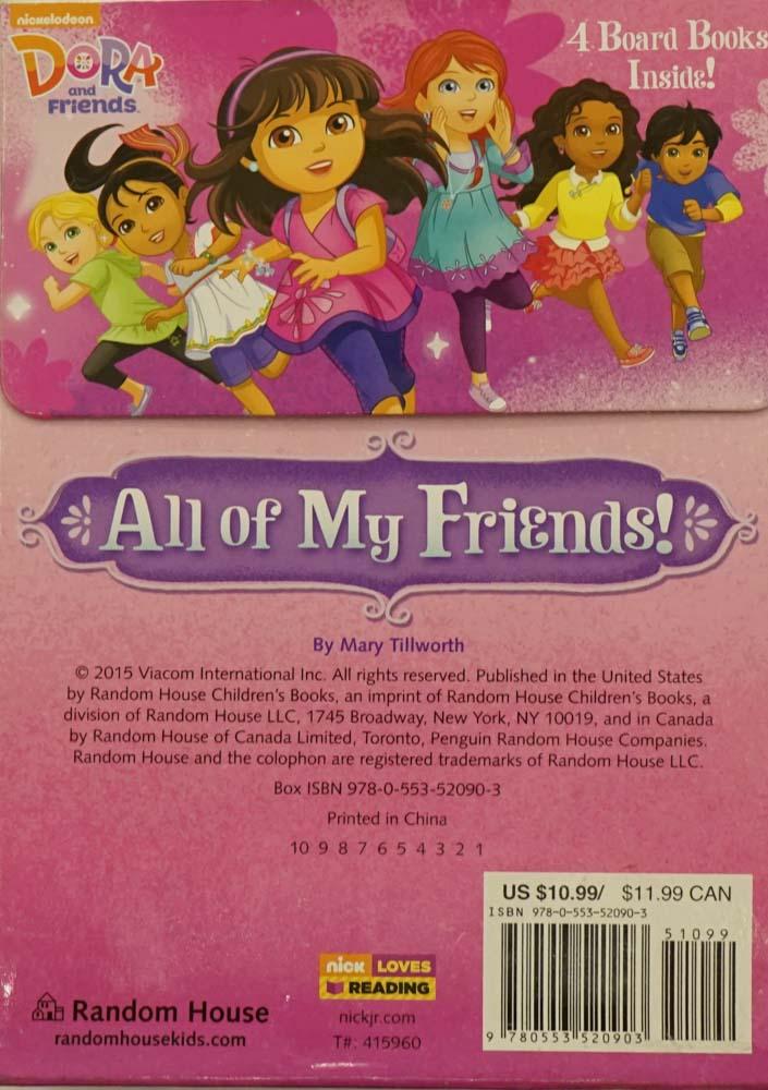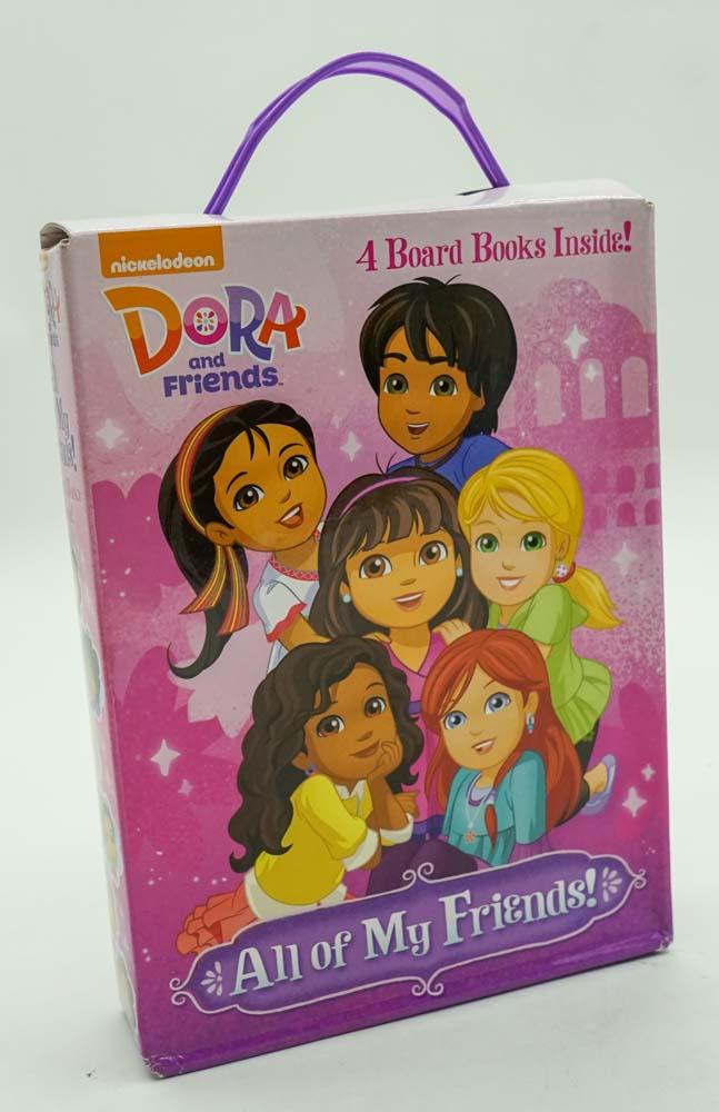 Girls ages 2 to 5 can take the characters from Nickelodeon s "Dora and Friends" along wherever they go! This boxed set of four board books features a sturdy plastic carrying handle.
