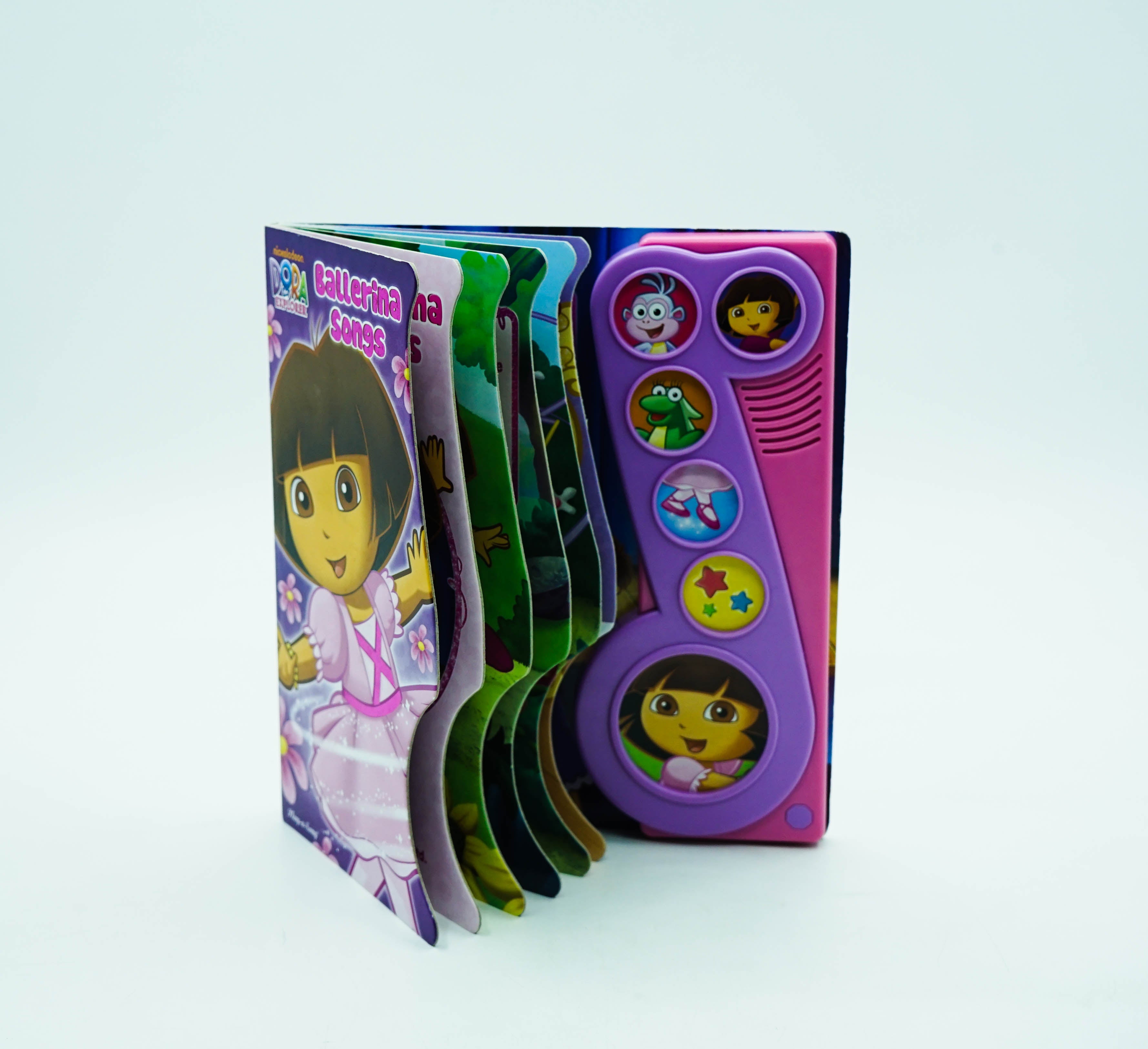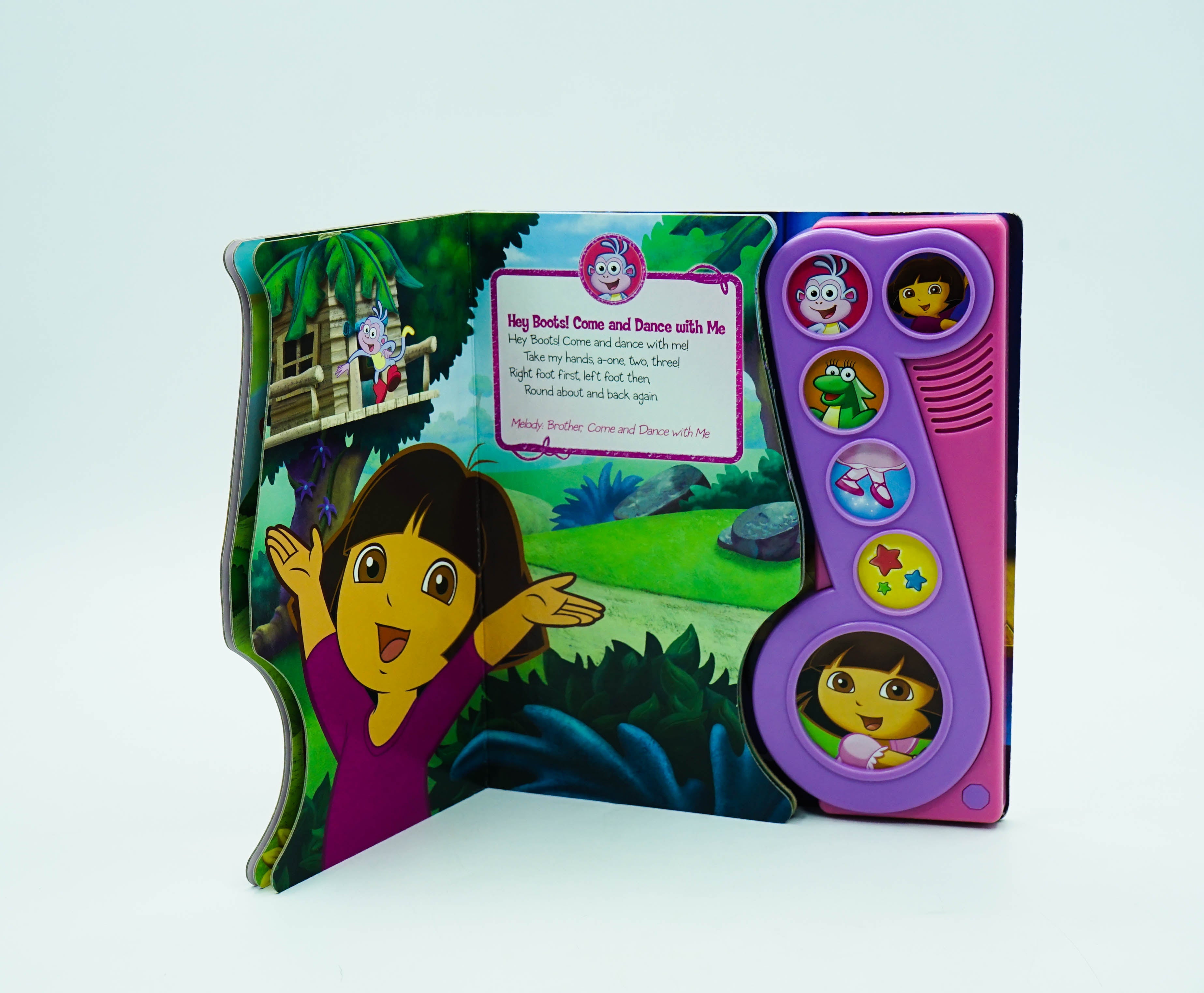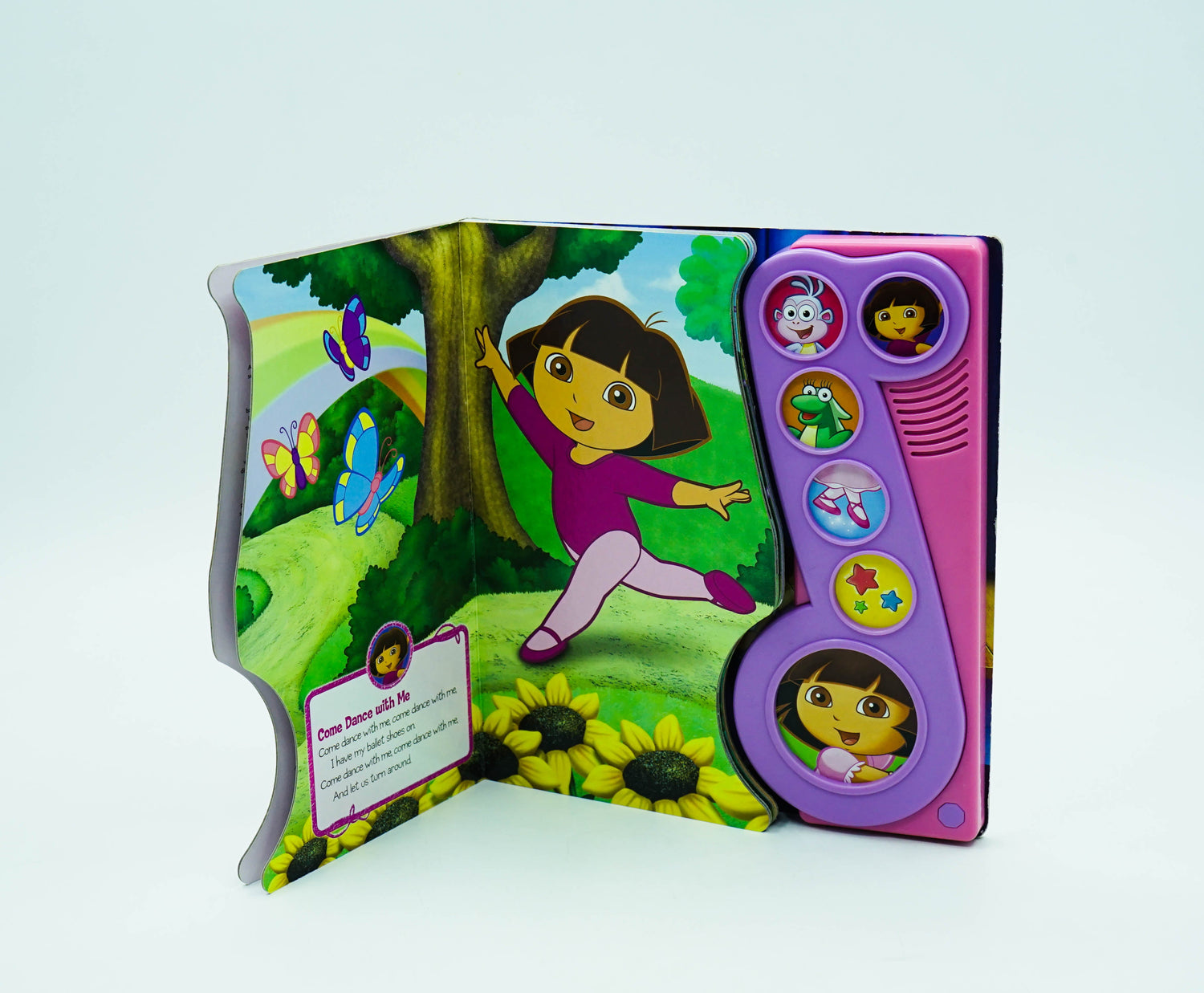 Dora the Explorer Ballerina Songs is an interactive sound book designed for children ages 3 and older. Illustrated icons on the book s pages match the six buttons on the sound module attached to the book. Children press the buttons to activate lively songs that will make young readers want to dance. Each page features colorful illustrations of Dora the Explorer dancing, plus original lyrics for each of these songs:Come Dance with Me Hey Boots! Come and Dance with Me (melody: Brother, Come and Dance with Me)Dance Around the Roses (melody: Ring Around the Rosie)One, Two, Pink Ballet Shoes (melody: One, Two, Buckle My Shoe)Beautiful Dancer (melody: Beautiful Dreamer)If You re Happy and You Know ItDora the Explorer Ballerina Songs conforms to the toy safety requirements of ASTM F963-08. Three replaceable long-life AG-13 button cell batteries that power the sound module are included.