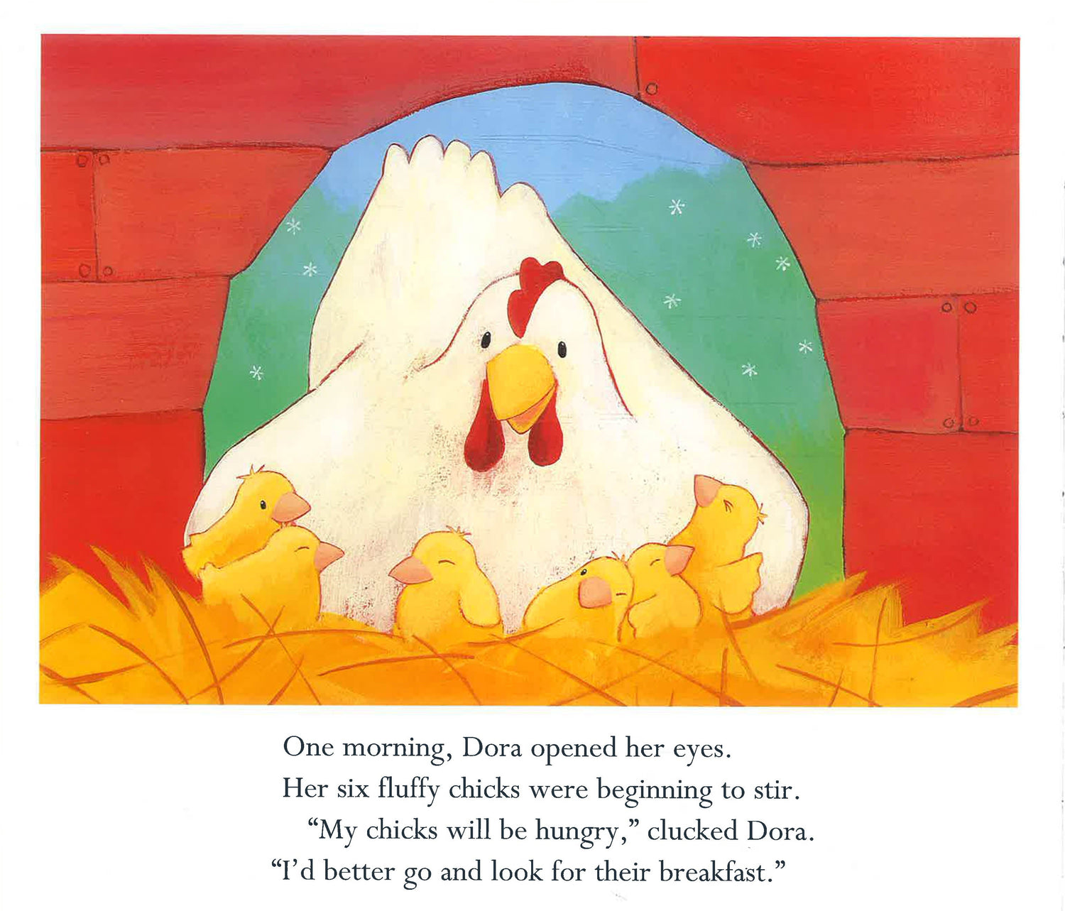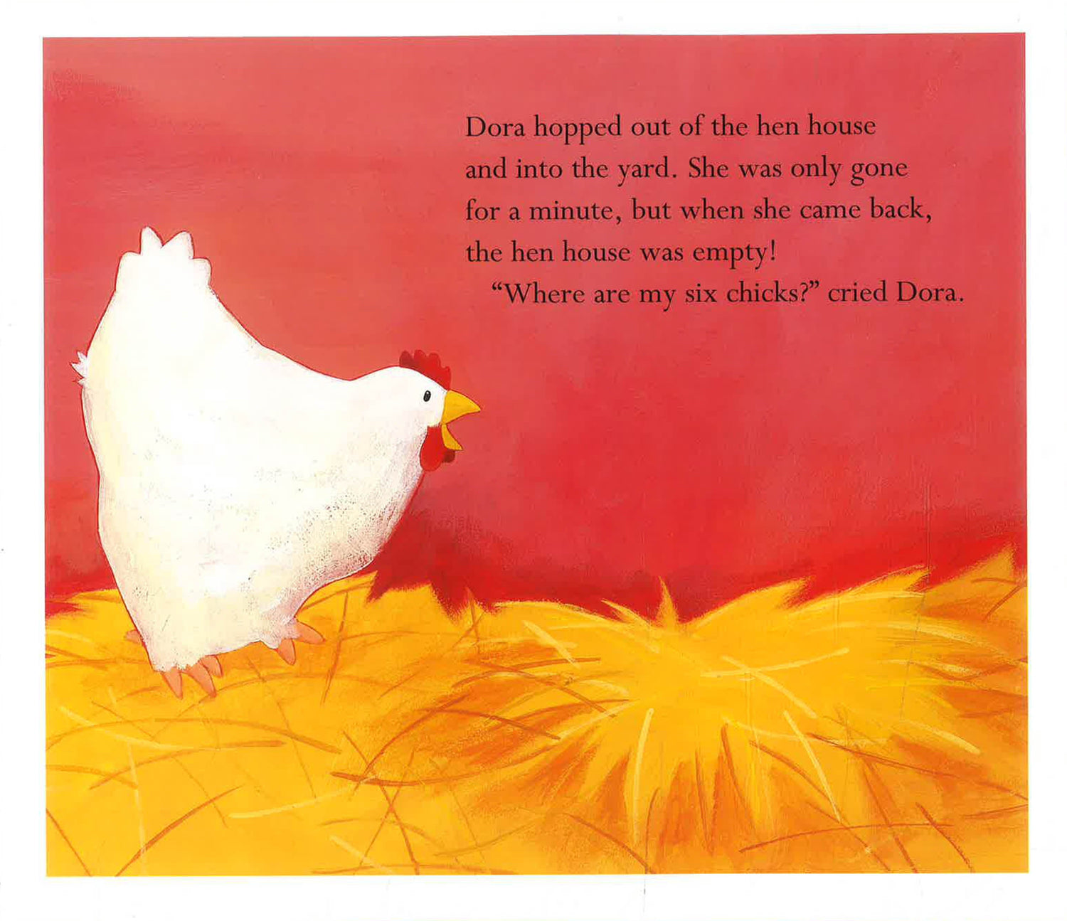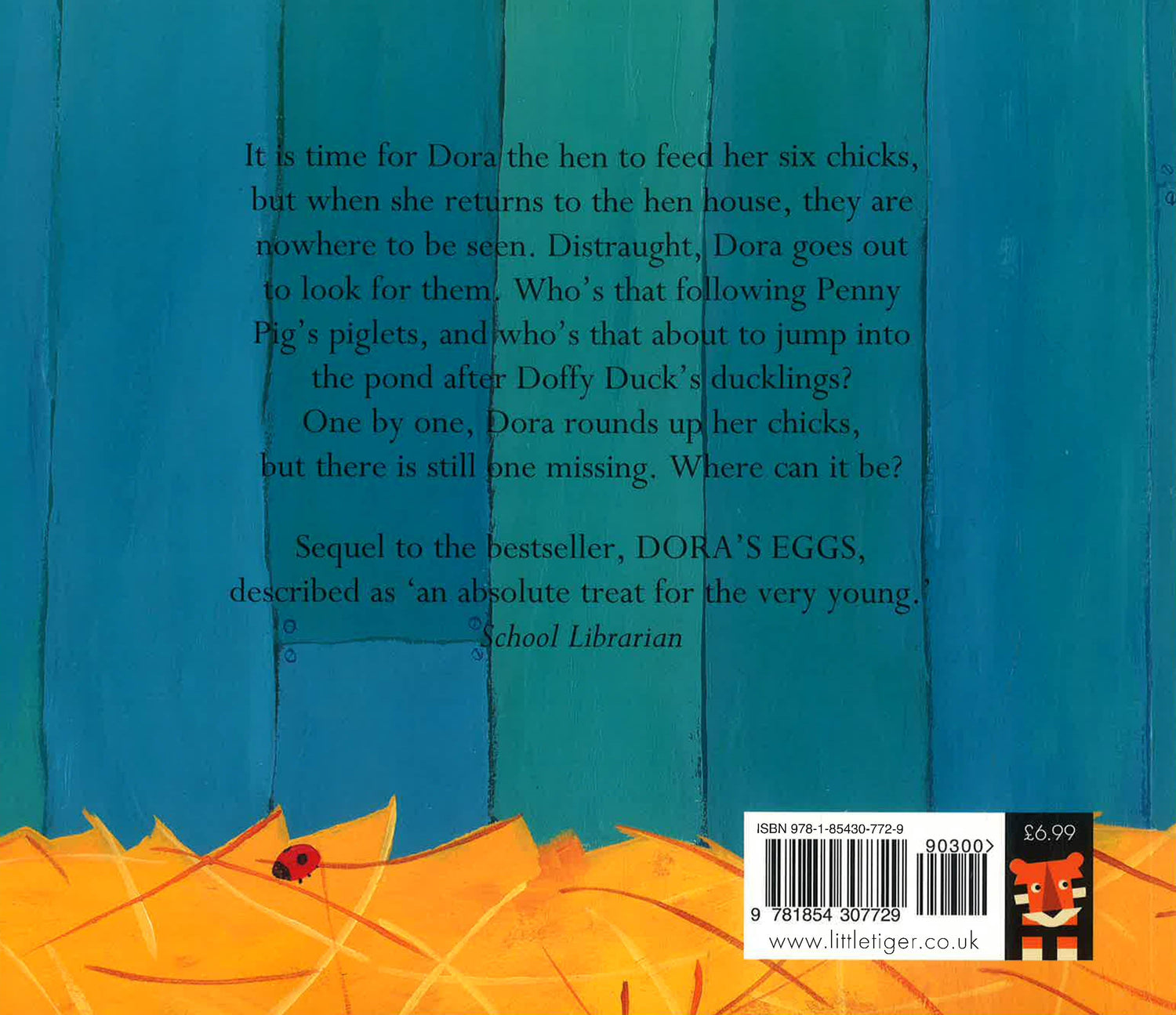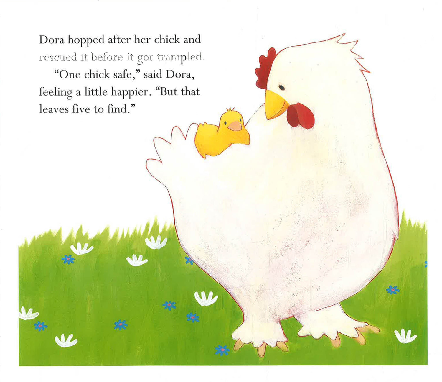 It is time for Dora the hen to feed her six chicks, but they are nowhere to be seen. Who's that following Penny Pig's piglets, and who's that about to jump into the pond after Doffy Duck's ducklings? One by one, Dora rounds up her chicks, but there is still one missing. Where can it be?