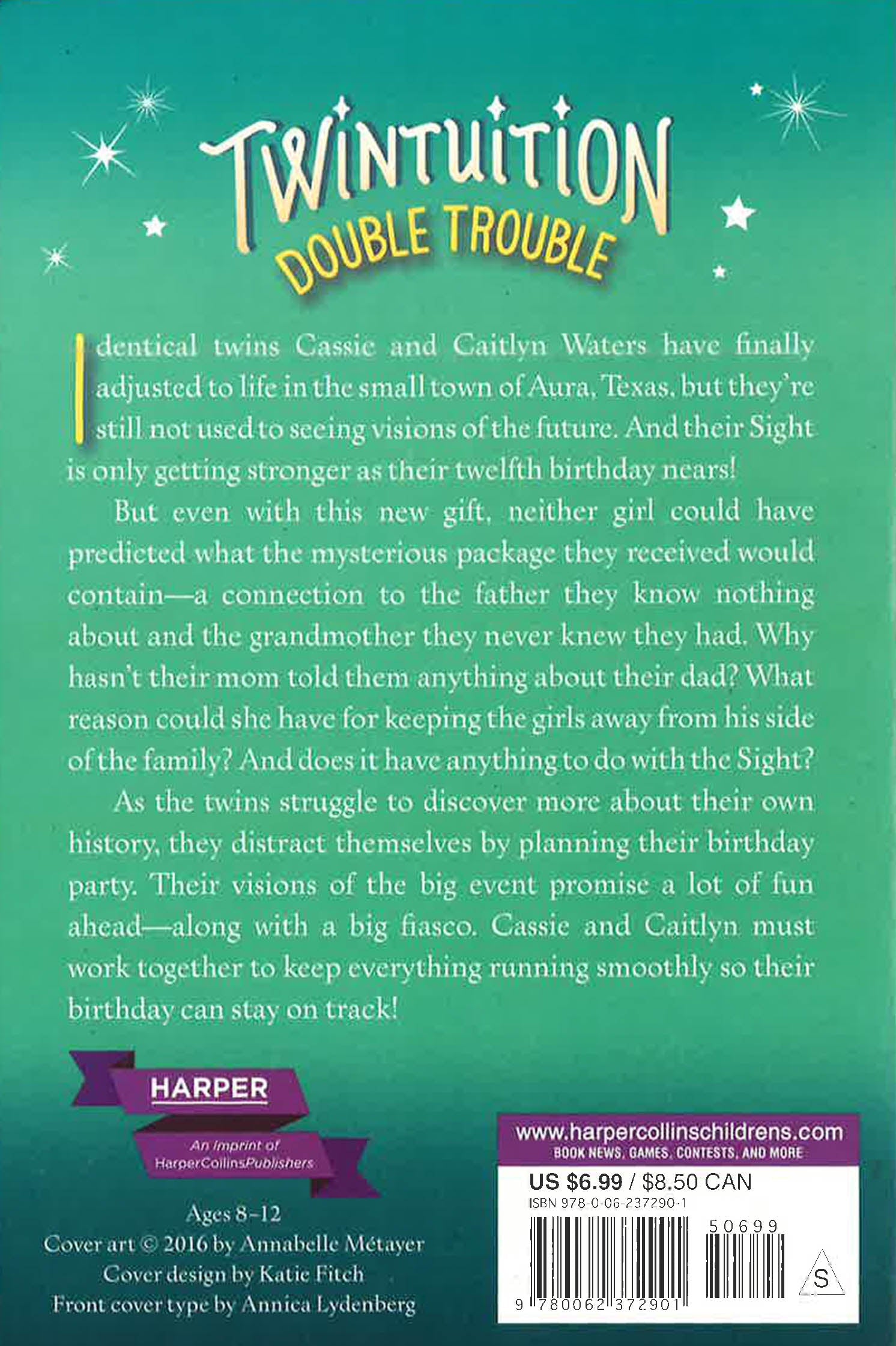 From actresses Tia and Tamera Mowry comes Double Trouble, the second book in their Twintuition series about the super-special - and sometimes supernatural - bond between sisters!Identical twins Cassie and Caitlyn Waters have adjusted to small-town life, but they’re still not used to seeing visions of the future. When a troubling and mysterious package arrives with a connection to the father they’ve never known and the grandmother they never knew they had, the twins distract themselves by planning a birthday bash with their new friends. But when the visions of the upcoming party show it will be more of a catastrophe than a celebration, the girls have to work together to keep it fiasco-free.