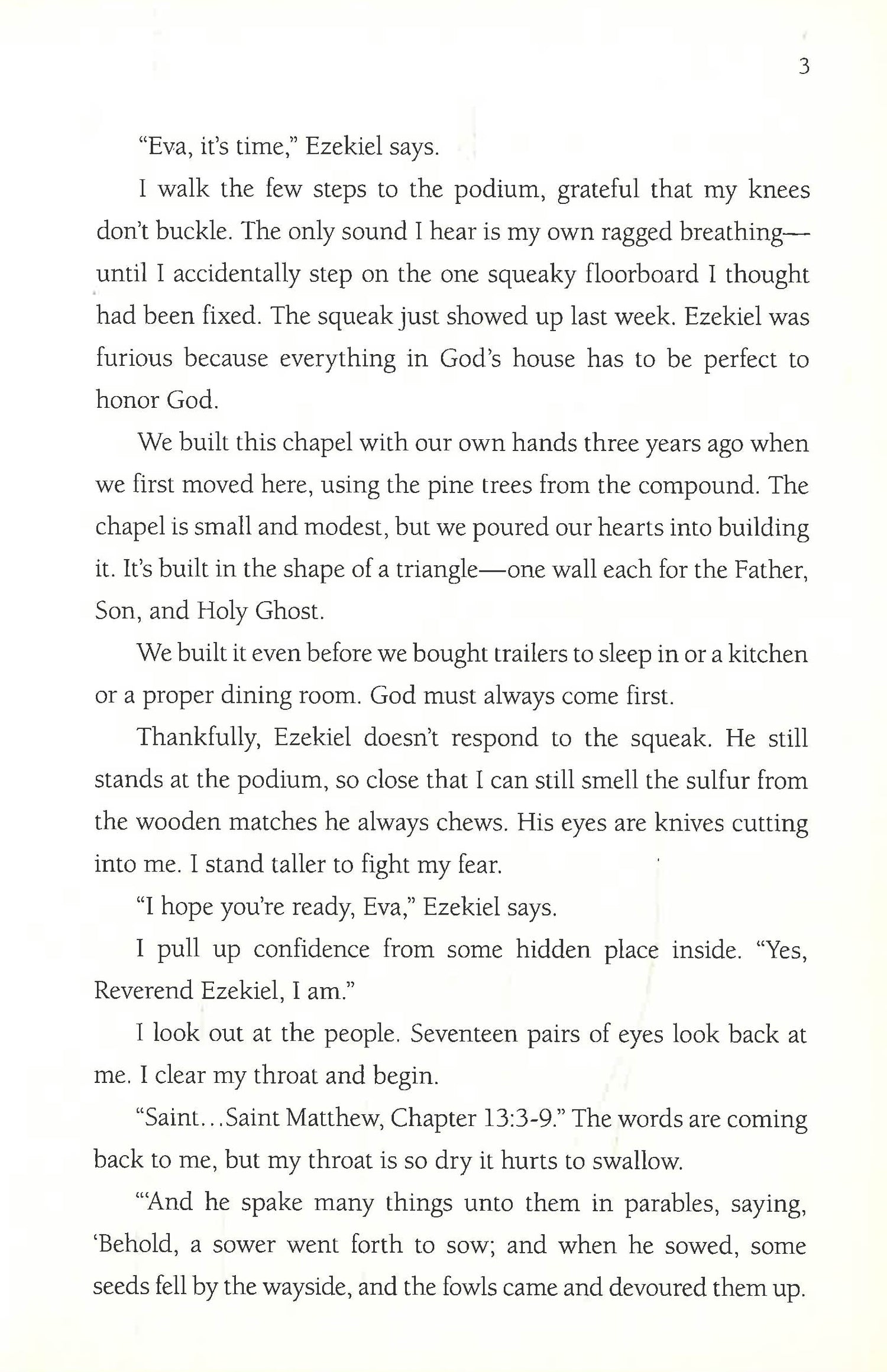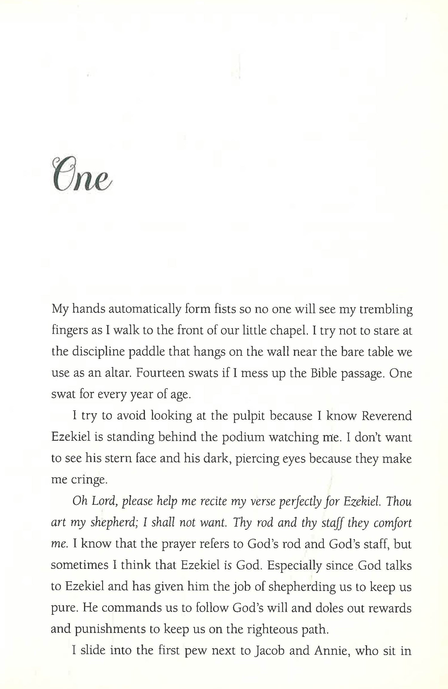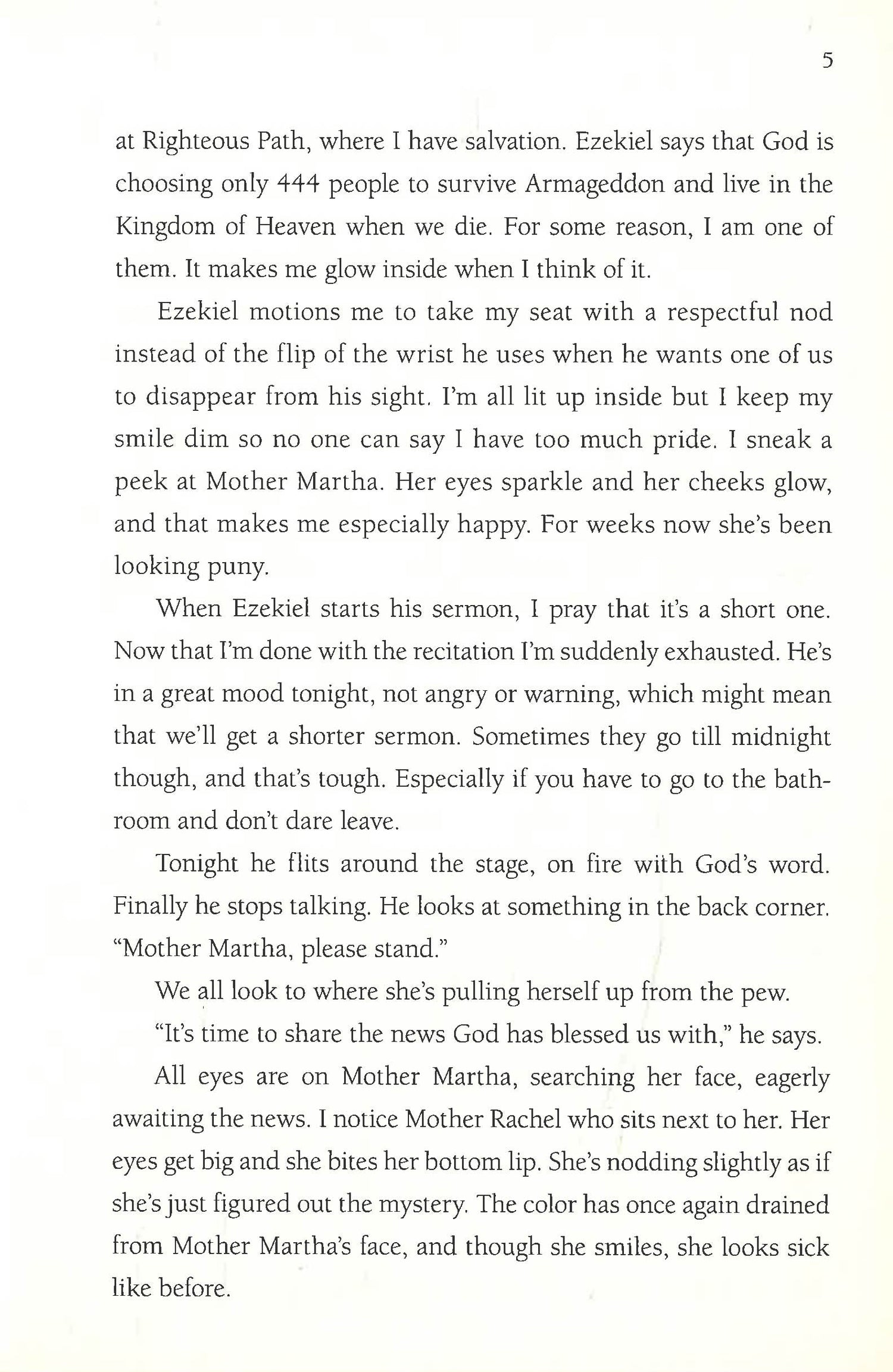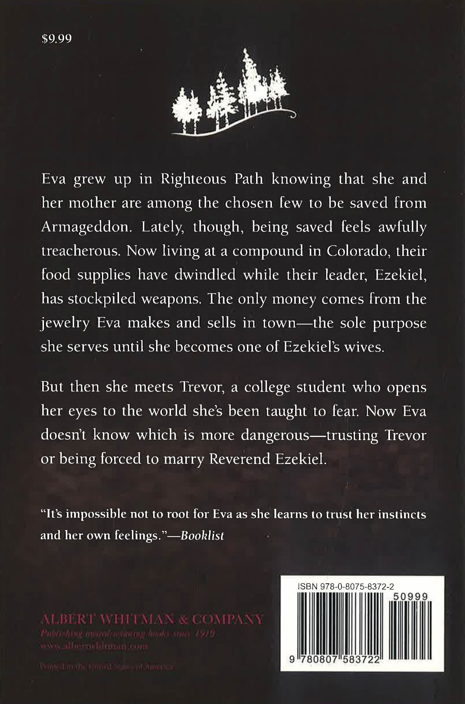 Eva wants to be a good disciple of Righteous Path. She grew up knowing that she's among the chosen few to be saved from Armageddon. Lately, though, being saved feels awfully treacherous. Ever since they moved to the compound in Colorado, their food supplies have dwindled while their leader, Ezekiel, has stockpiled weapons. The only money comes from the jewelry Eva makes and sells in town--a purpose she'll serve until she becomes one of Ezekiel's wives. But a college student named Trevor and the other "heathens" she meets on her trips beyond the compound are far different from what she's been led to believe. Now Eva doesn't know which is more dangerous--the outside world or Reverend Ezekiel's plans.