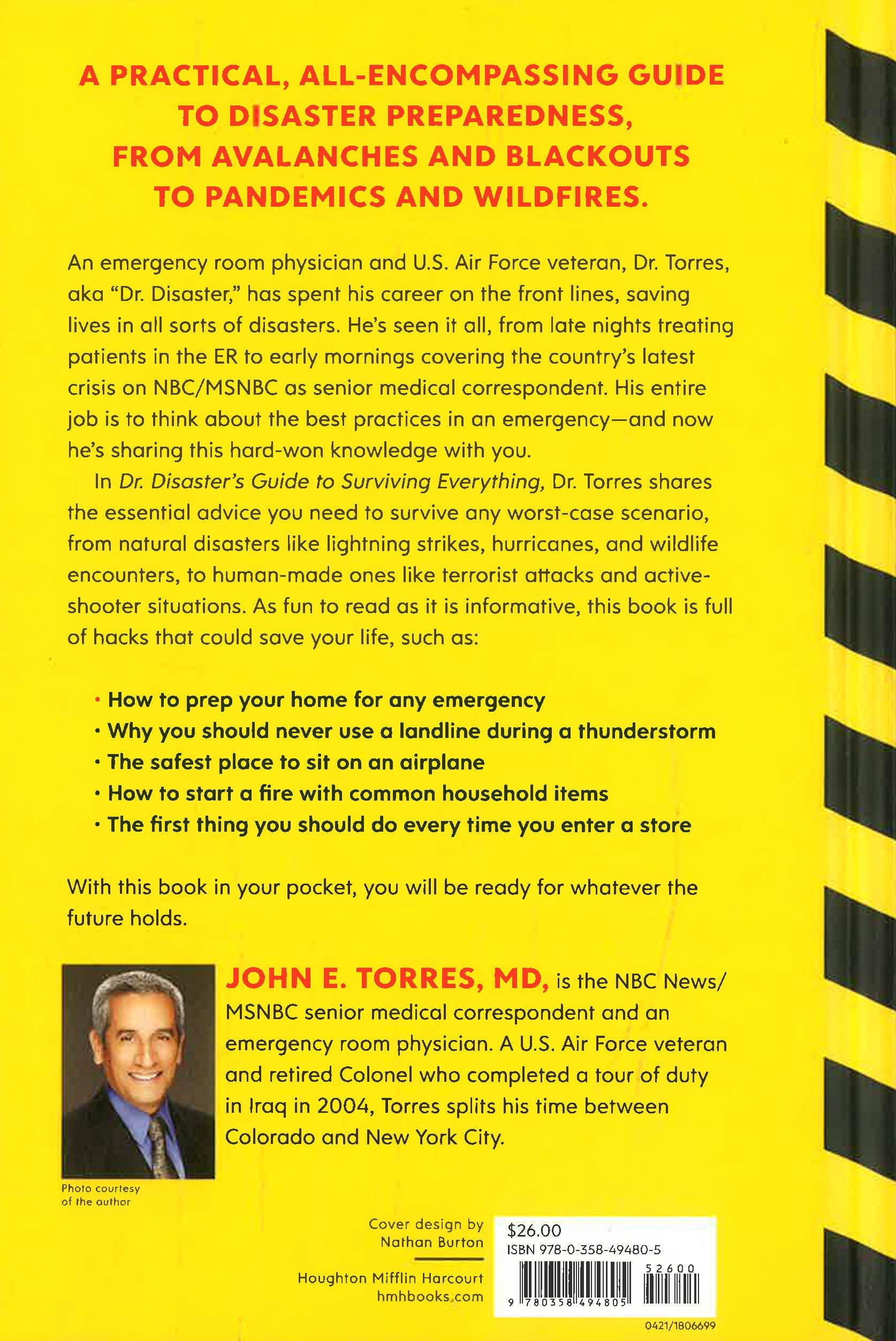 An emergency room physician and U.S. Air Force veteran, Dr. Torres, aka “Dr. Disaster,” has spent his career on the front lines, saving lives in all sorts of disasters. He’s seen it all, from late nights treating patients in the ER to early mornings covering the country’s latest crisis on NBC/MSNBC as senior medical correspondent. His entire job is to think about the best practices in an emergency—and now he’s sharing this hard-won knowledge with you.