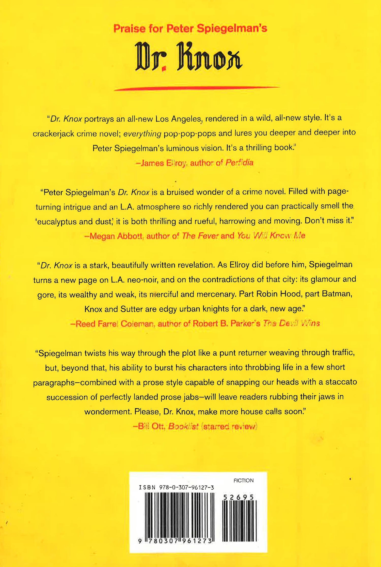 "Peter Spiegelman's Dr. Knox is a bruised wonder of a crime novel. Filled with page-turning intrigue and an L.A. atmosphere so richly rendered you can practically smell the 'eucalyptus and dust, ' it is both thrilling and rueful, harrowing and moving. DON'T MISS IT"