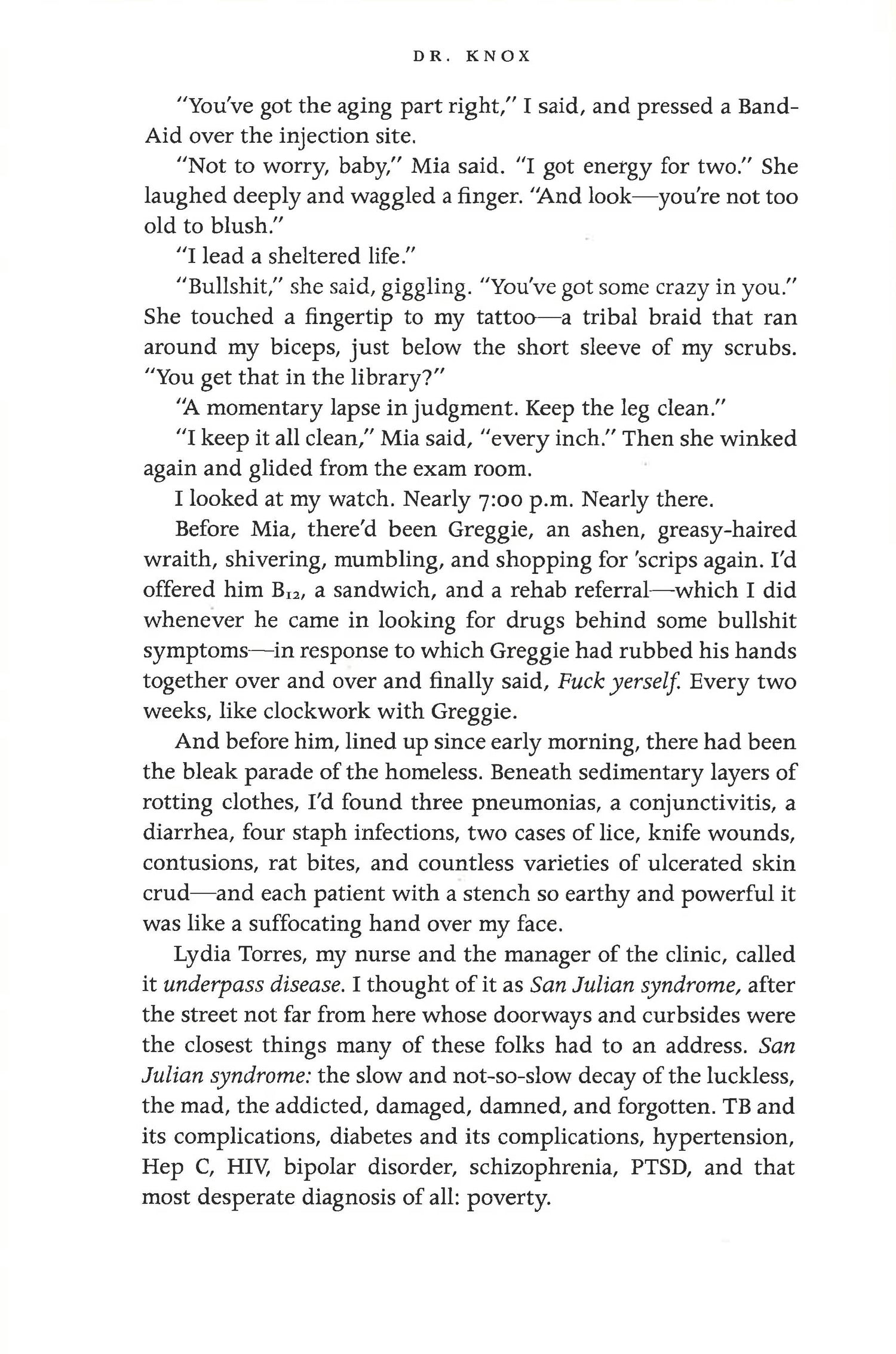 From the author of Red Cat and Thick as Thieves: a gripping new thriller about a medical doctor with a powerful humanitarian impulse, an unhealthy appetite for risk, and a knack for finding himself between a rock and a hard place. Adam Knox comes from a long line of patrician Connecticut doctors--a line he broke to serve with an NGO in the war-torn Central African Republic. His attempt to protect his patients there from a brutal militia ended in disaster and disgrace, and now he runs a clinic near Los Angeles's Skid Row, making ends meet by making house calls--cash only, no questions asked--on those too famous or too criminal to seek other medical care. When a young boy is abandoned at his clinic, Knox is determined to find the boy's family and save him from the not-so-tender mercies of the child welfare bureaucracy. But Knox's search for the volatile woman who may or may not be the boy's mother leads him and his friend, a former Special Forces operator, into a labyrinth of human traffickers, Russian mobsters, and corporate security thugs; and squarely into the sights of a powerful, secretive, and utterly ruthless family that threatens to destroy Dr. Knox and everything--and everyone--he holds dear.