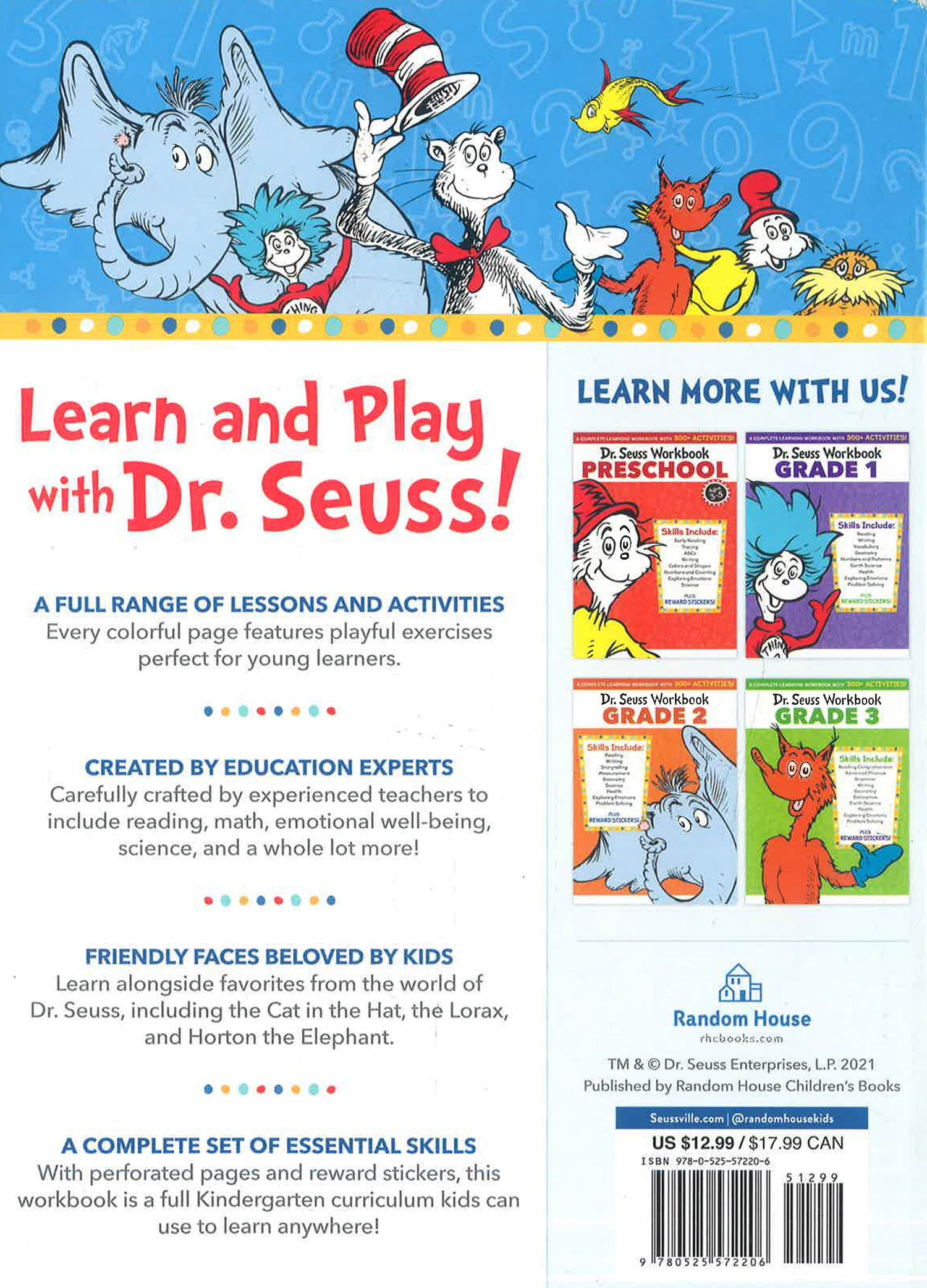 Learn and play with Dr. Seuss in this ultimate Kindergarten workbook, with over 300 curriculum-based activities ranging from letters, numbers, social emotional learning, to science!