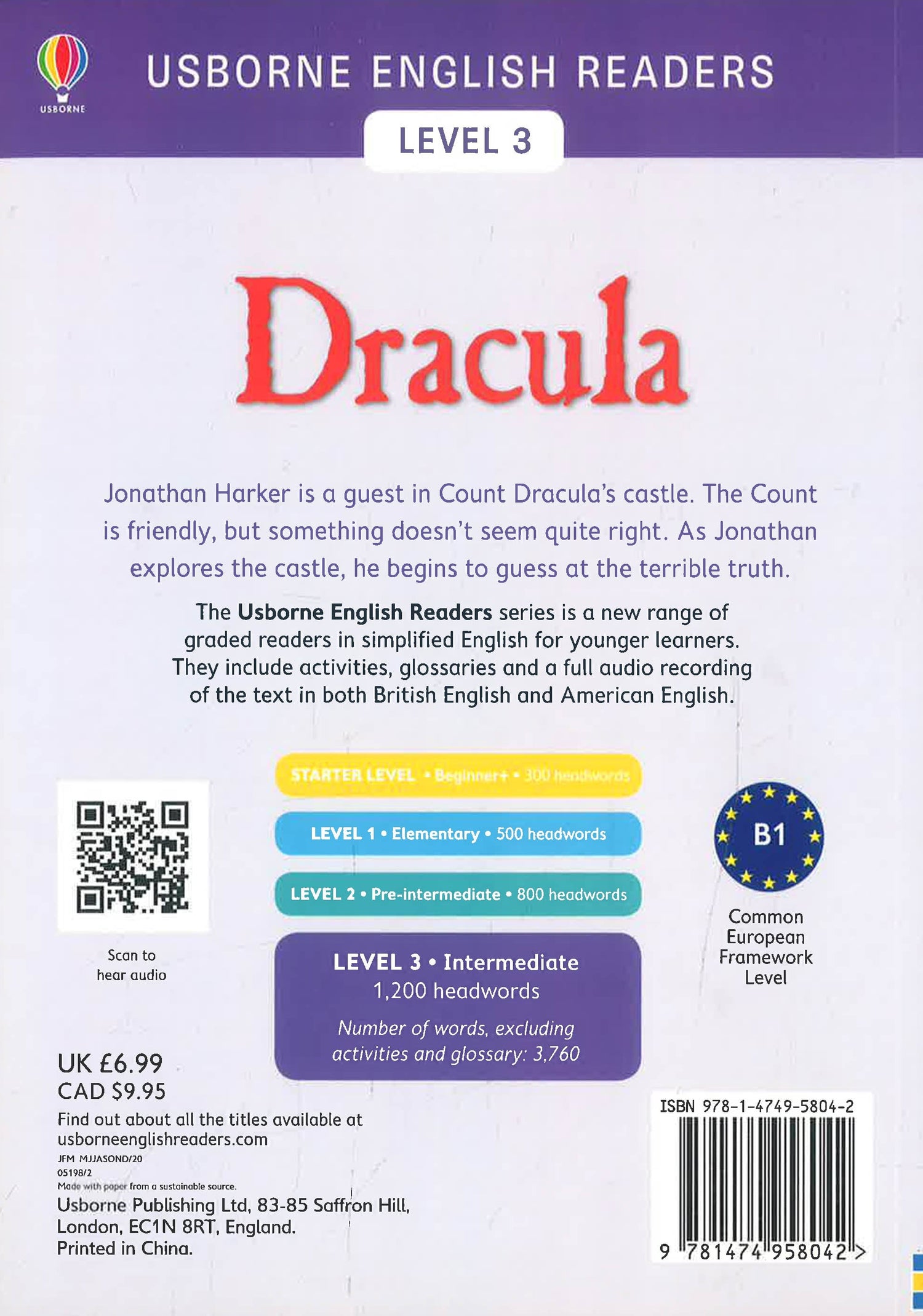 Jonathan Harker is a guest in Cout Dracula's castle. The Count is friendly, but something doesn't seem quite right, As Jonathan explores the castle, he begins to guess at the terrible truth. Includes a word list, 5 pages of activities and free online audio (British English and American English). 1,200 headwords, 3,760 words