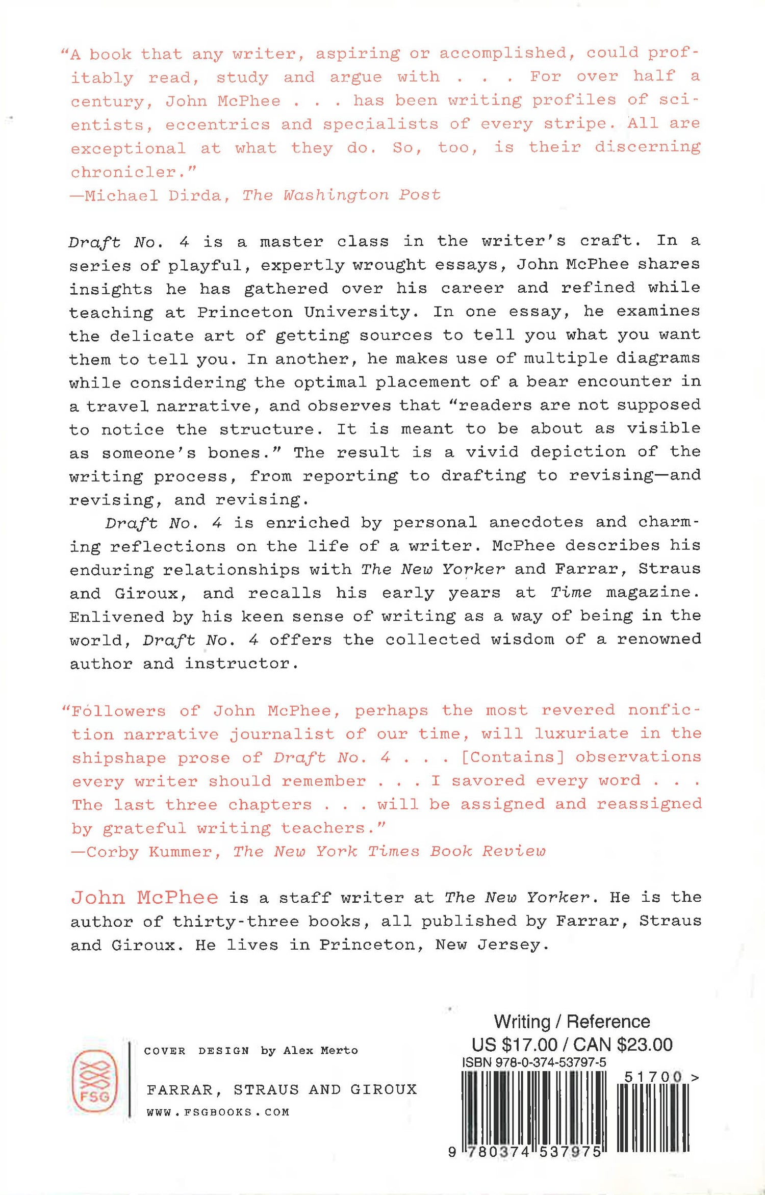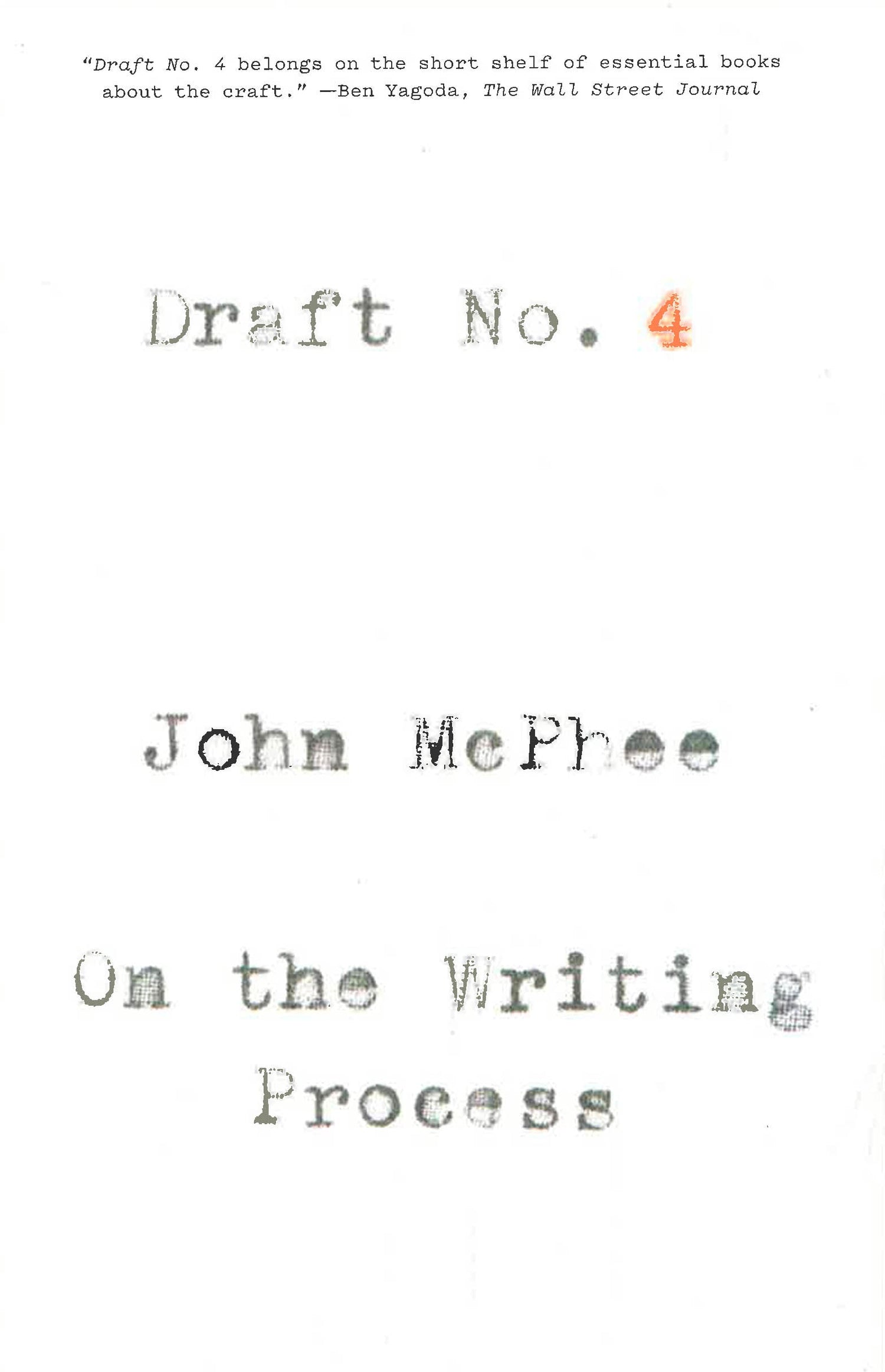 Draft No. 4 is a master class on the writer’s craft. In a series of playful, expertly wrought essays, John McPhee shares insights he has gathered over his career and has refined while teaching at Princeton University, where he has nurtured some of the most esteemed writers of recent decades. McPhee offers definitive guidance in the decisions regarding arrangement, diction, and tone that shape non fiction pieces, and he presents extracts from his work, subjecting them to wry scrutiny. In one essay, he considers the delicate art of getting sources to tell you what they might not otherwise reveal. In another, he discusses how to use flashback to place a bear encounter in a travel narrative while observing that “readers are not supposed to notice the structure. It is meant to be about as visible as someone’s bones.” The result is a vivid depiction of the writing process, from reporting to drafting to revising - and revising, and revising. Draft No. 4 is enriched by multiple diagrams and by personal anecdotes and charming reflections on the life of a writer. McPhee describes his enduring relationships with The New Yorker and Farrar, Straus and Giroux, and recalls his early years at Time magazine. Throughout, Draft No. 4 is enlivened by his keen sense of writing as a way of being in the world.