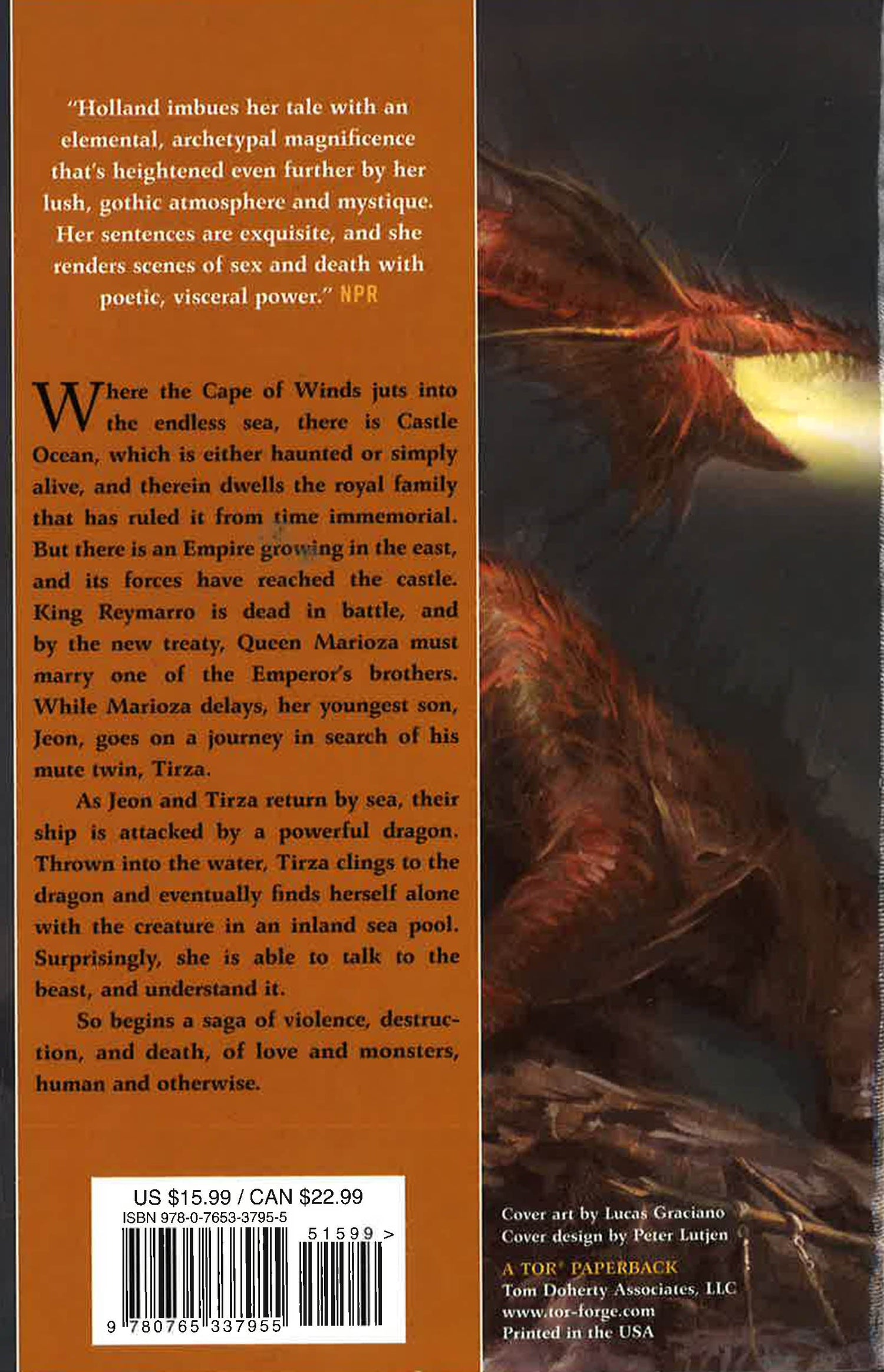 America's most distinguished historical novelist steps fully into the realm of fantasy and makes it her own.Where the Cape of Winds juts into the endless sea, there is Castle Ocean, which is either haunted or simply alive. There in dwells the royal family that has ruled from time immemorial. But there is an empire growing in the East, and its forces have reached the castle. King Reymarro is dead in battle and, by the new treaty, Queen Marioza must marry one of the Emperor's brothers. She loathes the idea, and has already killed the first brother. A second arrives, escorted by soldiers. While Marioza delays, her youngest son, Jeon, goes on a journey in search of his mute twin, Tirza, who must be present for the wedding. As Jeon and Tirza return, their ship is attacked by a powerful dragon. Thrown into the water, Tirza clings to the dragon, and finds herself alone with the creature in an inland sea pool. Surprisingly, she is able to talk to the beast, and understand it. So begins a saga of violence, destruction, and death, of love and monsters, human and otherwise.