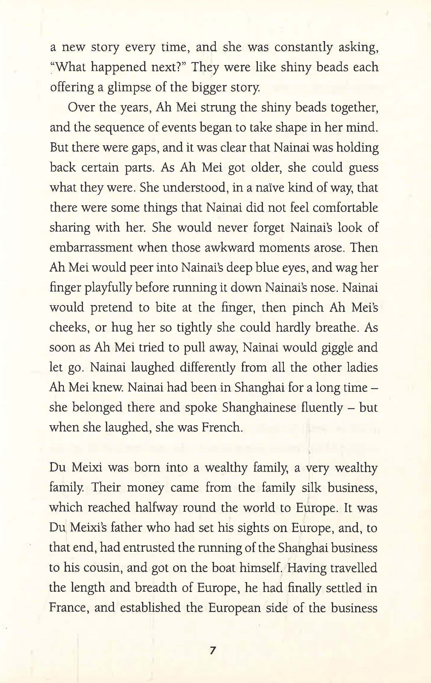 Ah-Mei and her French grandmother, Nainai, share a rare bond. Maybe because Ah-Mei is the only girl grandchild, or maybe because the pair look so alike – and because neither look much like the rest of their Chinese family. Politics and war make 1960s Shanghai a hard place to grow up, especially when racism and bigotry are rife, and everyone is suspicious of Nainai’s European heritage. Ah-Mei and her family suffer much in this time of political upheaval, and when the family silk business falters, they are left with almost nothing. But Ah-Mei and her grandmother are resourceful, and they have one another – and the tenderness they share brings them great strength.