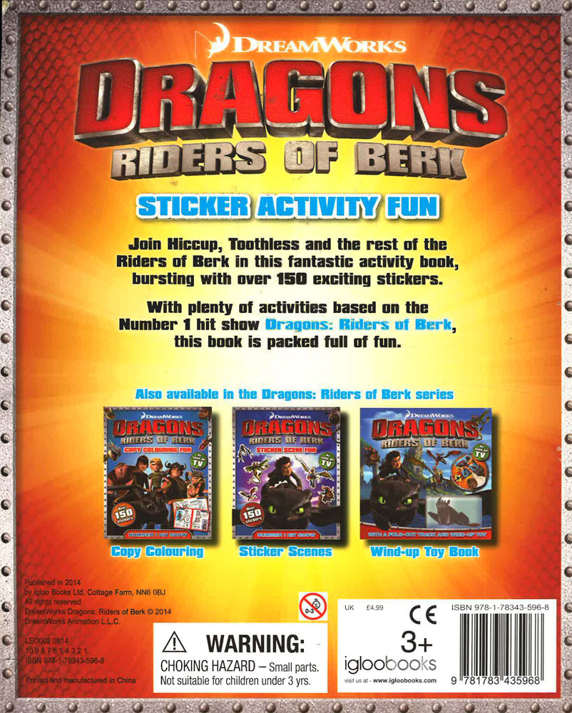 The Dragons brand draws from the two blockbuster How to Train your Dragon movies AND the top-rating TV series already up to it's third season. Fun facts about Dragons:#1 show on ABC 3 with series 2 stripped daily!Supported by a huge range of merchandise for a 365 day presence in retail.Bursting with exciting activities and appealing stickers* Based on the hit TV show, with future series now being locked in* Fun CGI artwork featuring all your most-loved characters* The How To Train Your Dragon Sticker and Activity books are packed full of exciting CGI artwork, based on hit TV episodes and features incredibly engaging activities that will appeal to any child.