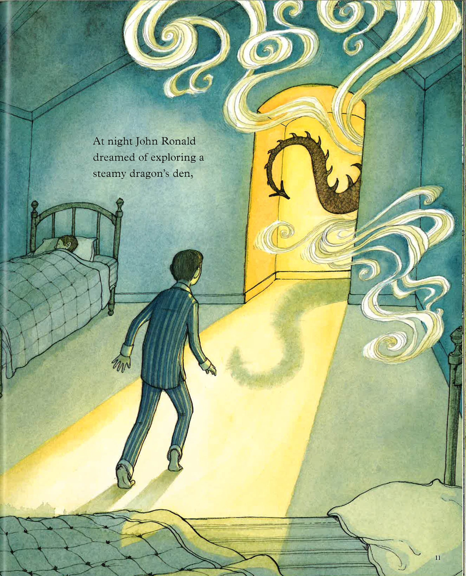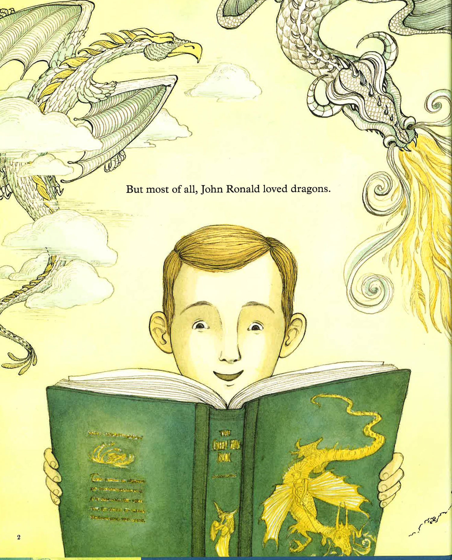 John Ronald loved dragons. He liked to imagine dragons when he was alone, and with his friends, and especially when life got hard or sad. After his mother died and he had to live with a cold hearted aunt, he looked for dragons, He searched for them at his boarding school. And when he fought in a Great War, he felt as if terrible, destructive dragons were everywhere. But he never actually found one, until one day, when he was a grown man but still very much a boy at heart, when he decided to create one of his own. This picture book biography introduces the beloved creator of Middle Earth and author of The Hobbit to a new generation of children who see magic in the world around them.
