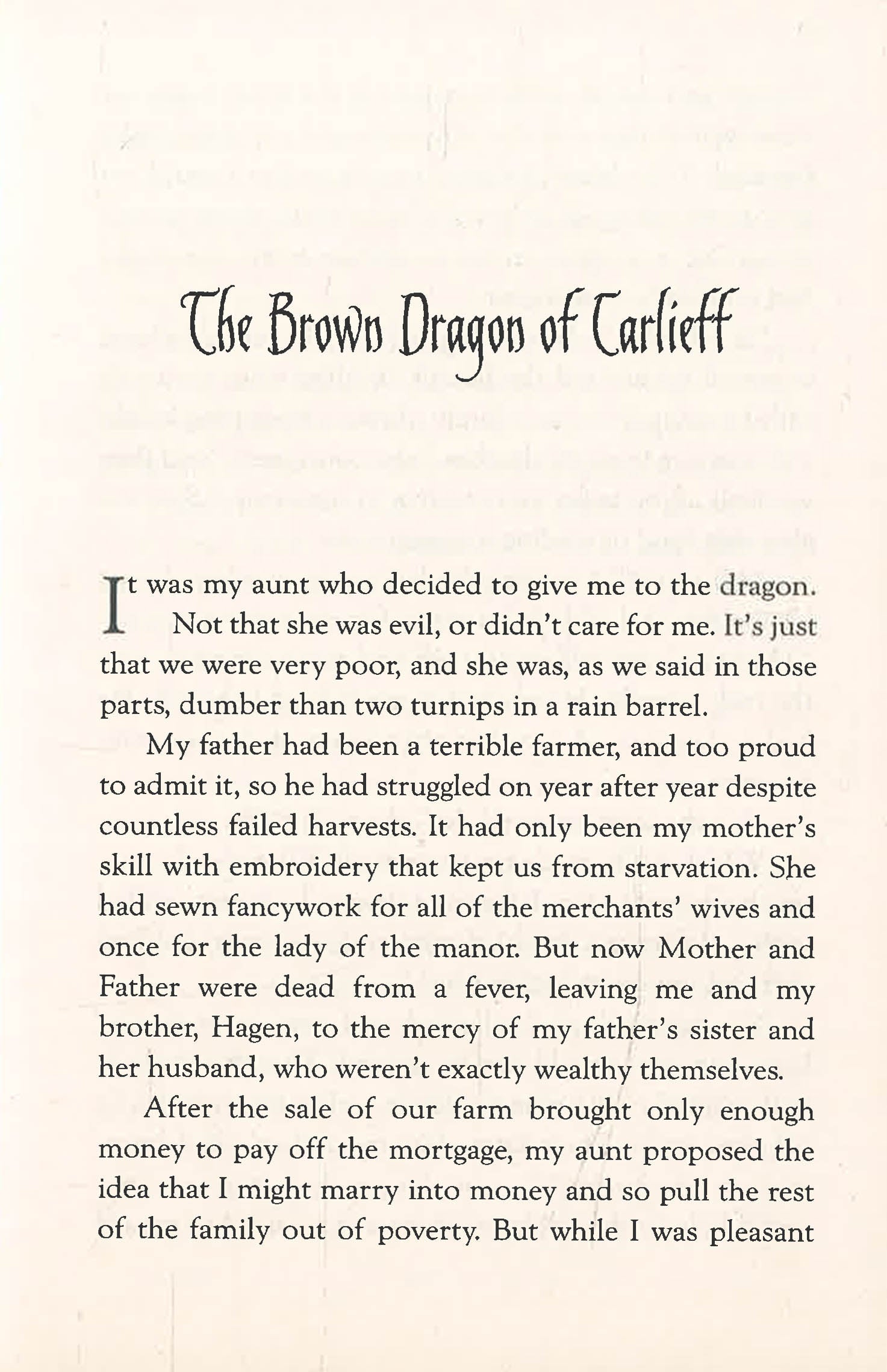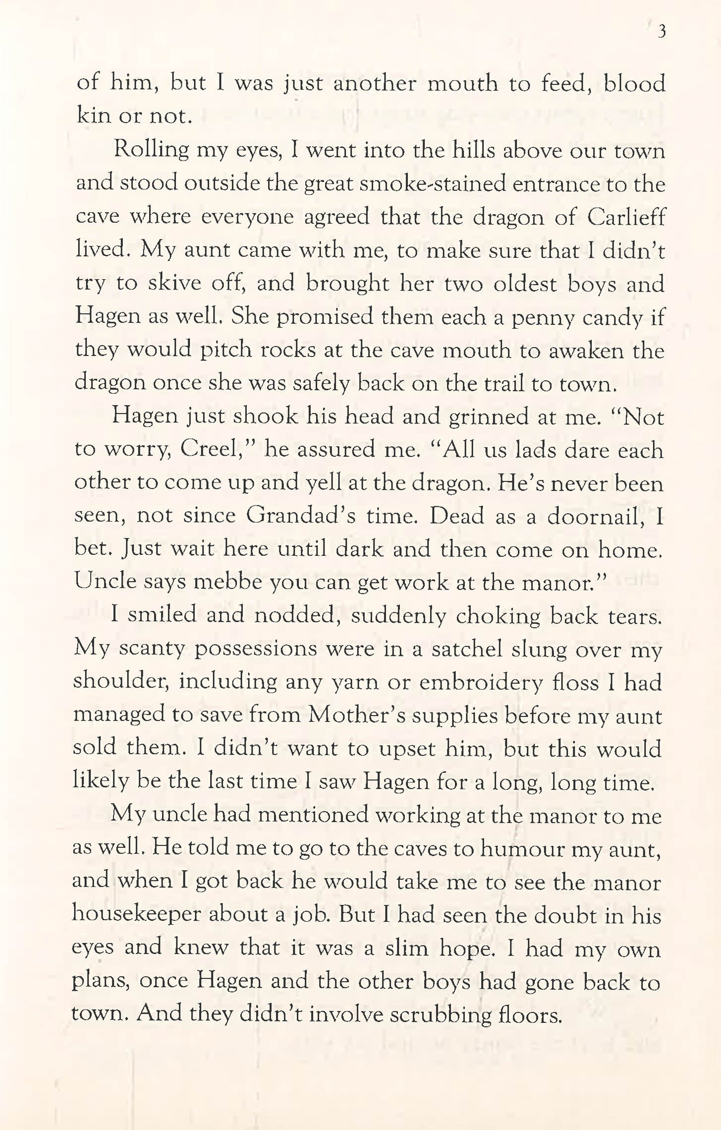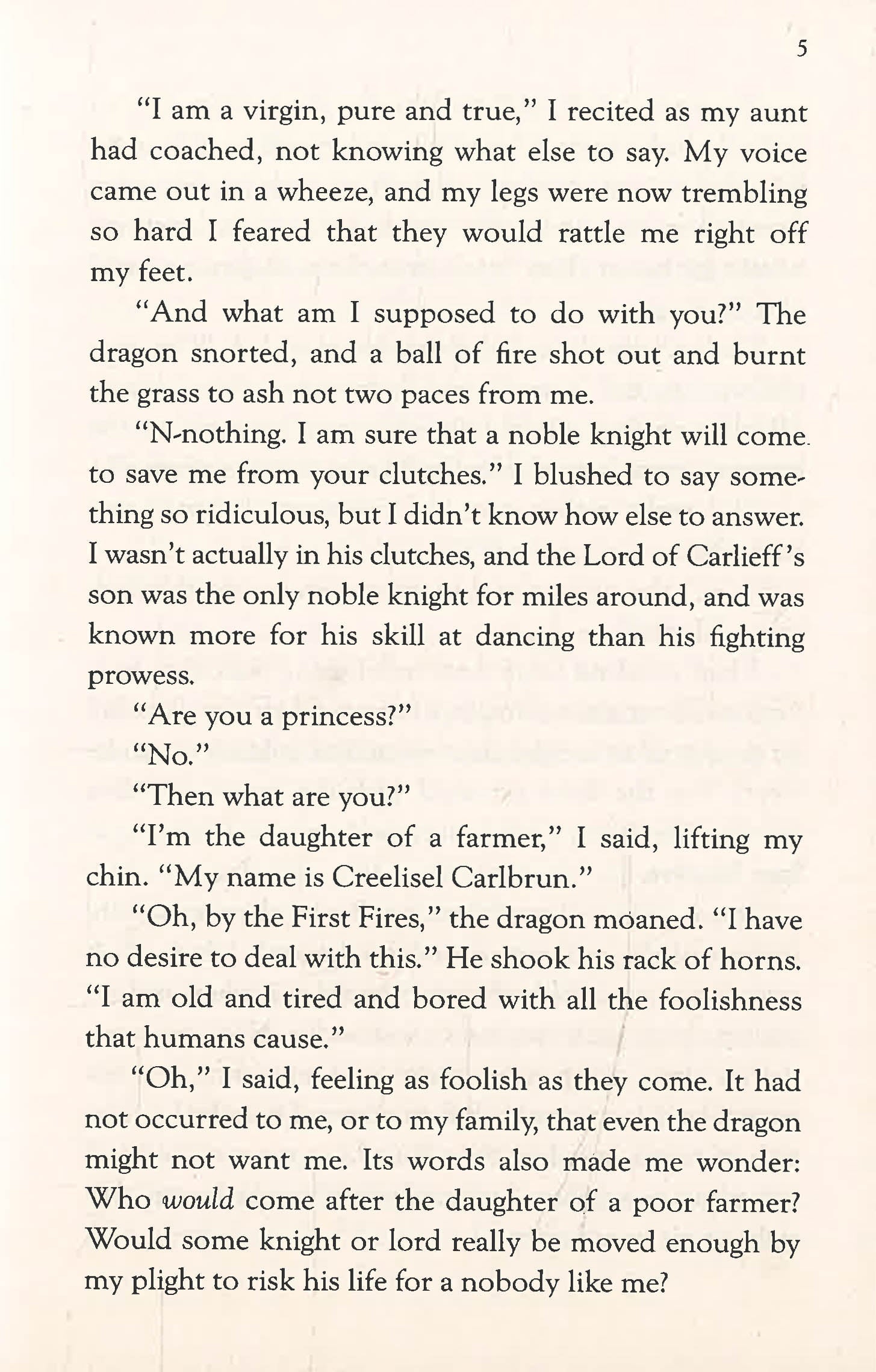Fifteen-year-old Creel is floored when her aunt suggests they sacrifice her to a dragon to attract the attention of a marriageable knight. But when the dragon appears, Creel bargains for her life - and ends up with an unusual pair of blue slippers. It's not until the slippers are stolen by a princess that Creel learns a terrible truth: the slippers are made from the hide of a dragon queen, and enable the wearer to control all the dragons in the land. Now under the command of the princess, who is eager to start a war, the dragons begin to attack the city. Creel must join forces with the king's son and others to break the slippers' hold before the princess and the dragons destroy the city - or before the king's archers kill the dragons - whichever comes first.