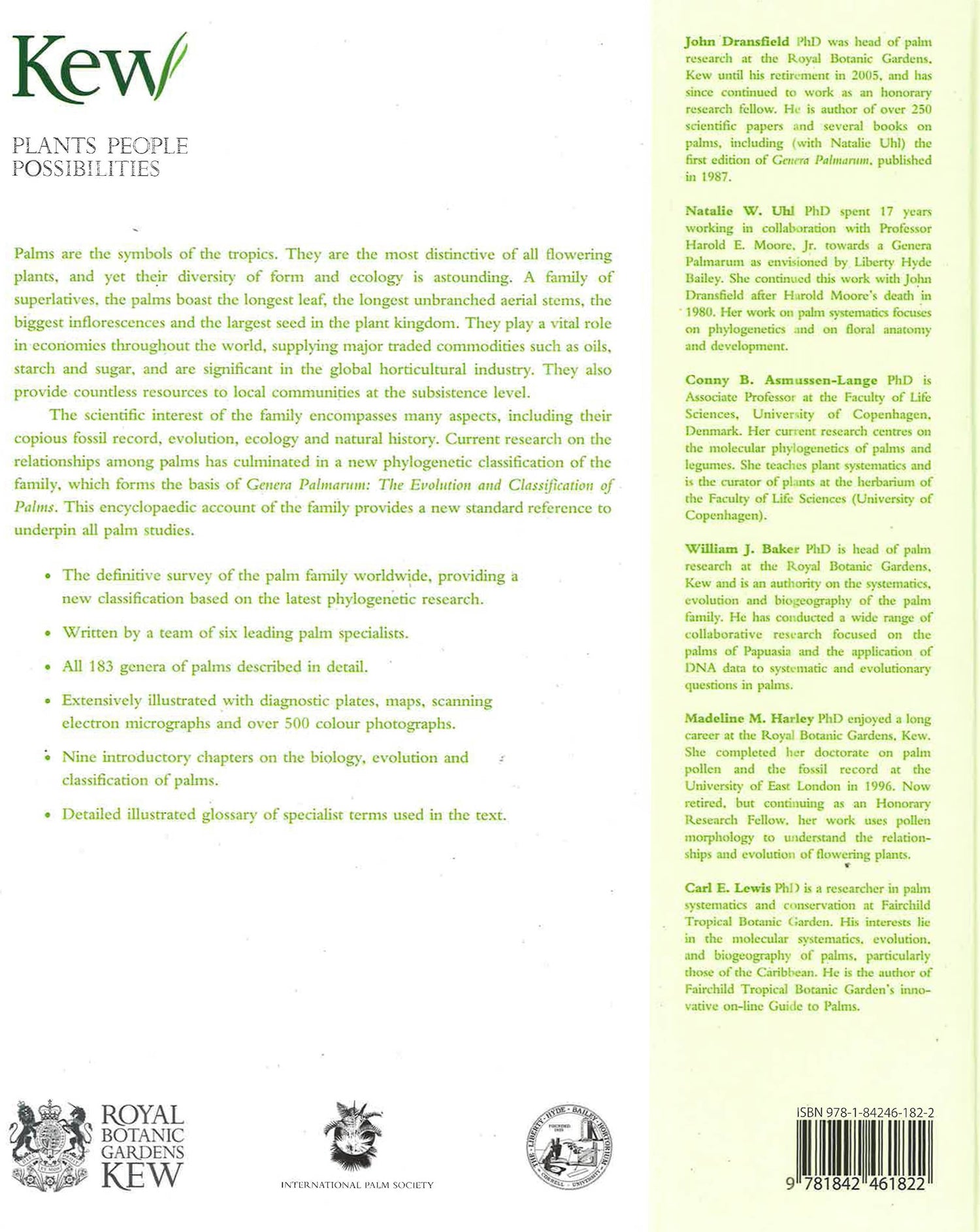 Genera Palmarum - The Evolution and Classification of the Palms is the standard reference work for information on the biology of the palm family, especially evolution, systematics, structure, fossil record and classification. Genera Palmarum - The Evolution and Classification of Palms is a completely rewritten edition of the acclaimed standard reference work for the palm family, a group of plants of immense economic and horticultural significance. In the new edition, genus treatments include complete descriptions, nomenclature, etymology and discussions of diversity, distribution, phylogeny, morphology, uses and ecology. All genera of palms are illustrated with analytical plates, maps and numerous photographs, mostly taken in the wild. The introduction consists of essays on the structure of palms, their pollen, cytology, chemistry, fossil record, evolution, phylogeny, natural history and biogeography, providing essential background information to the classification presented within the book. The classification itself is substantially revised and based on the latest phylogenetic evidence. Since the first edition, published in 1987, several new genera have been discovered and the wealth of new research into the phylogeny of palms has revealed relationships not appreciated in the past, resulting in substantial reorganization of subfamilies, tribes, subtribes and genera. An illustrated glossary and geographical listings complete this essential reference book to the palm family. Winner of the 2009 Technical category CBHL (The Council on Botanical and Horticultural Libraries) Annual Award for a Significant Work in Botanical or Horticultural Literature.