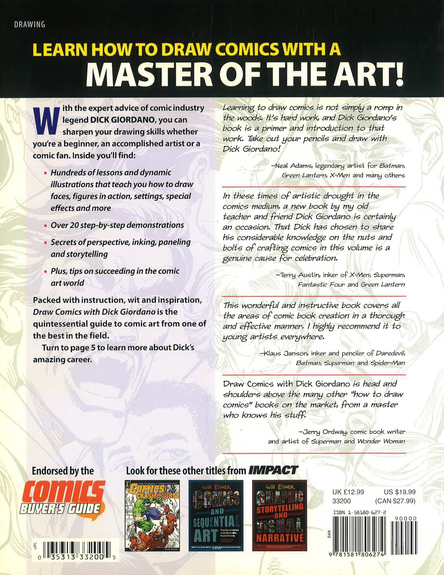 When it comes to drawing comics in classic American style, Dick Giordano is a superhero. He shares his talents with fans - and budding artists - in this quintessential guide. It's easy to get started with: More than 30 step-by-step demonstrations covering all the basic elements of drawing comics; Sample projects taught in pencil and ink - no expensive materials required; Tips and techniques for creating basic elements such as heads, torsos, backgrounds and scenery; Pages and pages of dynamic, action-packed artwork; Draw Comics with Dick Giordano gives readers a powerful combination: A hot drawing style taught by an even hotter author.