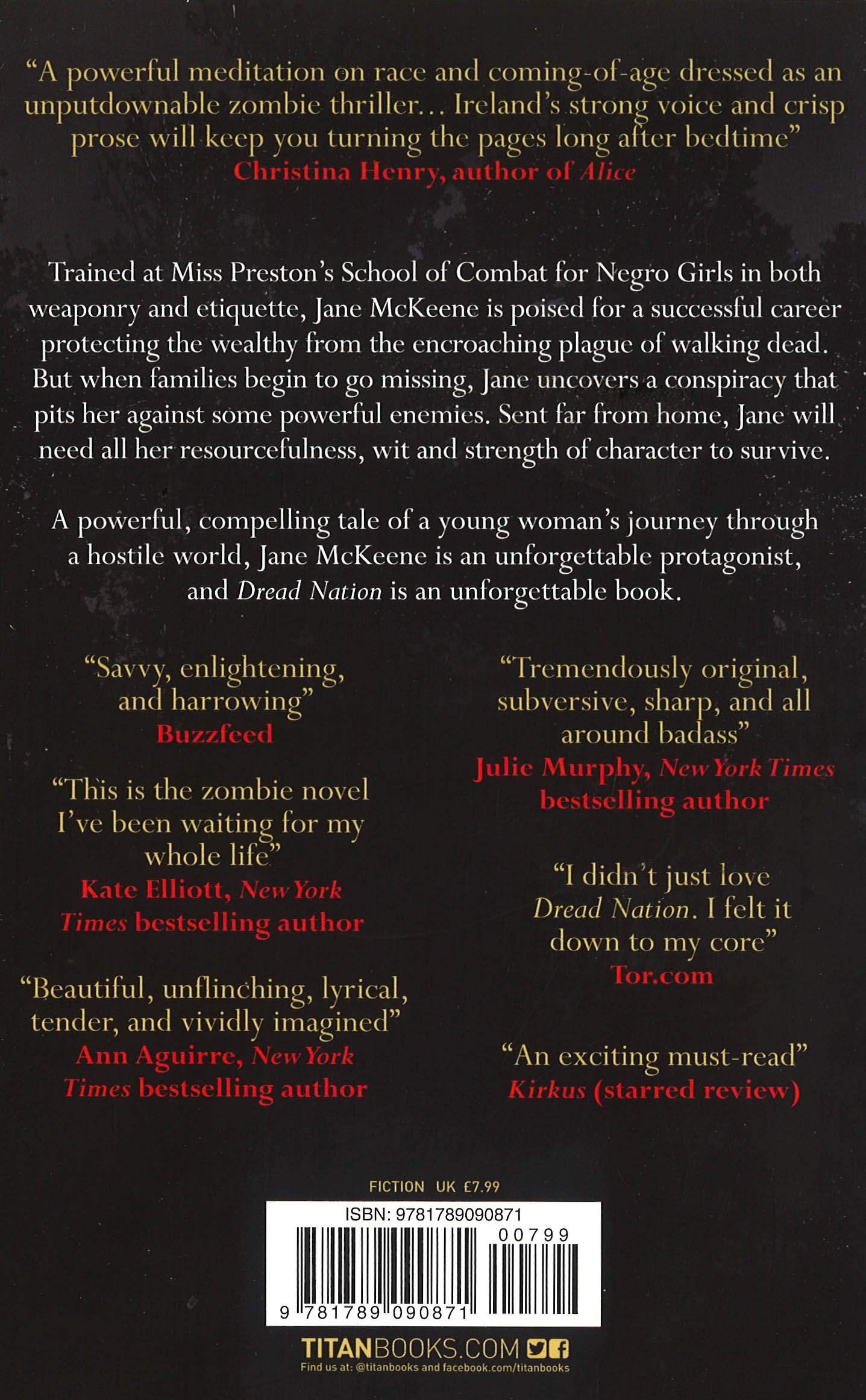 Trained at Miss Preston's School of Combat for Negro Girls in both weaponry and etiquette, Jane McKeene is poised for a successful career protecting the wealthy from the encroaching plague of walking dead. But when families begin to go missing, Jane uncovers a conspiracy that pits her against some powerful enemies. Sent far from home, Jane will need all her resourcefulness, wit and strength of character to survive. A powerful, compelling tale of a young girl's journey through a hostile world, Jane McKeene is an unforgettable protagonist, and Dread Nation is an unforgettable book.