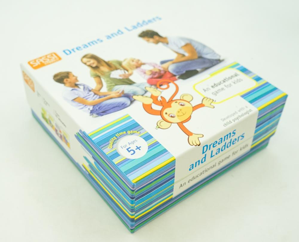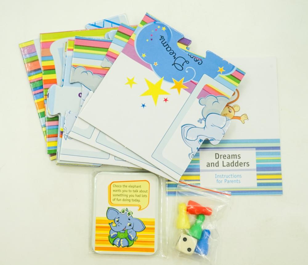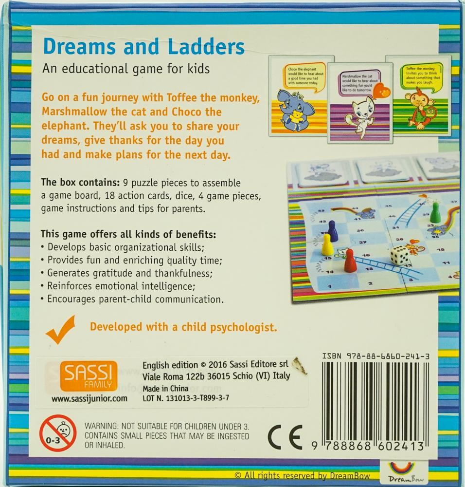Embark on a joyful journey with the Toffee monkey, the Marshmallow cat and the Choco baby elephant, who will invite you to share your dreams, to thank for the day and make plans for the next one. In the box you will find: a puzzle of 9 pieces to build the game board, 18 illustrated cards, a dice, 4 pawns, instructions and useful tips for parents. Uniqueness and benefits of the game: development of basic organizational skills; fun and enriching the quality of time; creating feelings of gratitude; strengthening of emotional intelligence; encouragement for positive communication between children and parents. Reading age: from 5 years.