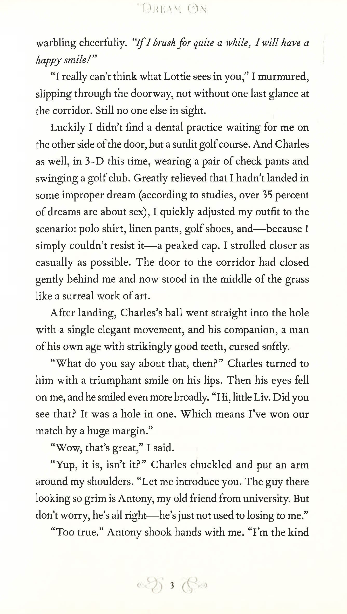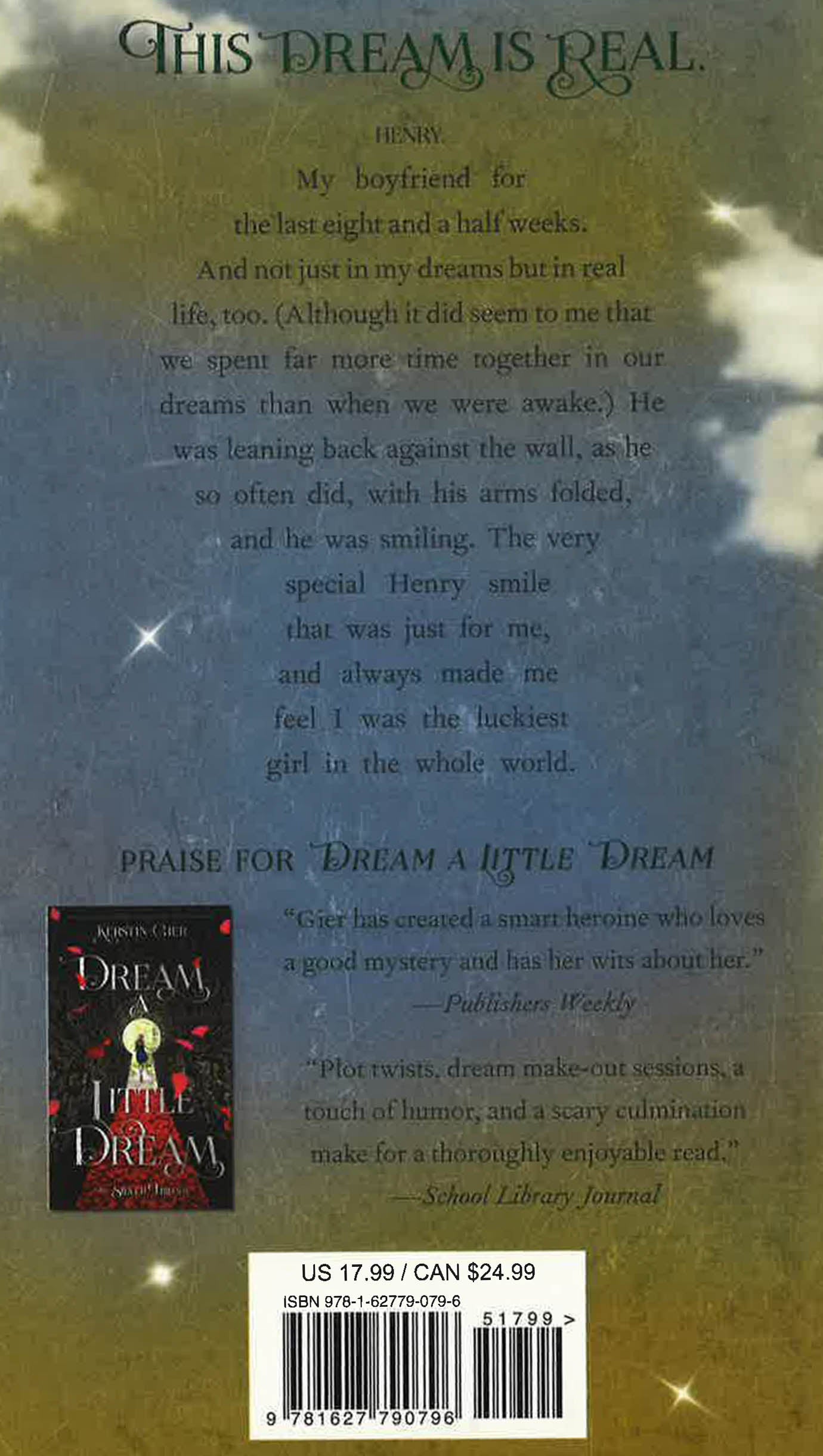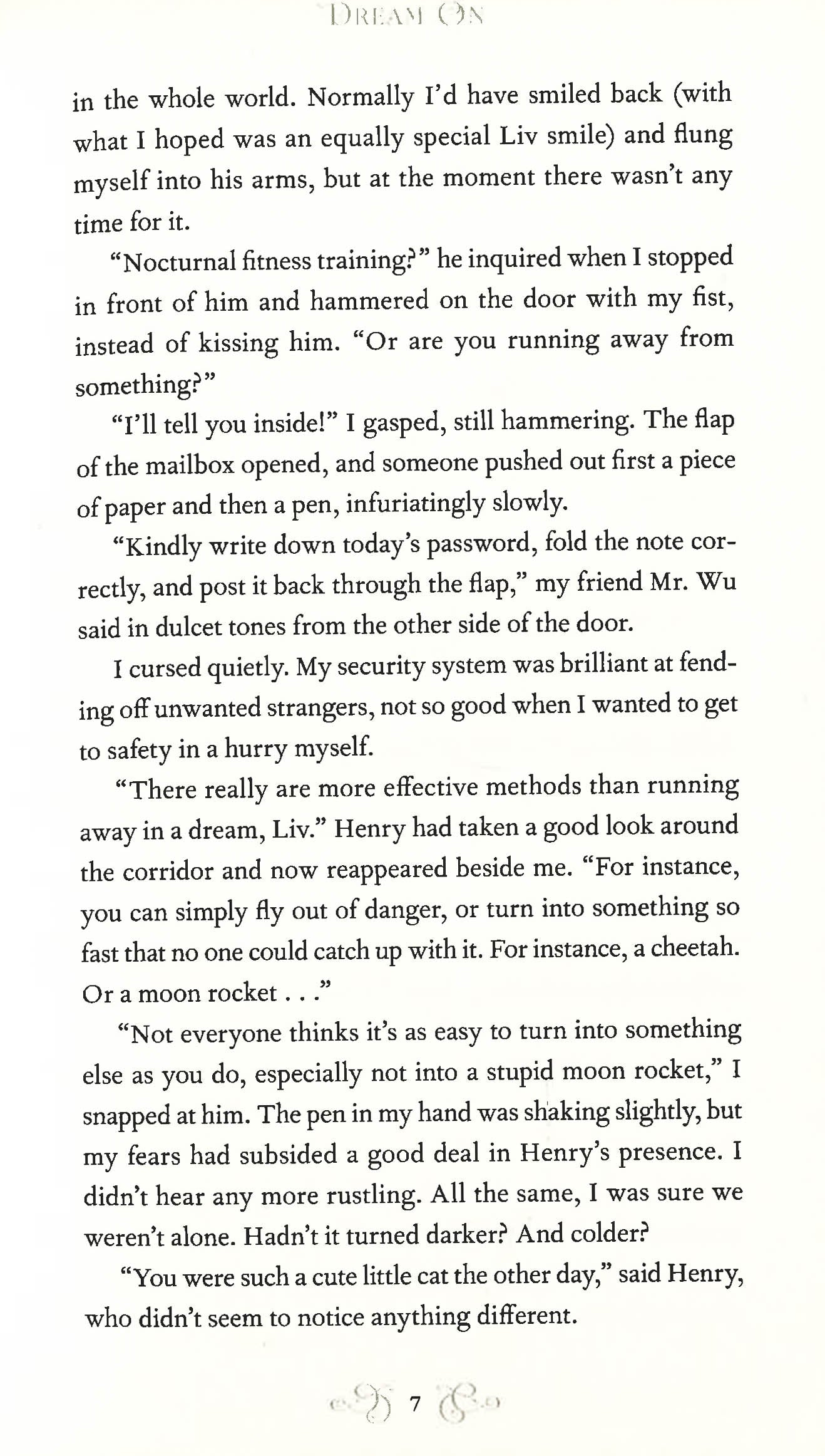 Things seem to be going well for Liv Silver: she's adjusting to her new home (and her new family) in London; she has a burgeoning romance with Henry Harper, one of the cutest boys in school; and the girl who's been turning her dreams into nightmares, Anabel, is now locked up. But serenity doesn't last for long. It seems that Liv's troubles are far from over - in fact, suddenly they're piling up. School gossip blogger Secrecy knows all of Liv's most intimate secrets, Henry might be hiding something from her, and at night Liv senses a dark presence following her through the corridors of the dream world. Does someone have a score to settle with Liv? Romance, adventure, and danger abound in Dream On, the second book in the Silver Trilogy.