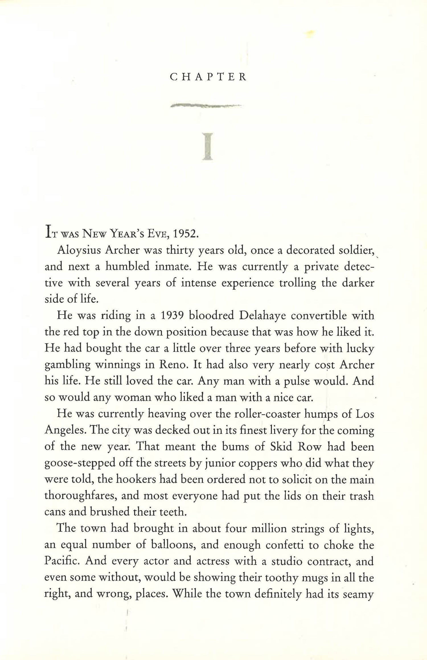 Archer’s investigation takes him from the rich, glamorous and glitzy LA to the seedy, dark side of the city, and onward to the gambling mecca of Las Vegas, just now hitting its stride as a hot spot for celebrities and a money-making machine for the mob. In a place where cops and crooks work hand in hand, Archer will cross paths with Hollywood stars, politicians and notorious criminals. He’ll almost die several times, and he’ll discover bodies and secrets from the canyons and beaches of Malibu and the luxurious mansions of Bel Air and Beverly Hills to the narcotics clubs of Chinatown.
