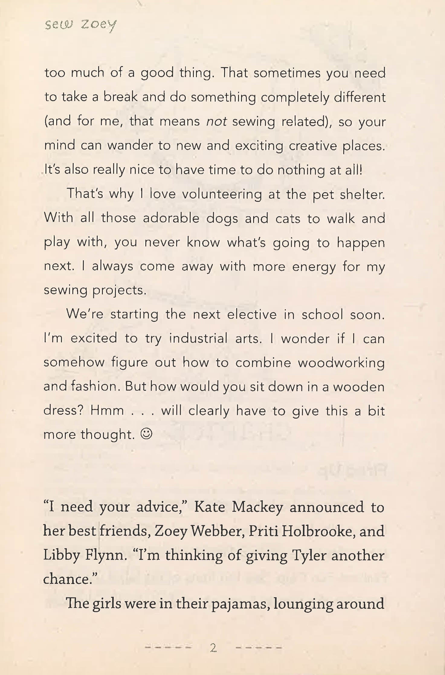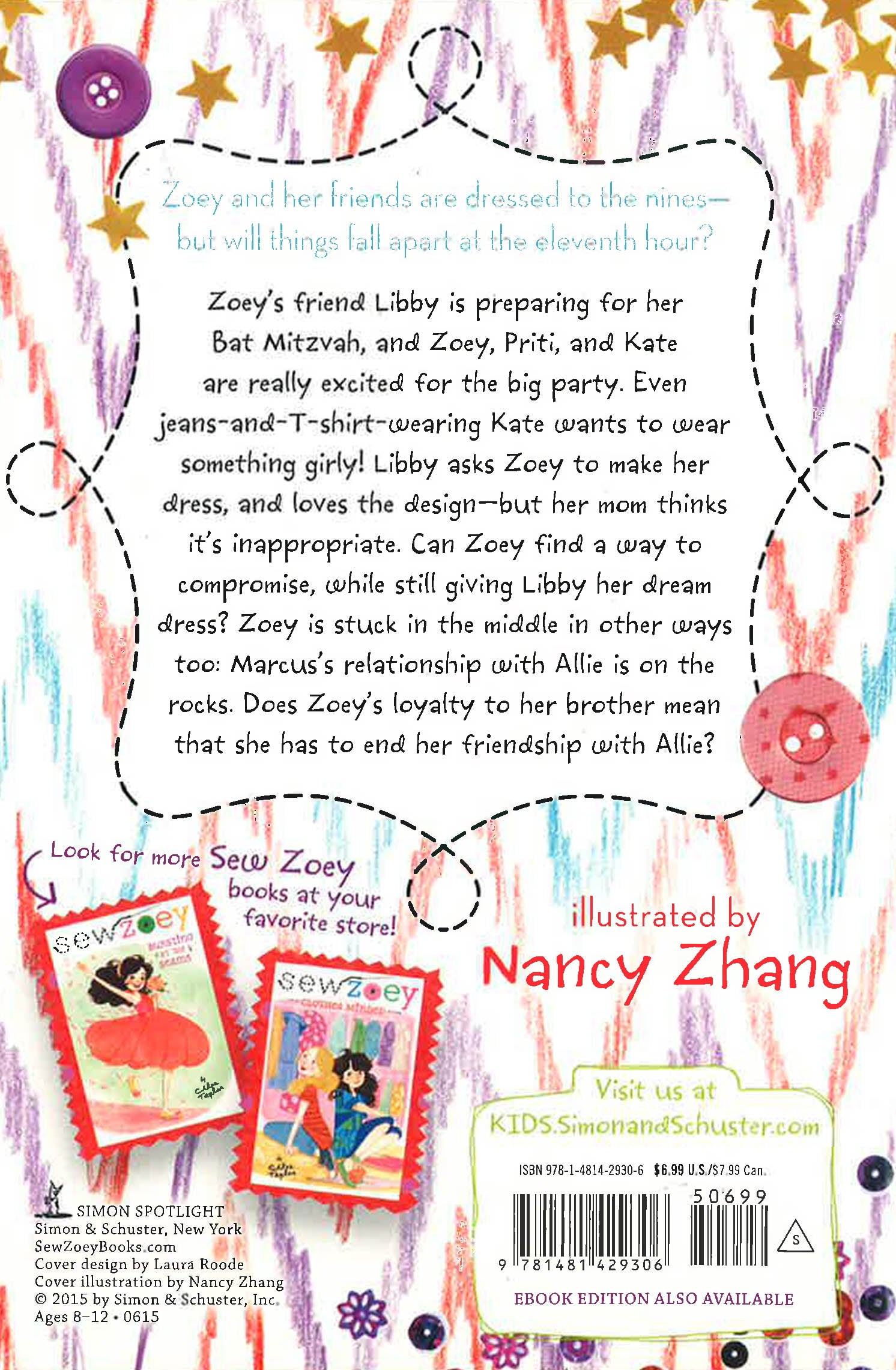 Zoey and her friends are dressed to the nines for Libby's bat mitzvah--but will things fall apart at the eleventh hour? Includes "Sew Zoey" blog posts and fashion illustrations. In the twelfth book in the Sew Zoey series, Zoey's friend Libby is preparing for her bat mitzvah, and Zoey, Priti, and Kate are really excited for the big party. Libby asks Zoey to make her dress, and loves the design--but her mom thinks it's inappropriate. Can Zoey find a way to compromise while still giving Libby her dream dress? Zoey is stuck in the middle in other ways, too: Her brother Marcus's relationship with Allie is on the rocks. Does Zoey's loyalty to her brother mean that she has to end her friendship with Allie? And when Zoey sees something shocking at the bat mitzvah party, she's not so sure she wants to be Allie's friend at all...