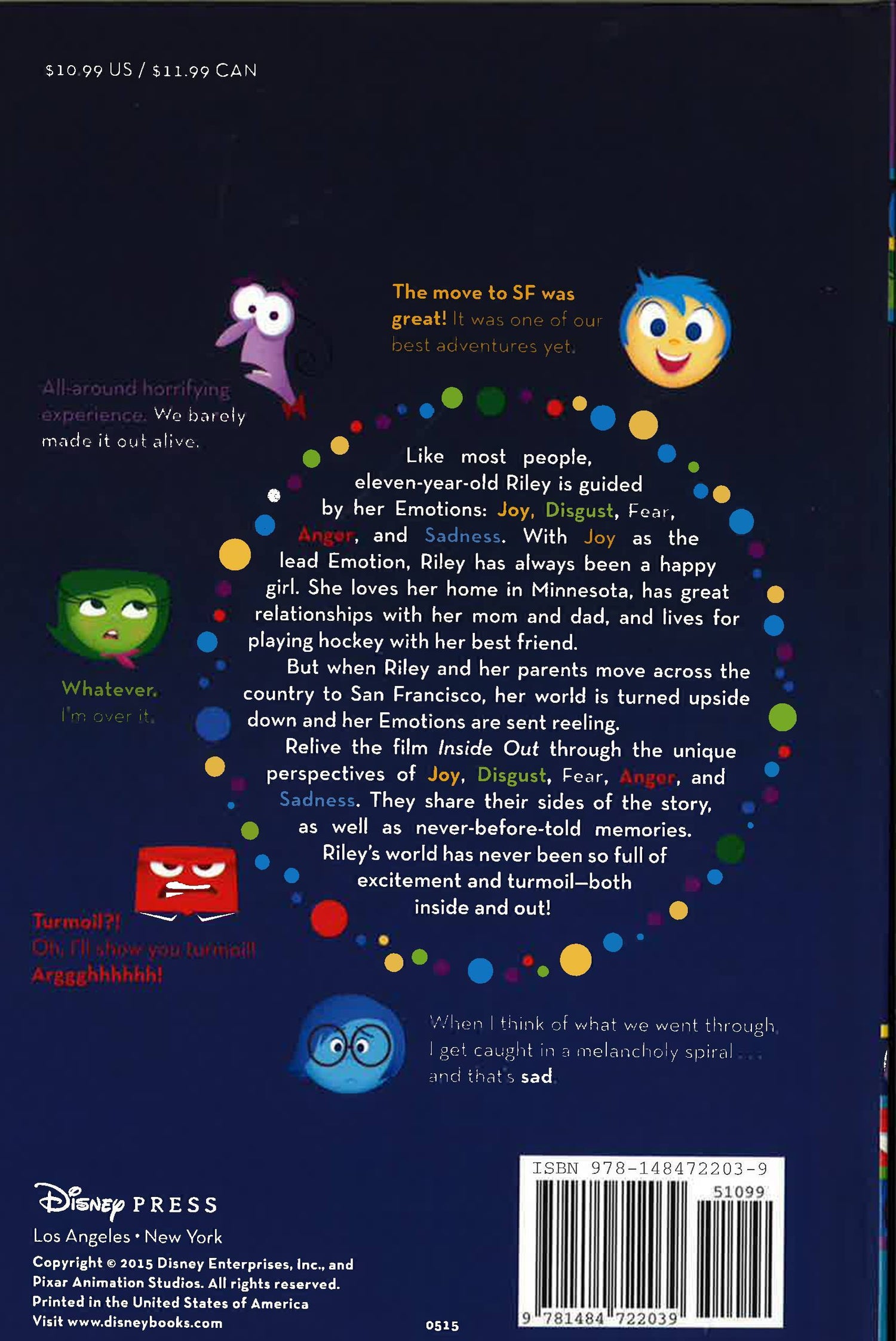 Like most people, eleven-year-old Riley is guided by her Emotions: Joy, Disgust, Fear, Anger, and Sadness. With Joy as lead Emotion, Riley has always been a happy girl. She loves her home in Minnesota, has great relationships with her mom and dad, and lives for playing hockey with her best friend.But when Riley and her parents move across the country to San Francisco, her world is turned upside down and her Emotions are sent reeling.Relive the film Inside Out through the unique perspectives of Joy, Disgust, Fear, Anger, and Sadness. They share their sides of the story, as well as never-before-told memories. Riley's world has never been so full of excitement and turmoil - both inside and out!
