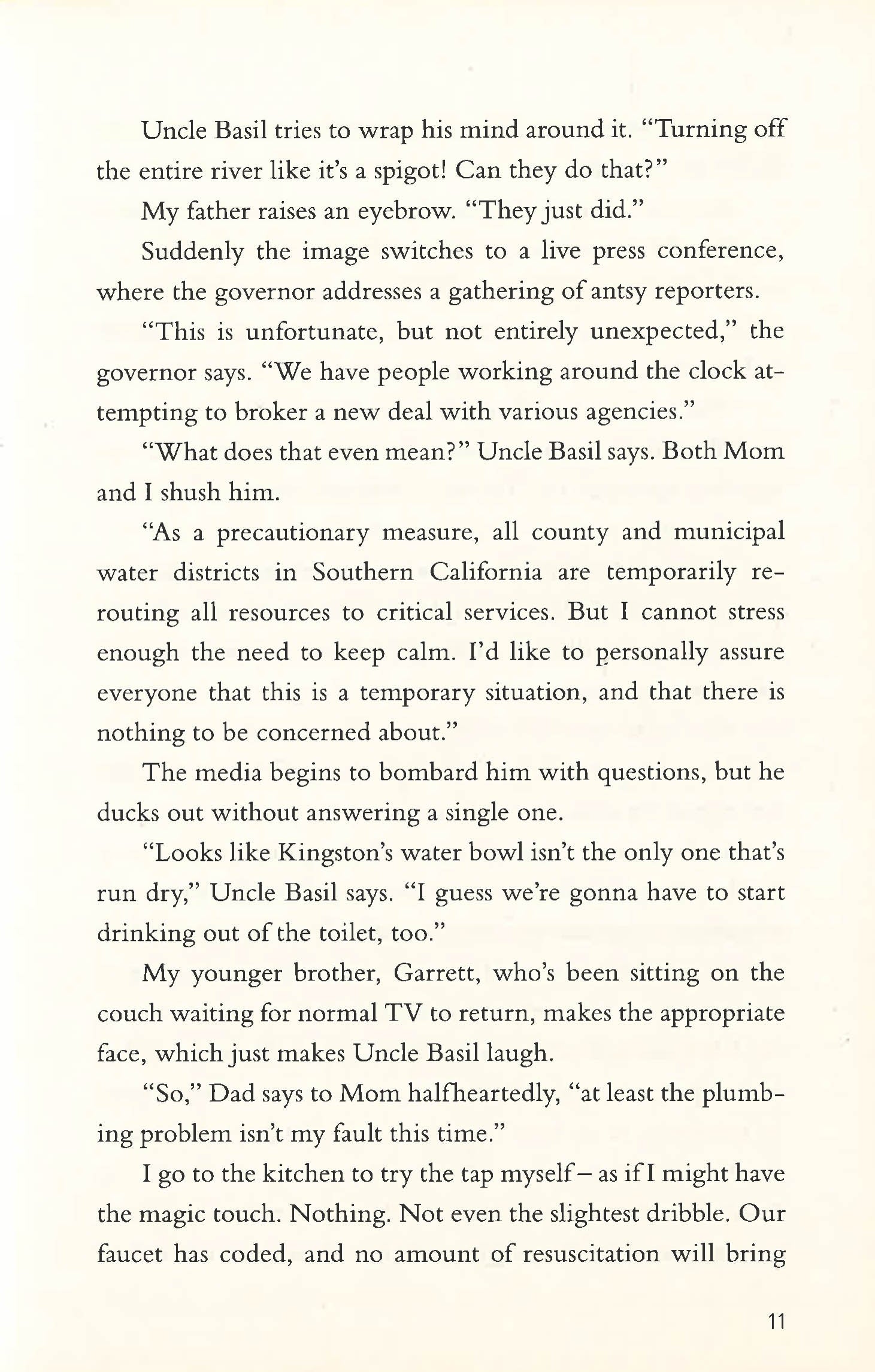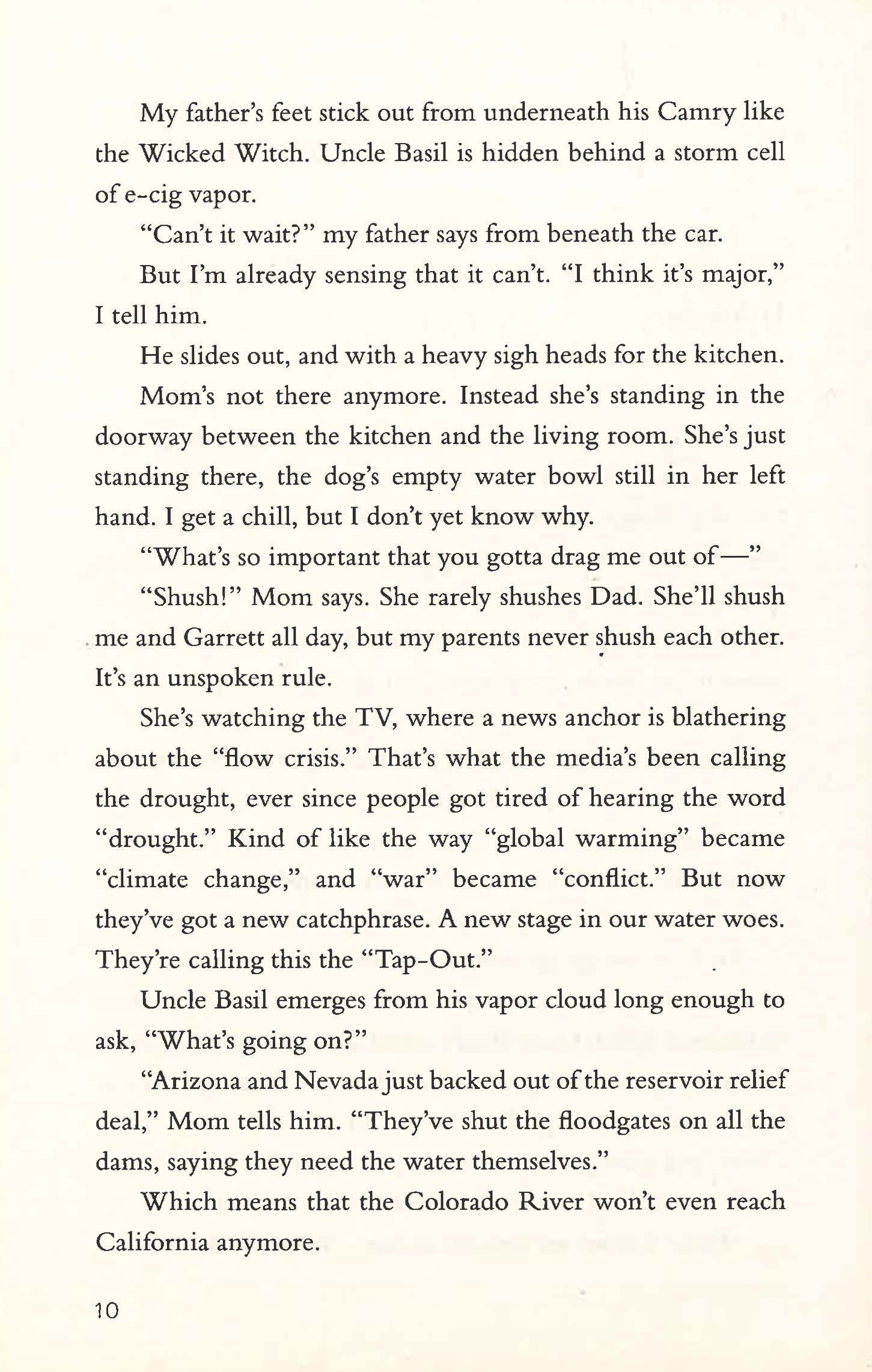 When the California drought escalates to catastrophic proportions, one teen is forced to make life and death decisions in this harrowing story of survival from New York Times bestselling author Neal Shusterman and Jarrod Shusterman.The drought - or the Tap-Out, as everyone calls it - has been going on for a while now. Everyone's lives have become an endless list of don'ts: don't water the lawn, don't fill up your pool, don't take long showers.Until the taps run dry.Suddenly, Alyssa's quiet suburban street spirals into a warzone of desperation; neighbours and families turned against each other on the hunt for water. And when her parents don't return and her life - and the life of her brother - is threatened, Alyssa has to make impossible choices if she's going to survive.