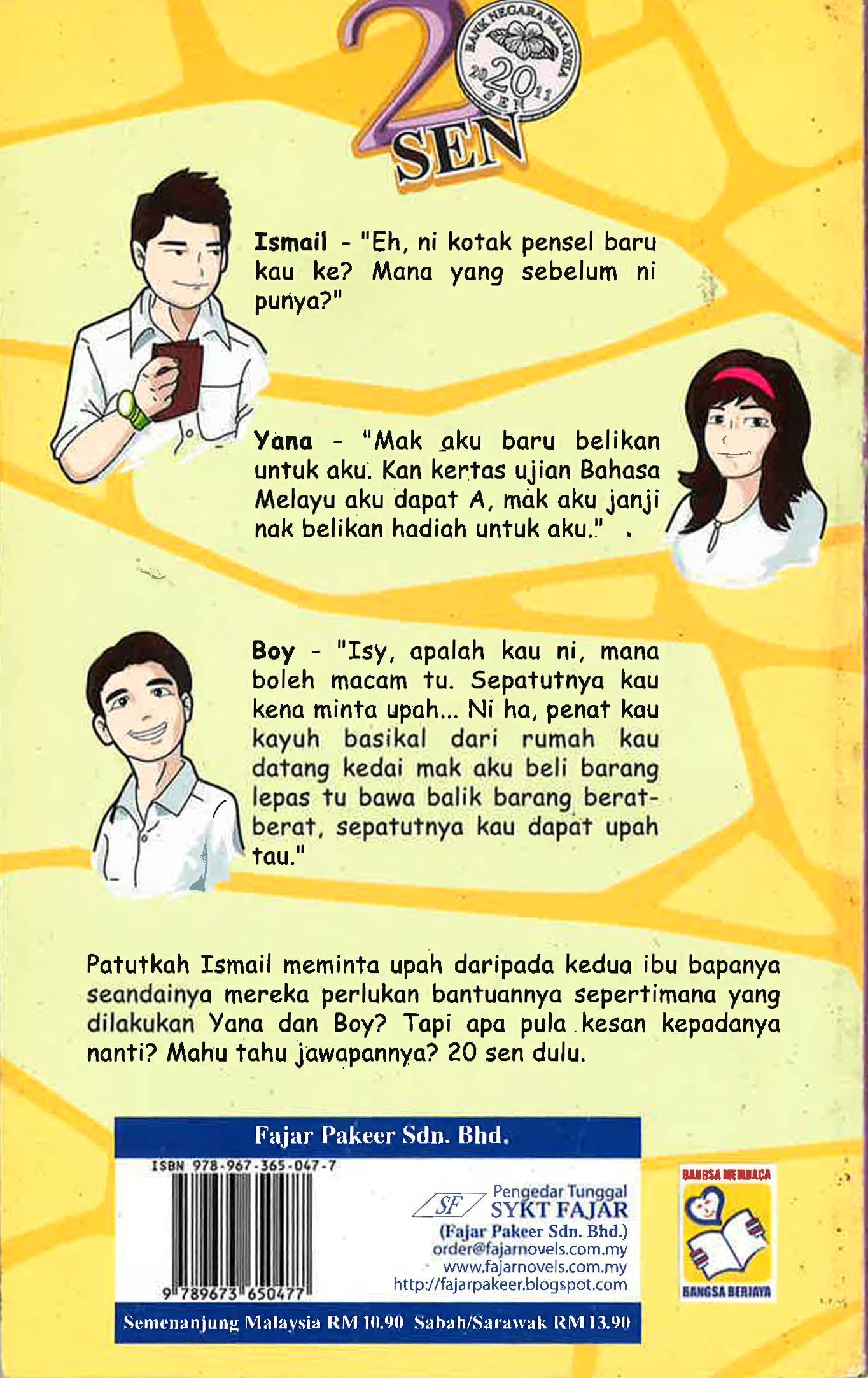 Ismail - Eh ni kotak pensel baru kau ke? Mana yang sebelum ni punya? Yana- Mak aku baru belikan untuk aku. Kan kertas ujian Bahasa Melayu aku dapat A, mak aku janji nak belikan hadiah untuk aku. Mahu tahu jawapannya? 20 sen dulu.