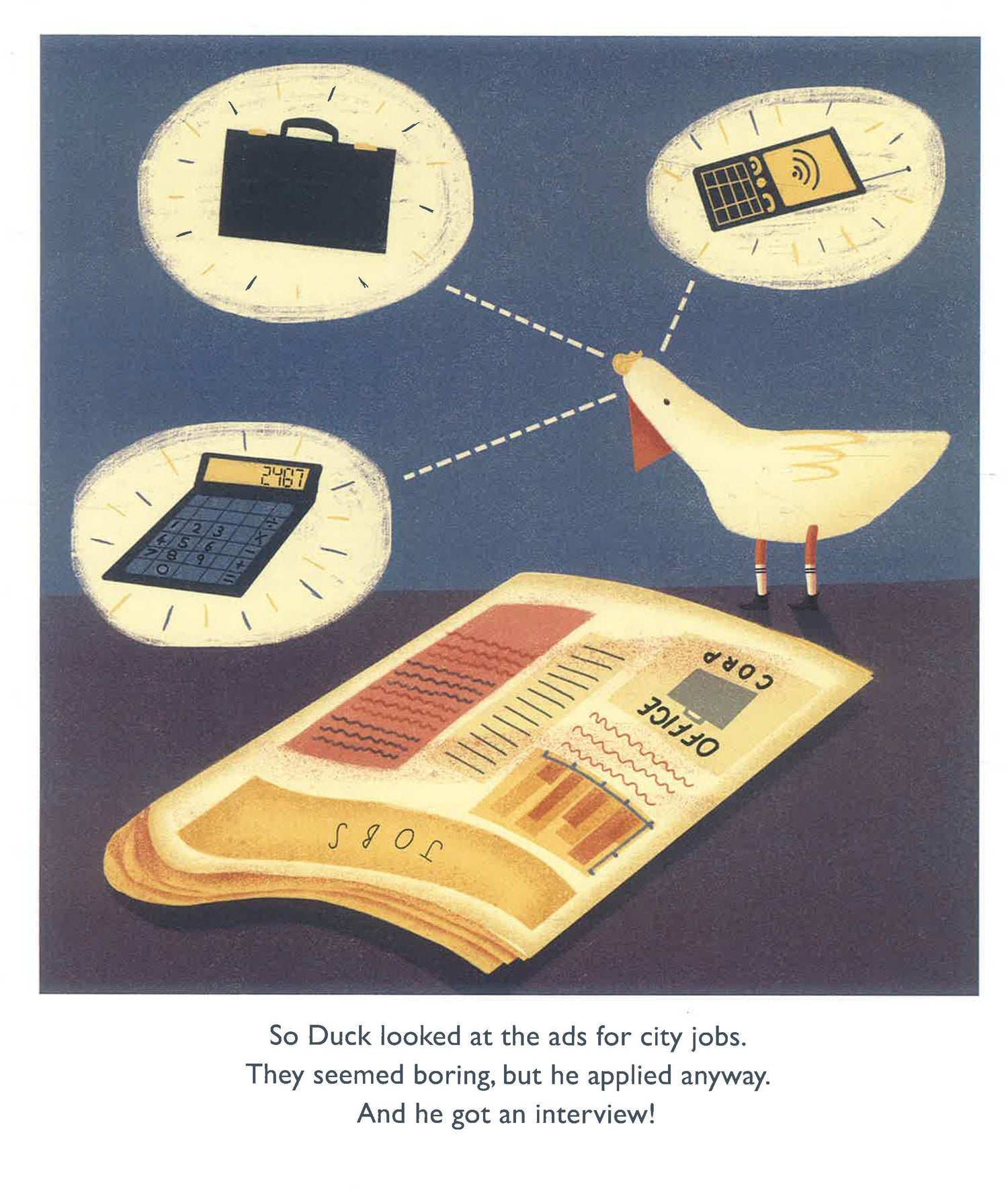 Duck wants a job. All his friends have jobs in the city, and they never stop talking about them. Duck doesn't think a job in the city sounds very exciting, but he decides to try it -- and it's not long before he discovers that it is not for him! He knows he needs to follow his heart and pursue his dream of being an artist. And when he does, he realizes he's found a job that he truly loves.