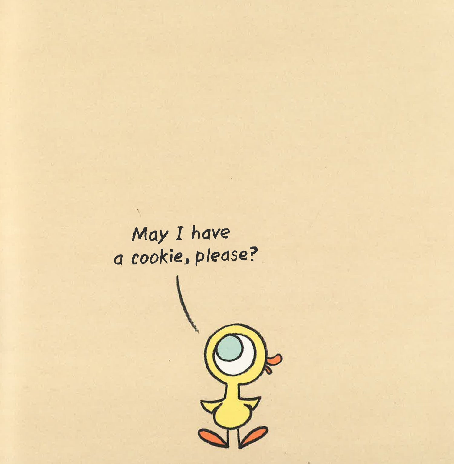 He has whined, wheedled, fibbed and hollered his way through many books. He wanted to drive the bus, he demanded a puppy, he pleaded for a hot dog party... But now, in a fantastic new title from Mo Willems, along comes Duckling, with bright twinkling eyes and impeccable manners. She asks for a cookie and what does she get? A cookie, of course! The Pigeon is outraged! Incensed! How could this have happened? HOW is it possible that this duckling gets a cookie?! Well, because she asked. Nicely.