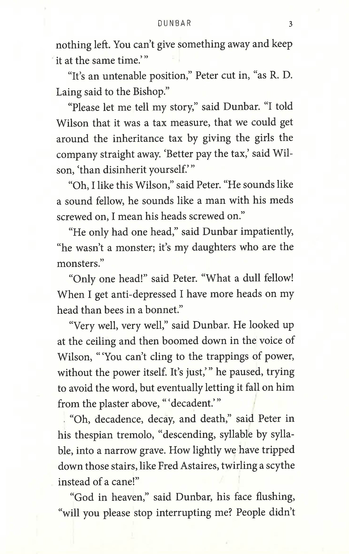Now imprisoned in Meadowmeade, an upscale sanatorium in rural England, with only a demented alcoholic comedian as company, Dunbar starts planning his escape. As he flees into the hills, his family is hot on his heels. But who will find him first, his beloved youngest daughter, Florence, or the tigresses Abby and Megan, so keen to divest him of his estate?