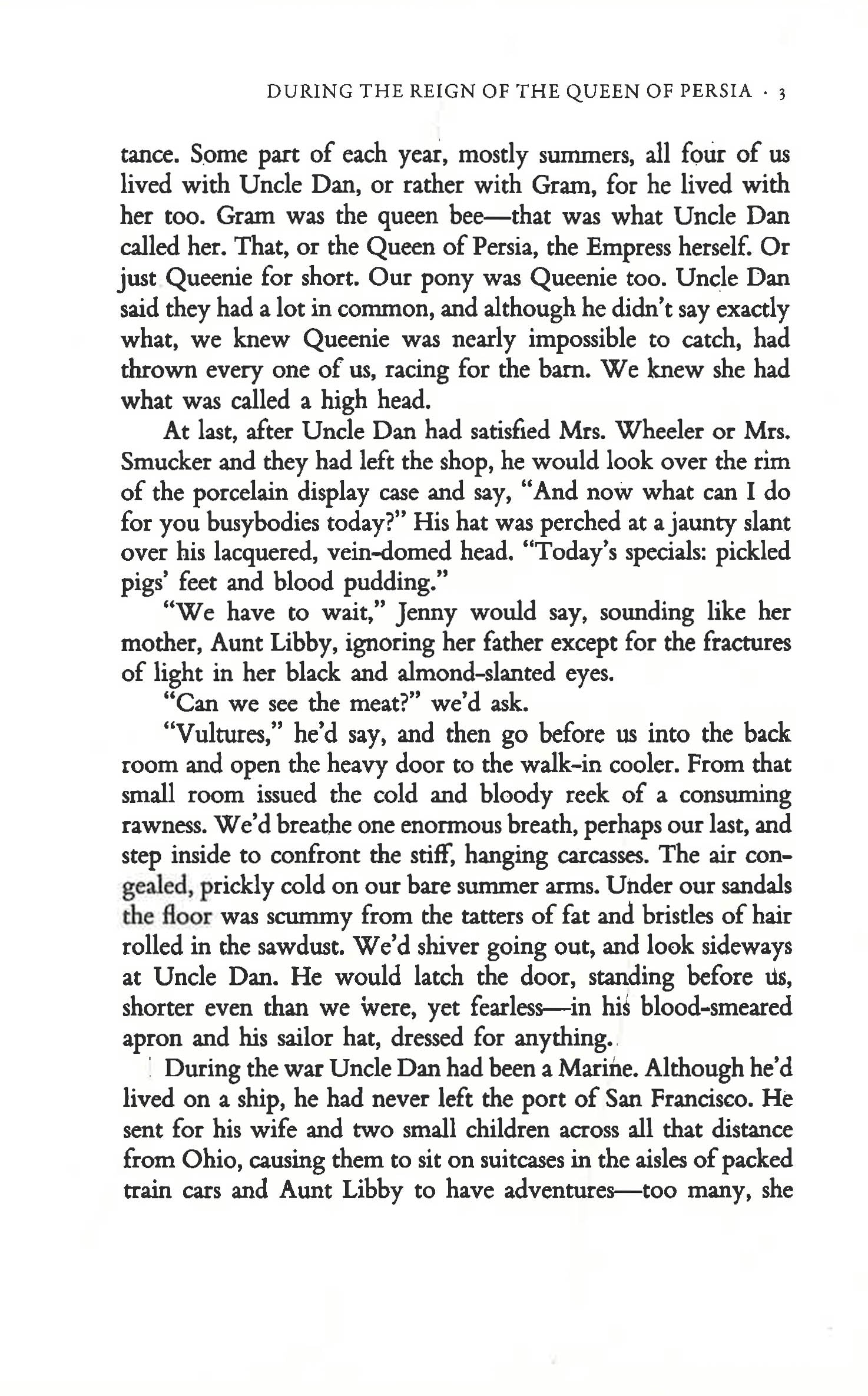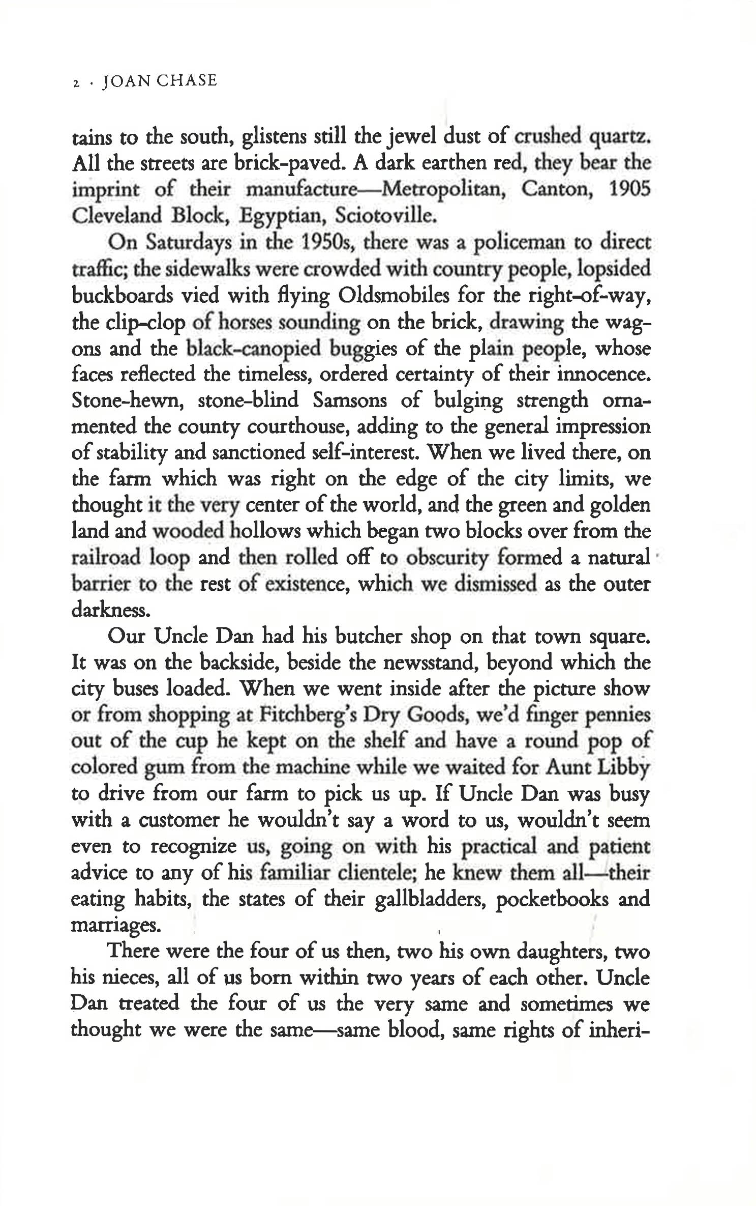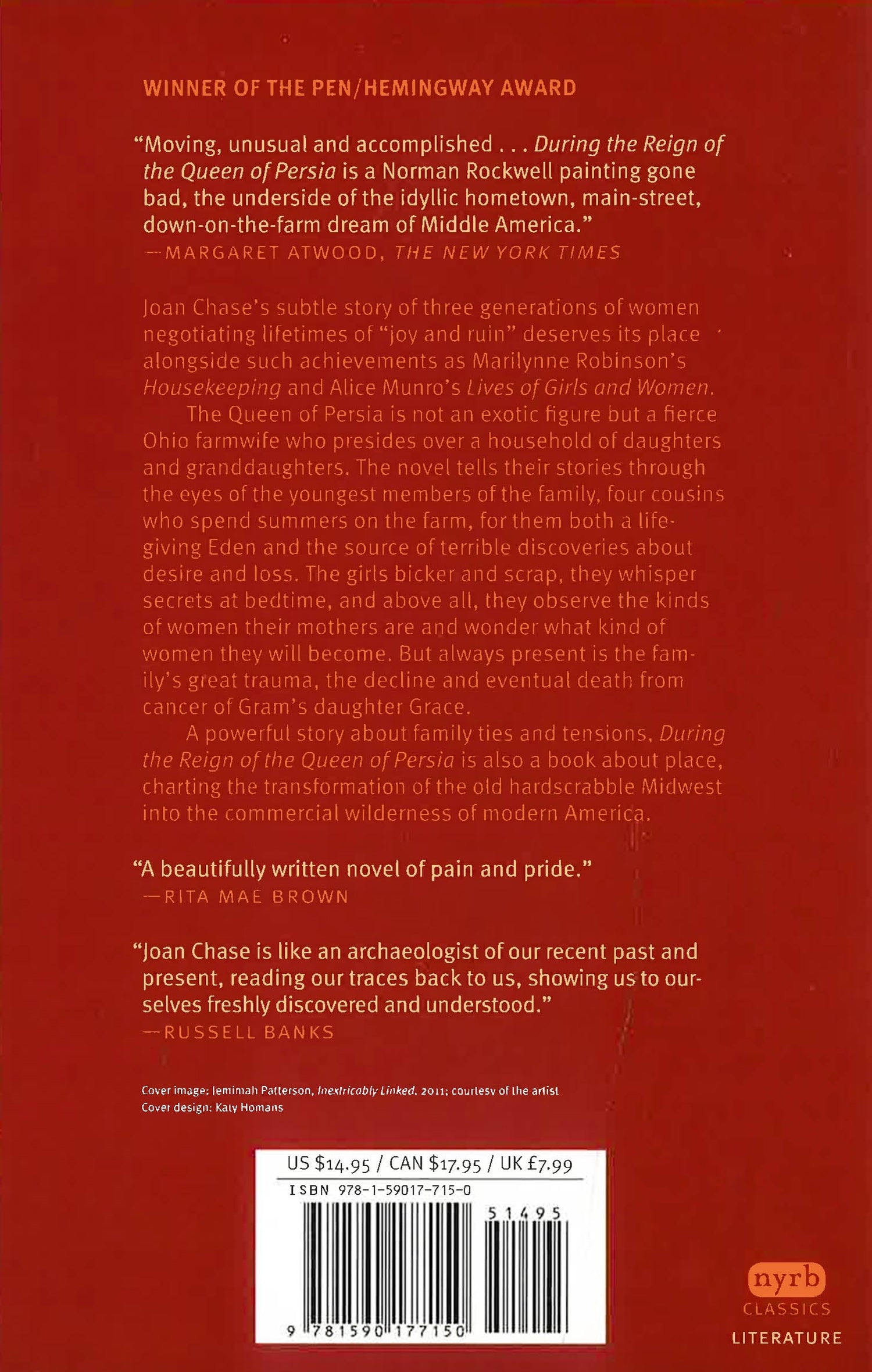 A multigenerational family drama about grief, motherhood, and coming of age, all taking place on an Ohio farm. Joan Chase's subtle story of three generations of women negotiating lifetimes of "joy and ruin" deserves its place alongside such achievements as Marilynne Robinson's Housekeeping and Alice Munro's Lives of Girls and Women. The Queen of Persia is not an exotic figure but a fierce Ohio farmwife who presides over a household of daughters and granddaughters. The novel tells their stories through the eyes of the youngest members of the family, four cousins who spend summers on the farm, for them both a life-giving Eden and the source of terrible discoveries about desire and loss. The girls bicker and scrap, they whisper secrets at bedtime, and above all, they observe the kinds of women their mothers are and wonder what kind of women they will become. But always present is the family's great trauma, the decline and eventual death from cancer of Gram's daughter Grace. A powerful story about family ties and tensions, During the Reign of the Queen of Persia is also a book about place, charting the transformation of the old hardscrabble Midwest into the commercial wilderness of modern America.