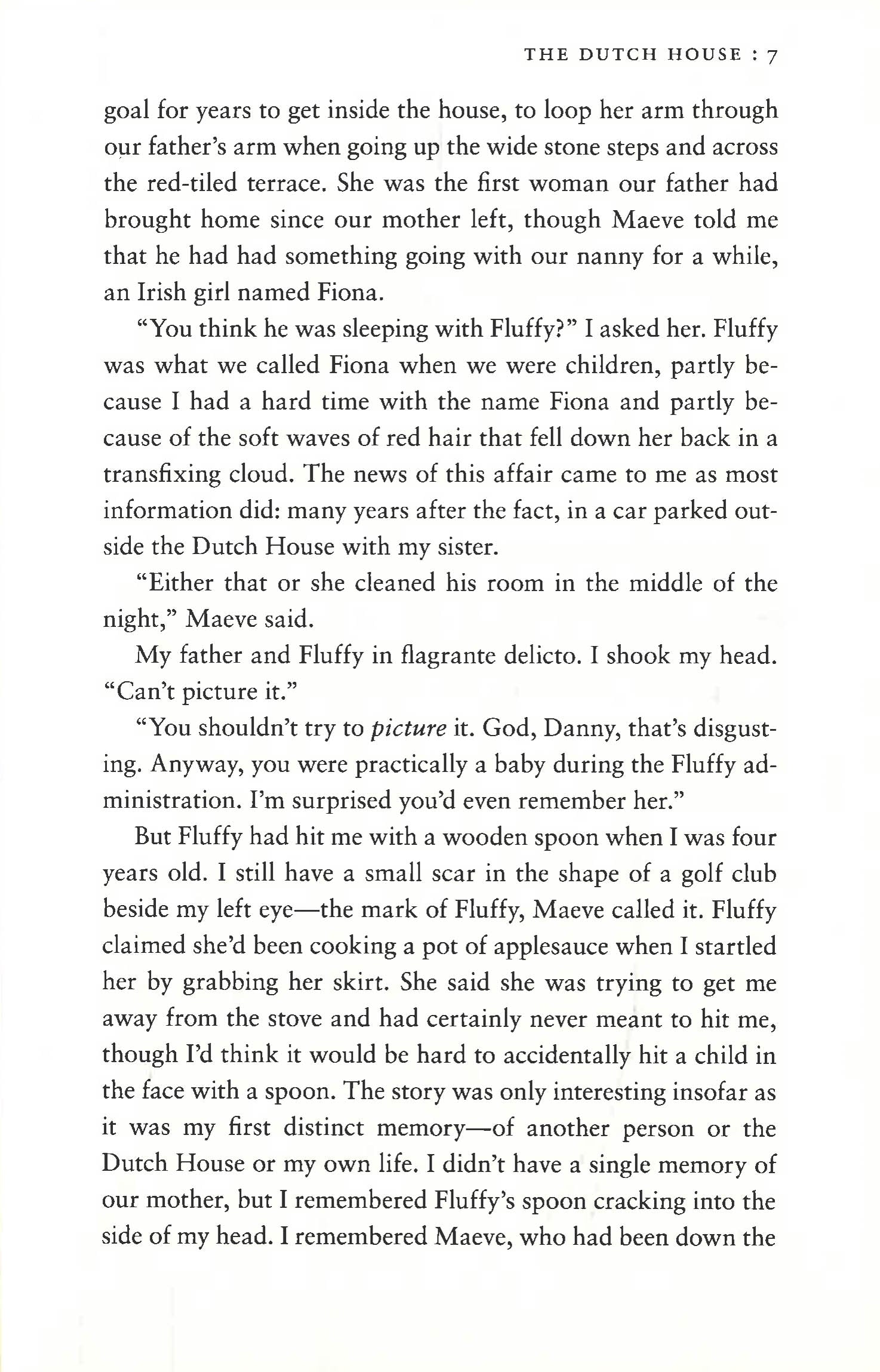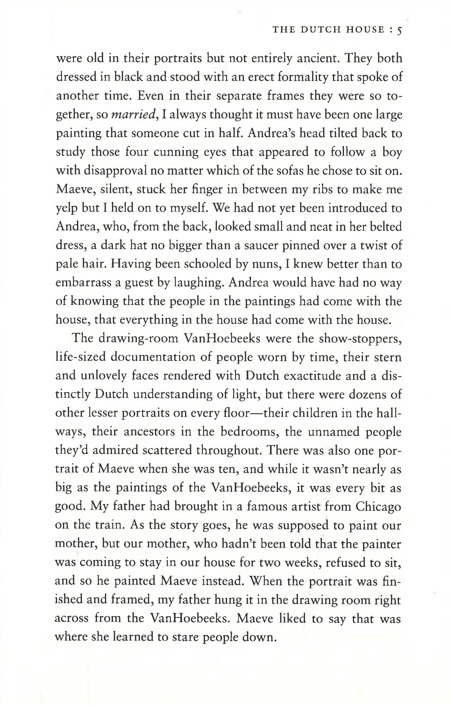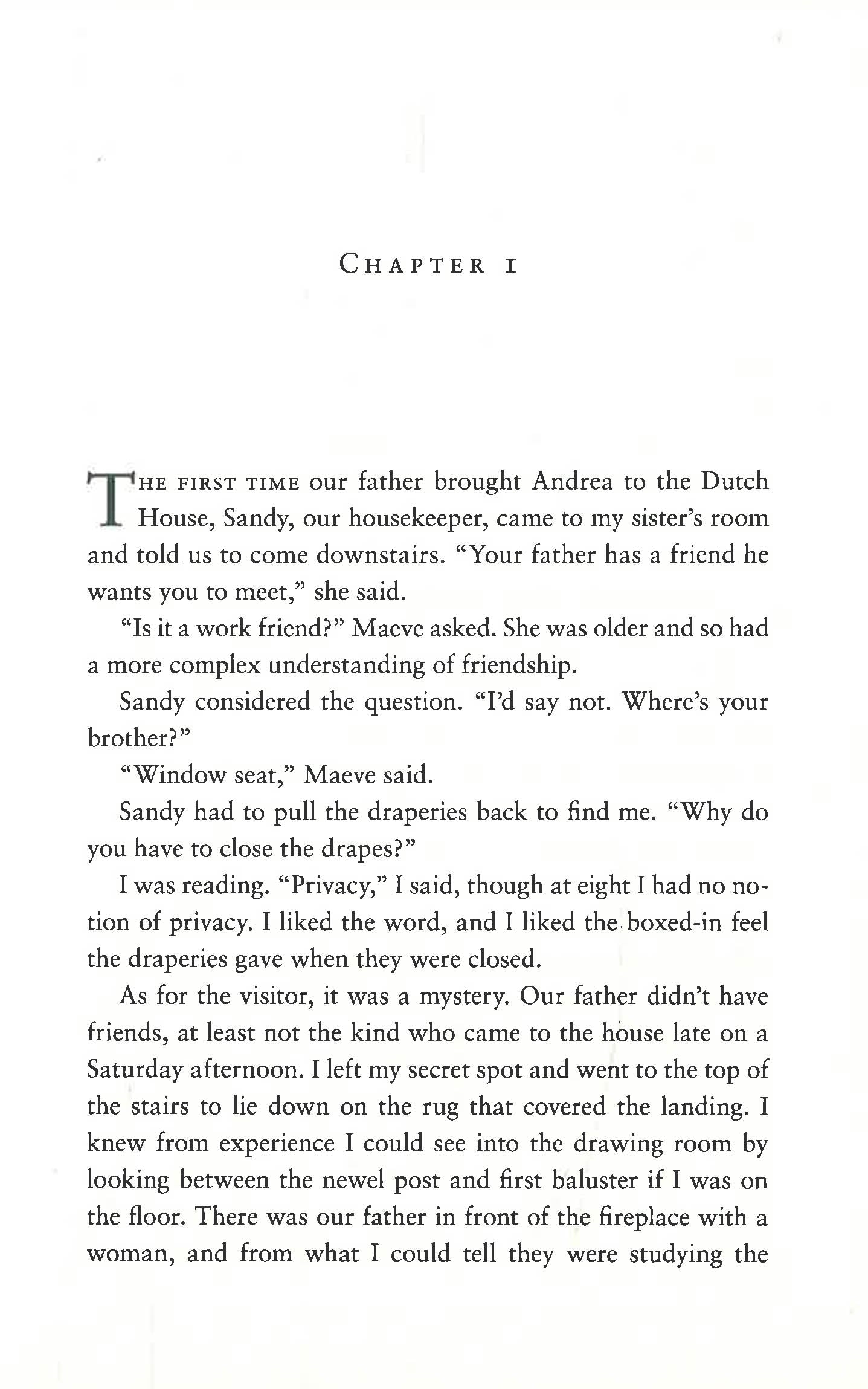 Life is comfortable and coherent, played out under the watchful eyes of the house's former owners in the frames of their oil paintings, or under the cover of the draperies around the window seat in Maeve's room. Then one day their father brings Andrea home: Andrea, small and neat, a dark hat no bigger than a saucer pinned over a twist of her fair hair. Though they cannot know it, Andrea's advent to the Dutch House sows the seed of the defining loss of Danny and Maeve's lives.