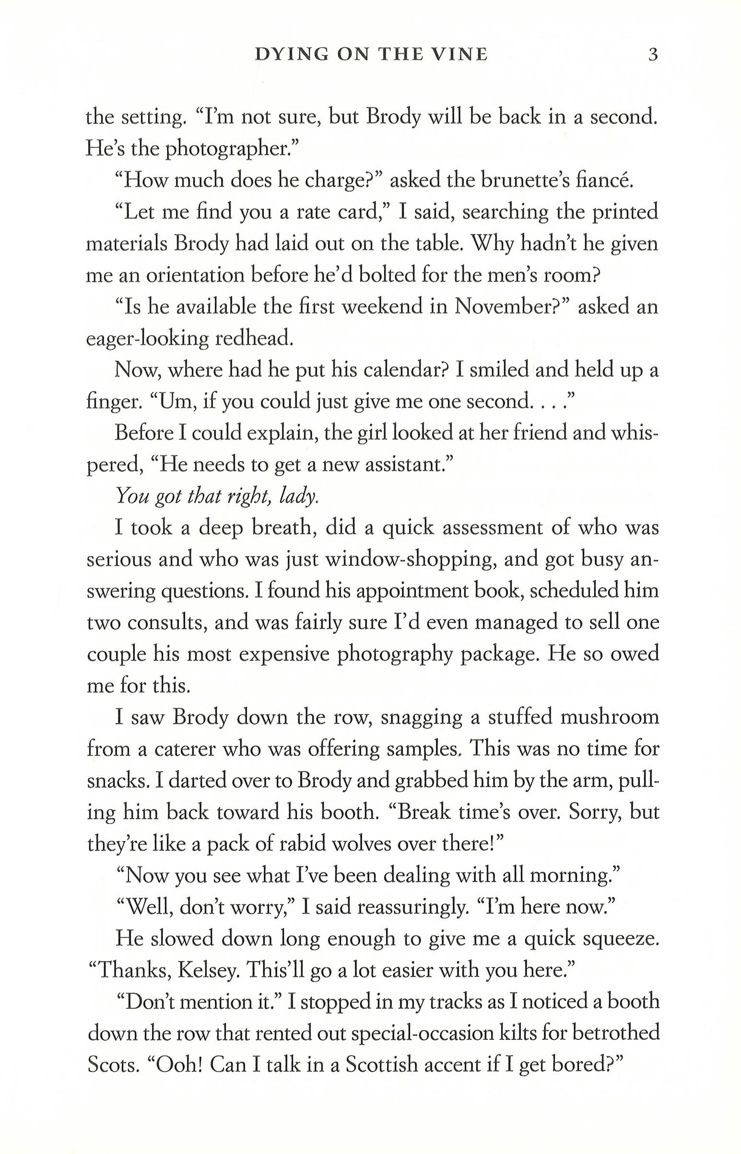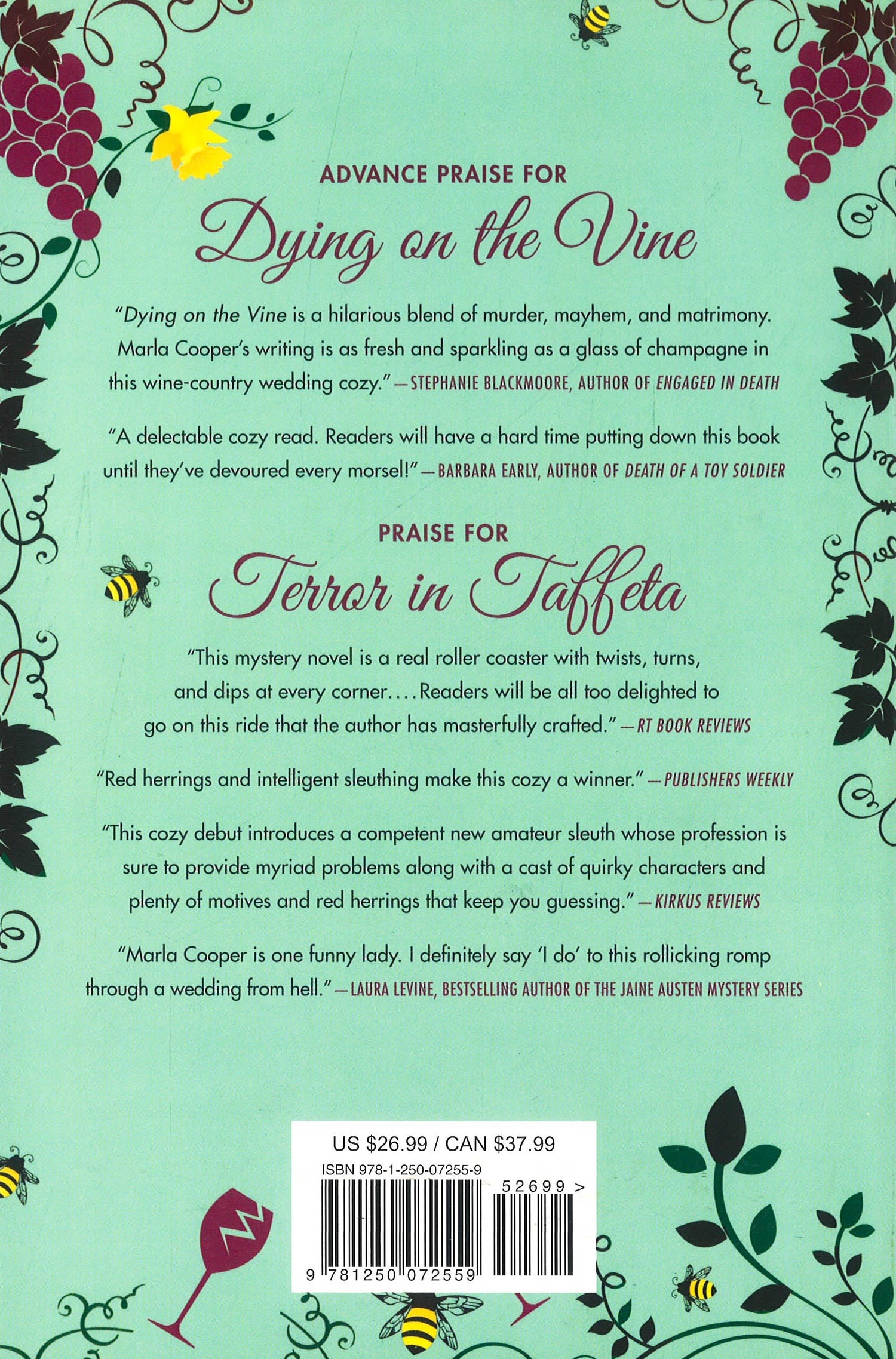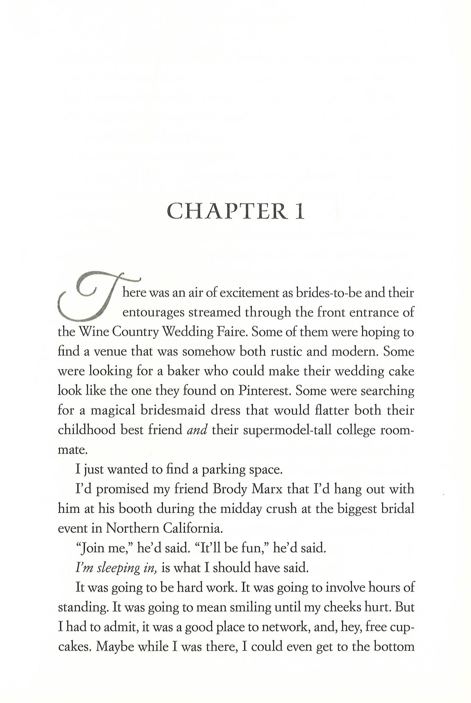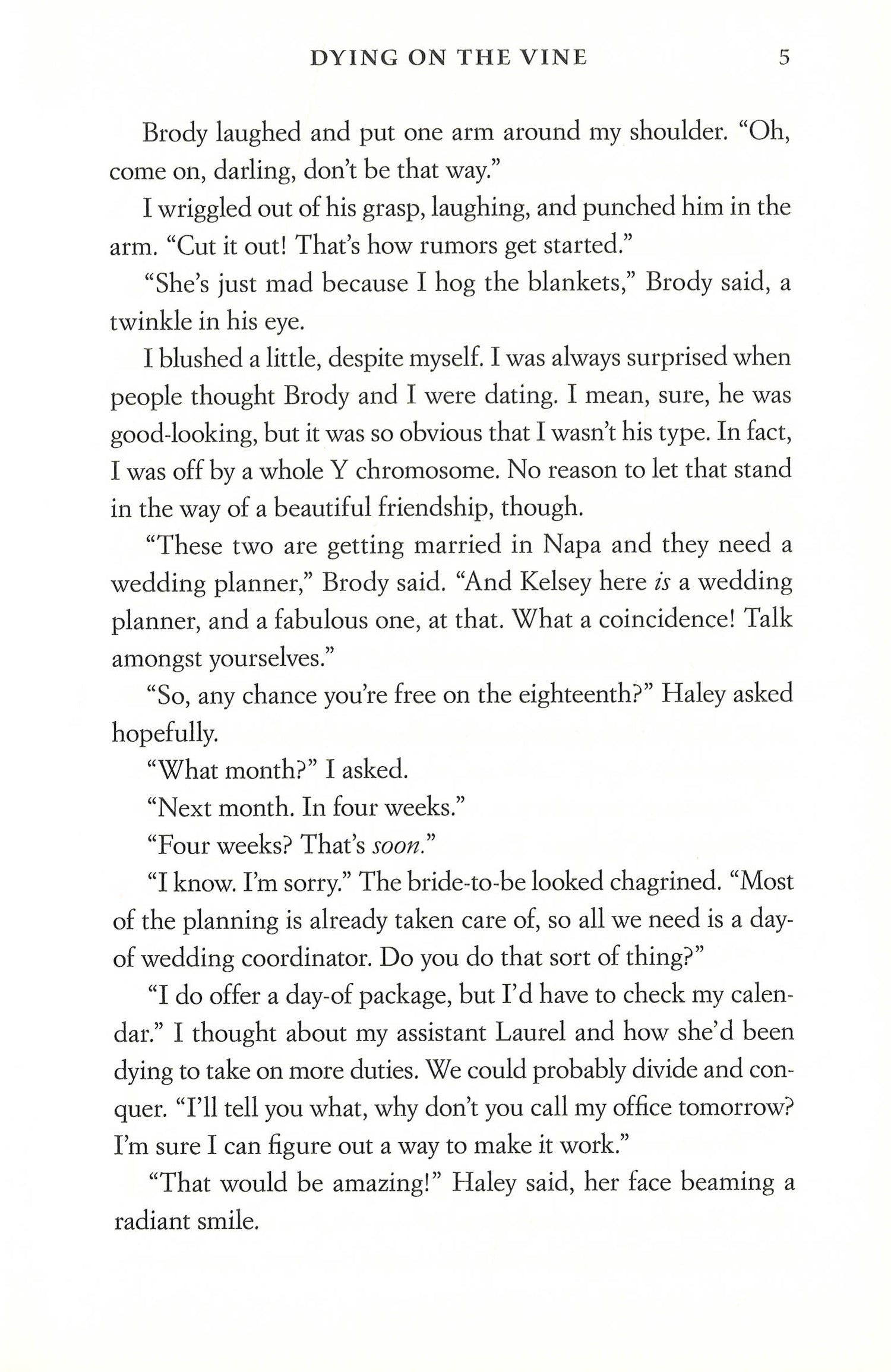 Wedding planner Kelsey McKenna just signed on to a dream gig. She’s going to be the “day-of” coordinator at the beautiful Higgens Estate in California wine country. There’s only one problem: the wedding was originally planned by Babs Norton, the self-proclaimed Queen of Wine Country Weddings, who the father of the bride has fired. Kelsey decides to clear the air with Babs and make sure there are no hard feelings, but before she can throw herself into executing the perfect wedding, she discovers Babs dead on the floor of his office. David, Babs’ assistant is quick to point the finger very publicly at Kelsey. Even worse, Kelsey learns that with the big day only weeks away, the bitter little man has sabotaged her new clients’ wedding by canceling all the vendor contracts. With the help of her friend Brody and assistant Laurel, Kelsey must scramble to salvage the wedding while dodging gossipy wedding planners, grumpy winemakers, and a cold-blooded killer in this smart, funny cozy.
