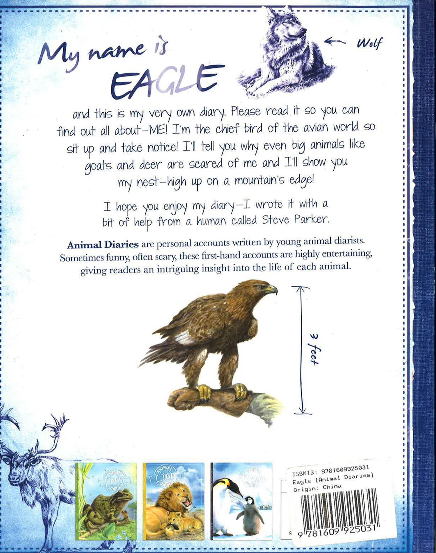 Plenty of natural history books look at animal life from an outsiders viewpoint. Now its time for some inside knowledge! A narrative diary text combined with up-to-date scientific knowledge to provide an entertaining and informative account of the daily lives of these creatures. My name is Eagle and this is my very own diary. Please read it so you can find out all about - ME! I'm top bird in the avian world so sit up and take notice! I'll tell you why even big animals like goats and deer are scared of me and I'll show you my nest - high up on a mountain's edge! I hope you enjoy my diary - I wrote it with a bit of help from a human called Steve Parker.