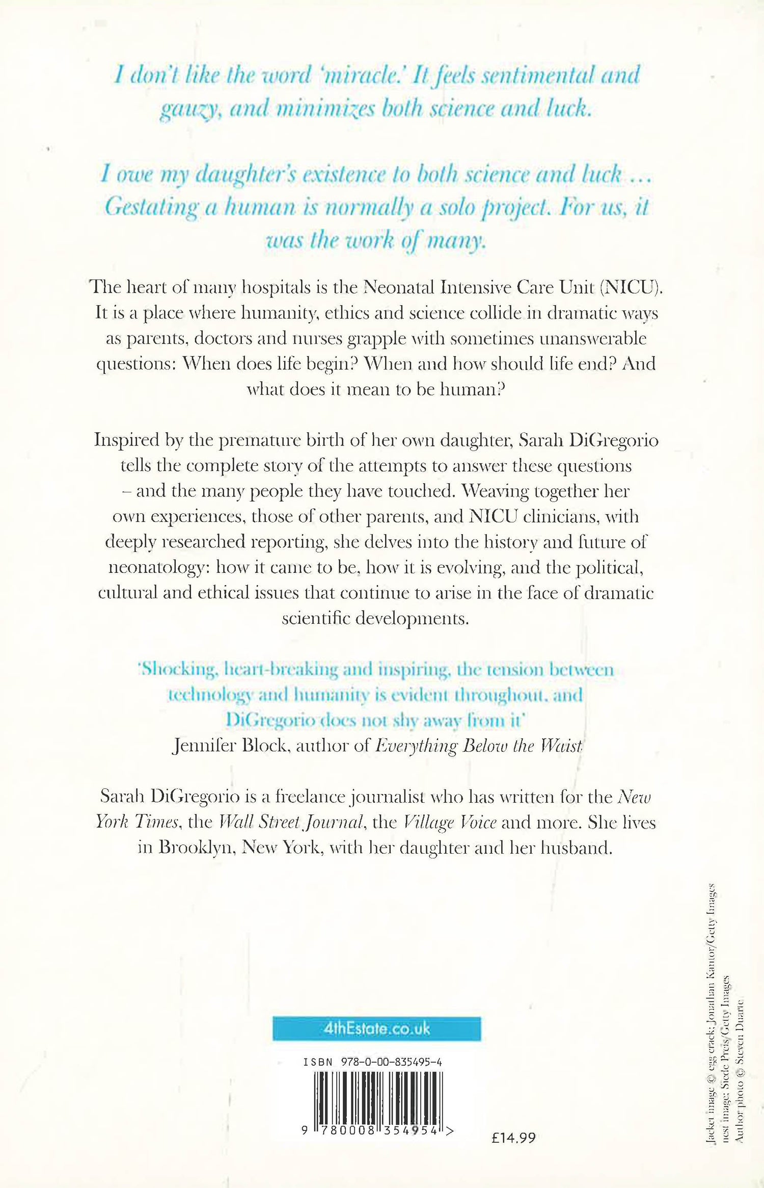 Inspired by Sarah DiGregorio's harrowing experience giving birth to her premature daughter, Early is a compelling and empathetic blend of memoir and rigorous reporting that tells the story of neonatology - and explores the questions raised by premature birth. 'A definitive history of neonatology, written with urgency and clarity, beauty and compassion. DiGregorio is at once a clear-eyed reporter and a mother who has lived through the reality of neonatal intensive care, and her balance of the two narrative strands is pitch-perfect. A popular science book that deserves its place among the best' Francesca Segal, author of Mother Ship The heart of many hospitals is the Neonatal Intensive Care Unit (NICU). It is a place where humanity, ethics, and science collide in dramatic and deeply personal ways as parents, doctors, and nurses grapple with sometimes unanswerable questions: When does life begin? When and how should life end? And what does it mean to be human? For the first time, Sarah DiGregorio tells the complete story of this science - and the many people it has touched. Weaving her own experiences and those of NICU clinicians and other parents with deeply researched reporting, An Intimate History of Premature Birth delves deep into the history and future of neonatology, one of the most boundary pushing medical disciplines: how it came to be, how it is evolving, and the political, cultural, and ethical issues that continue to arise in the face of dramatic scientific developments. Previously published as Early