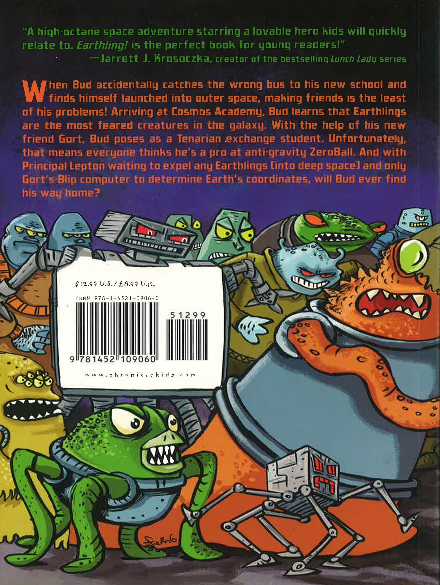 Every kid worries about making friends at a new school, but when nine-year-old Bud accidentally catches the wrong bus on his first day and finds himself launched into a far-away galaxy, making friends is the least of his problems! Arriving at Cosmos Academy, deep in outer space, Bud soon learns from Principal Lepton that Earthlings are the most feared and hated creatures in the galaxy. With the help of his new friend, Gort, Bud hides his true identity and tries to fit in by going undercover as an exchange student whose Uncle Spock can't take care of him while his dad works at the X-wing factory, and learning to play high-stakes anti-gravity ZeroBall (even though he's only ever been good at watching sports). But with paranoid Principal Lepton threatening to expel (into outer space) any Earthlings, and nothing more than Gort's hacked Blip-computer to help them determine Earth's coordinates, will Bud ever find his way home? Both gripping and hilarious, this dynamic graphic novel is perfect for kids who crave adventure with a sense of humor.