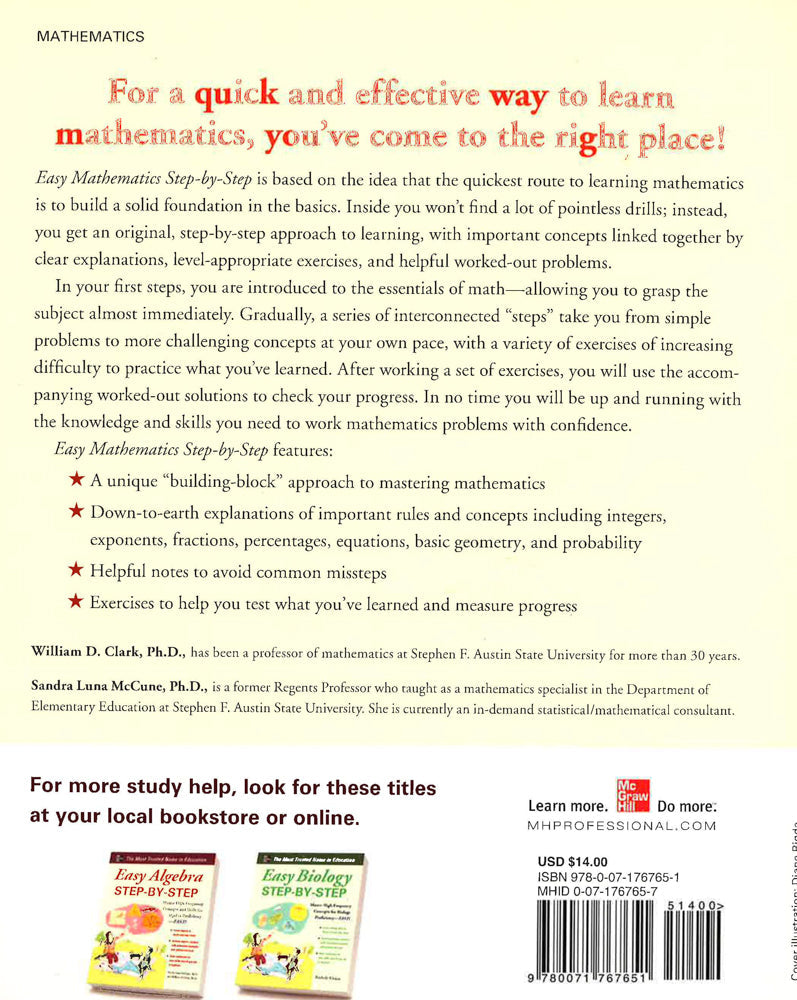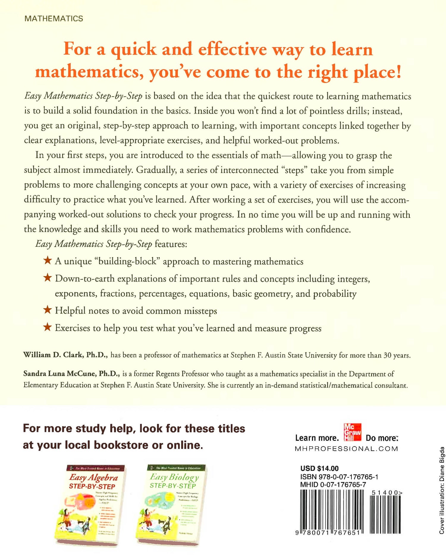The quickest route to learning a subject is through a solid grounding in the basics. So what you won't find in Easy Mathematics Step-by-Step is a lot of endless drills. Instead, you get a clear explanation that breaks down complex concepts into easy-to-understand steps, followed by highly focused exercises that are linked to core skills--enabling learners to grasp when and how to apply those techniques.