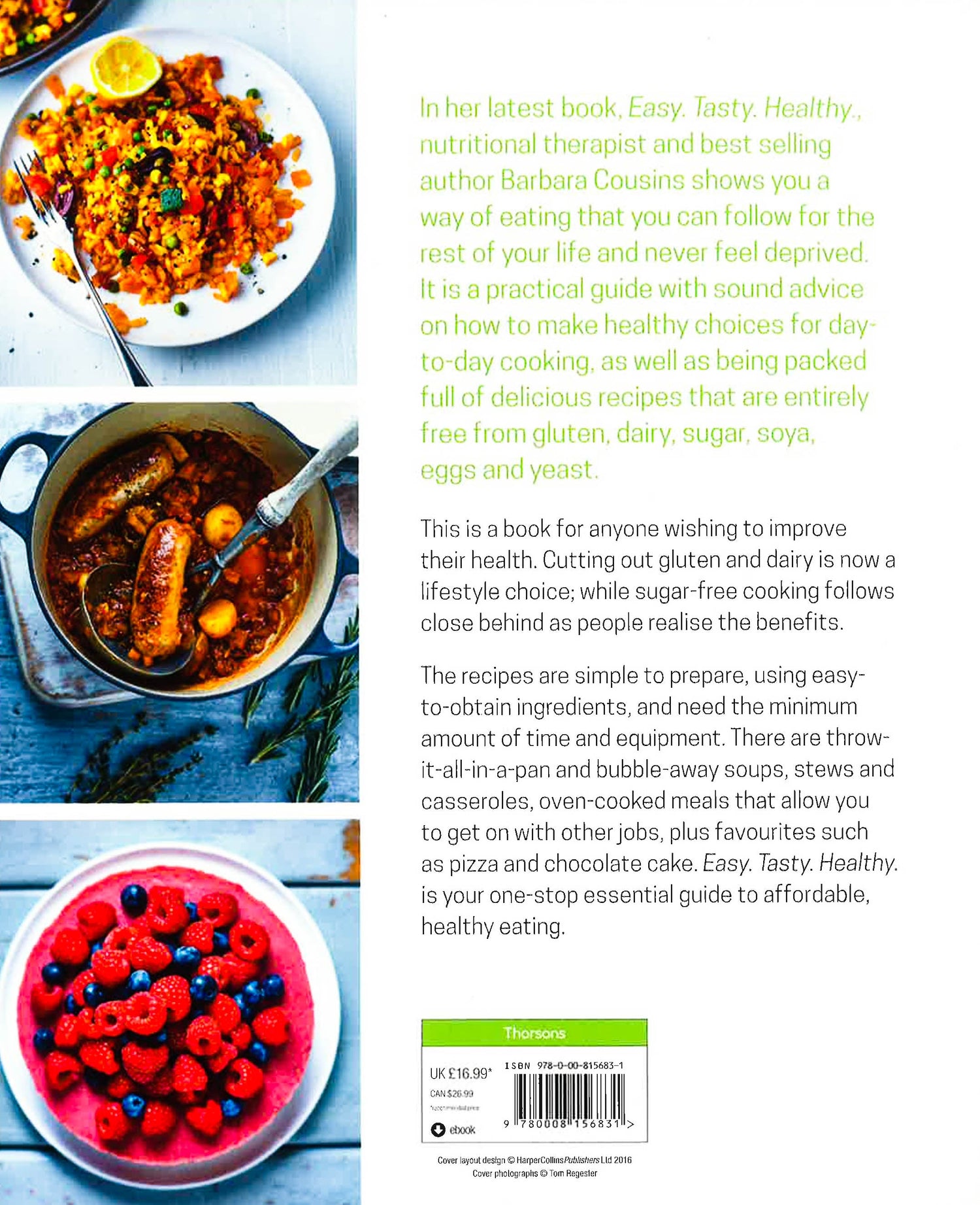 `Easy Tasty Healthy' is nutritional therapist Barbara Cousin's latest book. It is a practical guide with sound nutritional advice on how to make healthy choices for day-to-day cooking, as well as being packed full of delicious recipes that are entirely free of some of the main food allergens, gluten, dairy, sugar, soya, eggs and yeast.This is a way of eating that you can follow for the rest of your life and never feel deprived.The recipes are simple to prepare, using easy-to-obtain ingredients, and need the minimum amount of time and equipment. There are throw-it-all-in-a-pan and bubble away soups, stews and casseroles, oven-cooked meals that allow you to get on with other jobs, plus favourites such as pizza, chocolate cake and ice cream. `Easy Tasty Healthy' is your one-stop essential guide to affordable, healthy eating.