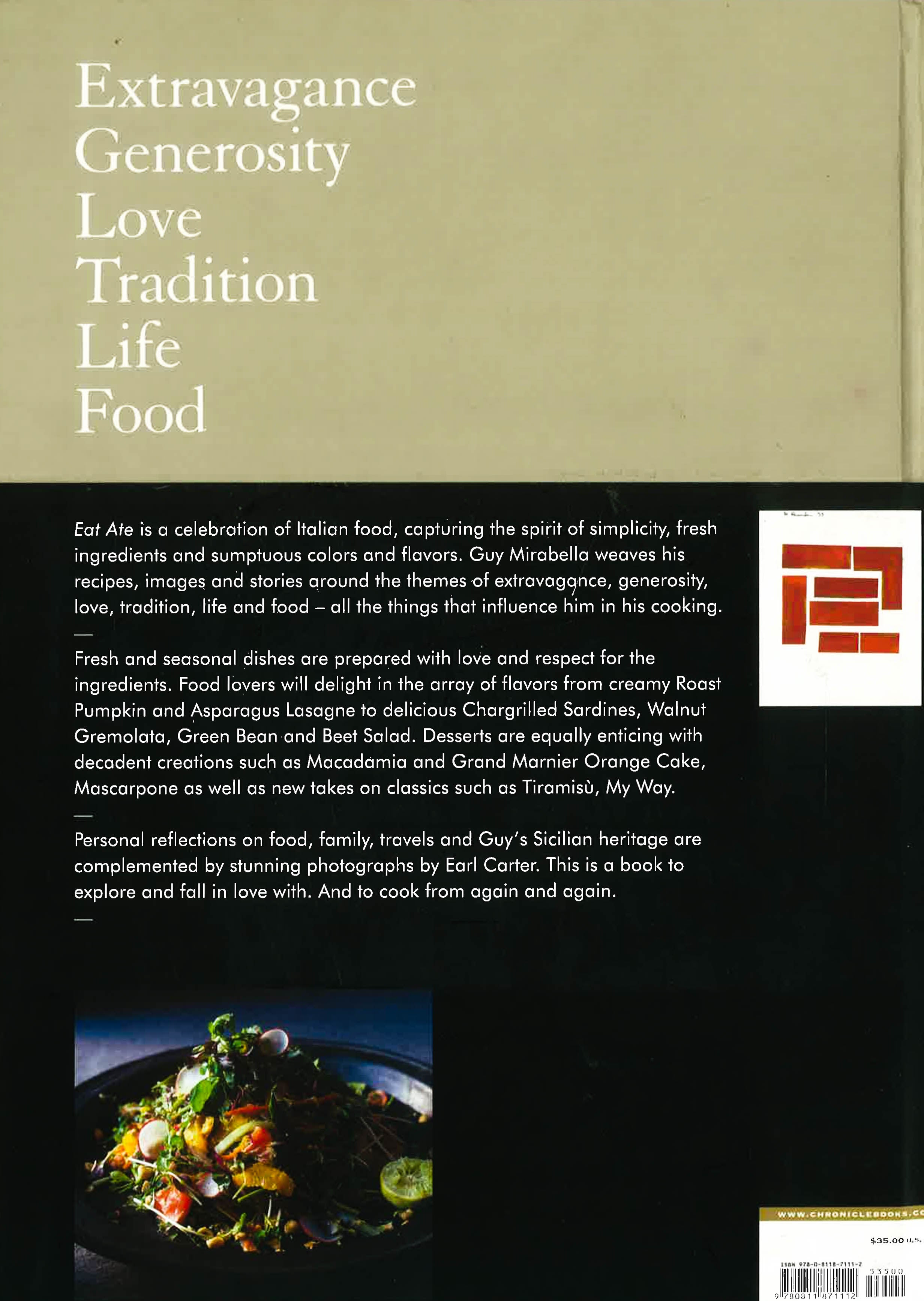 Eat Ate is a gorgeous book about everyone's favorite food: Italian. With more than 70 recipes, from Rosa's Almond Biscotti to creamy Roast Pumpkin and Asparagus Lasagne, this delightful cookbook/memoir explores the observation: what you are is what you eat. The unique format features family snapshots, artwork by the author and inserts that mimic love letters and journal entries. Author Guy Mirabella chef, painter, teacher shares the luscious details of growing up Italian in Australia, developing his bountiful love of food and lust for life. Simple, fresh, and seasonal ingredients are on the table in this vivid and personal exploration of Italian cuisine.