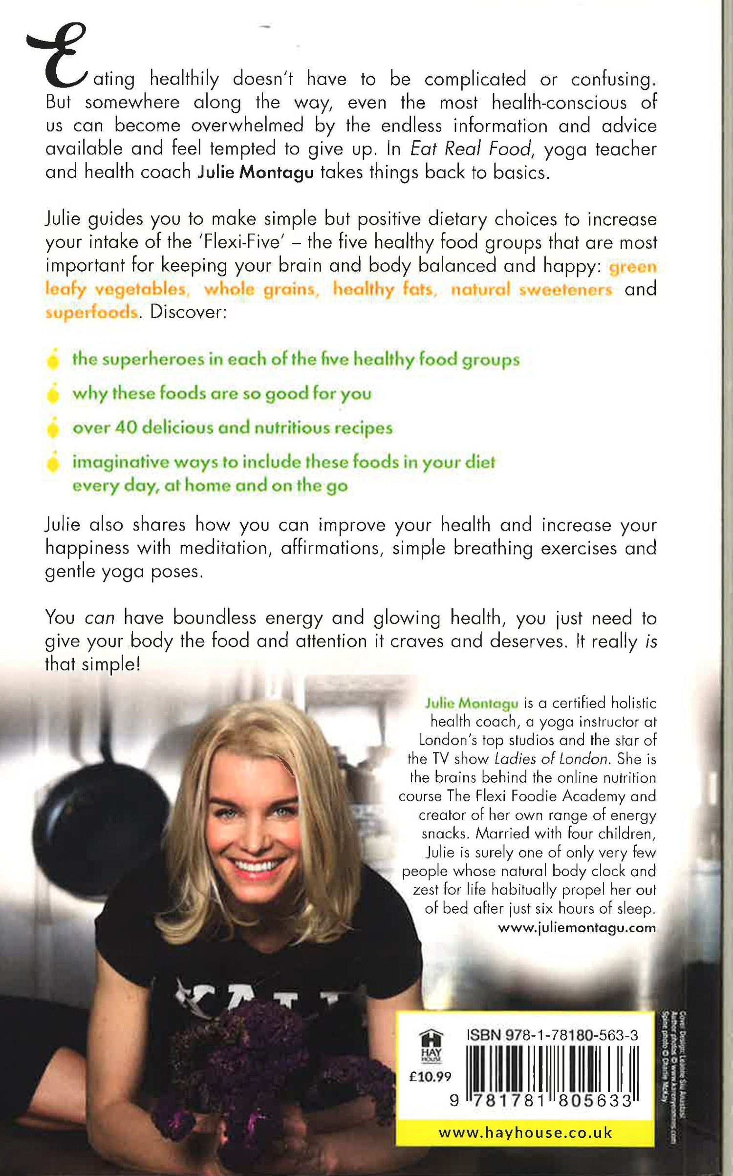 Eating healthily doesn't have to be complicated or confusing. But somewhere along the way, even the most health-conscious of us can become overwhelmed by the endless information and advice available and feel tempted to give up. In Eat Real Food, yoga teacher and health coach Julie Montagu takes things back to basics. Julie guides you to make simple but positive dietary choices to increase your intake of the 'Flexi-Five' - the five healthy food groups that are most important for keeping your brain and body balanced and happy: green leafy vegetables, whole grains, healthy fats, natural sweeteners and superfoods. Discover: - the superheroes in each of the five healthy food groups - why these foods are so good for you - over 40 delicious and nutritious recipes - imaginative ways to include these foods in your diet every day, at home and on the go Julie also shares how you can improve your health and increase your happiness with meditation, affirmations, simple breathing exercises and gentle yoga poses. You can have boundless energy and glowing health, you just need to give your body the food and attention it craves and deserves. It really is that simple!