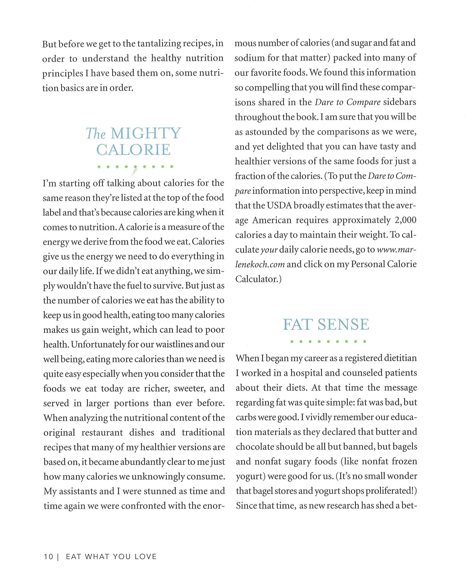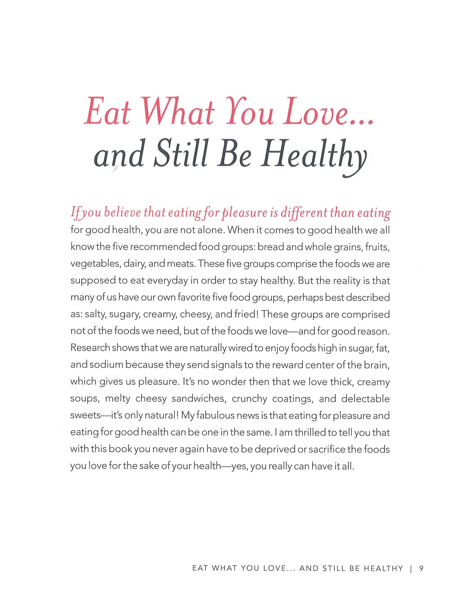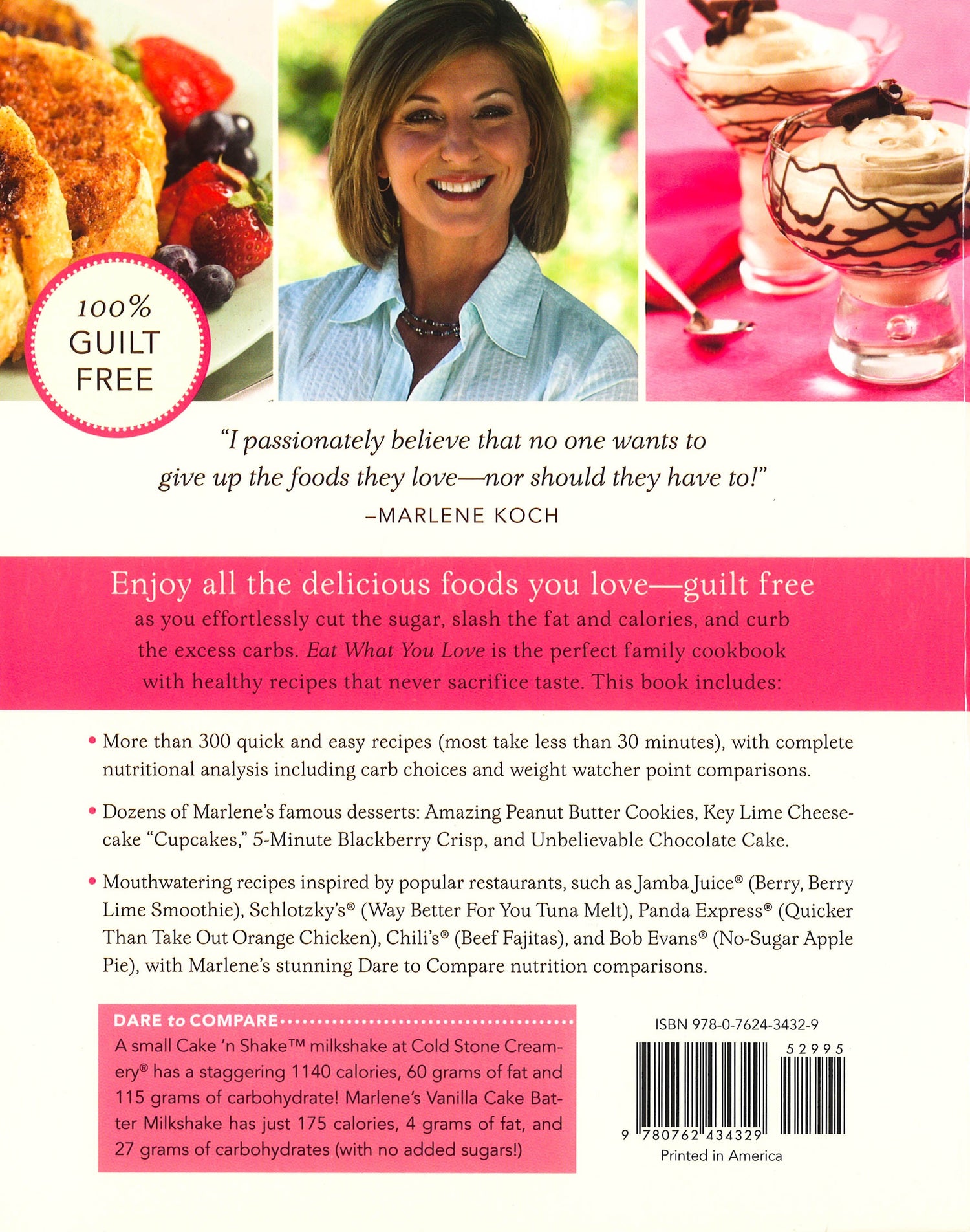 Marlene Koch's has been called a"magician in the kitchen" for her amazingly ability to make excess sugar, fat, and calories disappear, but never the taste ! In Eat What You Love she works her magic once again crafting incredible tasting guilt-free recipes for everyone's favourite foods -from luscious milkshakes and melty sandwiches, to creamy soups and crunchy"fried" foods- along with recipes for belly- filling breakfast dishes, sensational salads, perfect pastas, easy-fix entrees, savoury soups and sides, and of course lots of desserts! With over 300 super-satisfying recipes under 350 calories Eat What You Love takes guilt-free eating to the next level offering everything from comforting classics like Blue Ribbon Sour Cream Coffee Cake and Everyday Spaghetti and Italian Meatballs, to restaurant and fast-food favourites such as Quicker-Than-Take-Out Orange Chicken, and Chili's-Style Beef Fajitas, to dozens of 100% guilt-free sweet treats, such as 5-Minute Blackberry Crisp, Amazing Peanut Butter Cookies, Triple Chocolate Cheesecake Pie and Perfect White Cupcakes. Marlene passionately believes no one should have to give up the foods they love and her quick &lsquon'easy family friendly recipes are perfect for everyone (and every diet! ). Ideal for weight loss, diabetes, and simply utterly delicious healthy eating , Eat What You Love also features mouthwatering photos, cooking and shopping tips, meal planning guidelines, complete nutritional analysis (including diabetic exchanges, carb choices, and weight watchers point comparisons) , and" Dare to Compares" that reveal the astonishing savings: Dare to Compare : A small Cake &lsquon Shake milkshake at Cold Stone Creamery (R) packs 1140 calories, 60 grams of fat and the equivalent of over 25 teaspoons of sugar! Marlene's luscious Vanilla Cake Batter Milkshake has just 175 calories, 4 grams of fat and no added sugars!