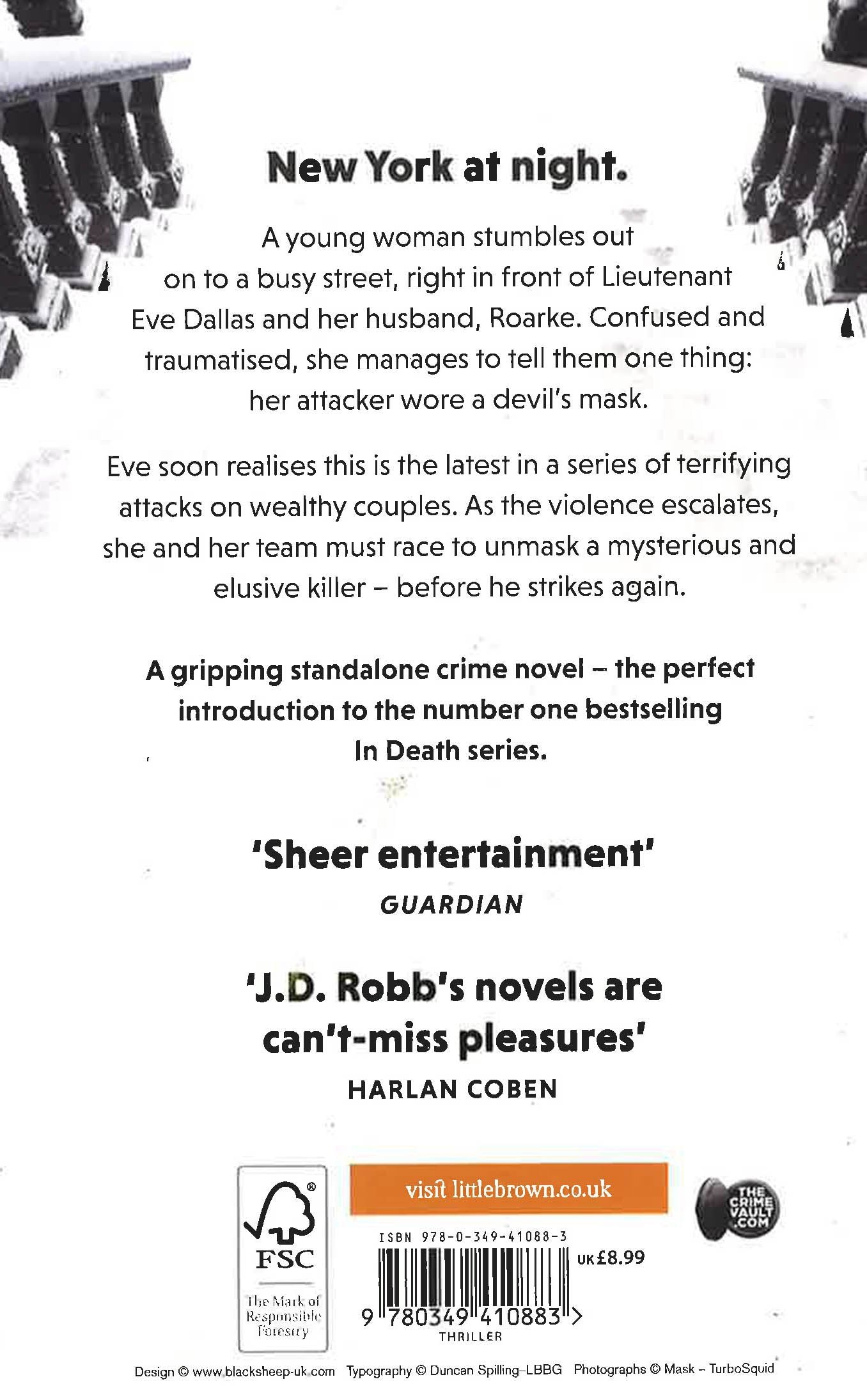 New York at night. A young woman stumbles out on to a busy street - right in front of Lieutenant Eve Dallas and husband Roarke. Her name is Daphne Strazza, and she has been brutally assaulted. Confused and traumatised, she manages to tell them one thing. Her attacker wore a devil's mask. As Eve investigates this shocking case, she soon discovers a disturbing pattern. Someone is preying on wealthy couples, subjecting them to a cruel and terrifying ordeal. Worse still, the attacks are escalating in violence and depraved theatricality. Eve and her team are now in a race against time to find the man behind the mask - before he strikes again. But for Eve, this case in particular has unsettling echoes of her own troubled past...