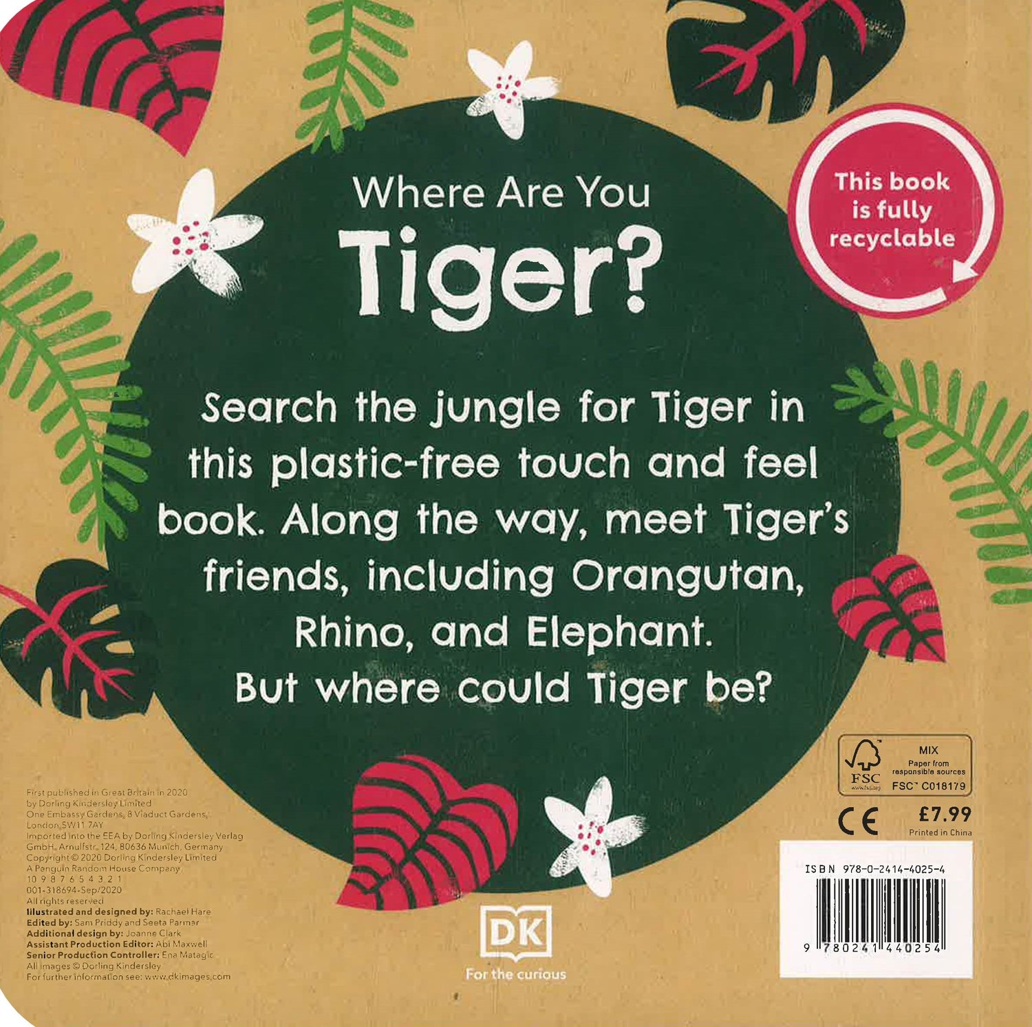 Search the tropical jungle for Tiger in this plastic-free touch and feel book. You'll discover beautiful endangered animals along the way!Welcome to the jungle! Let your little explorer take a journey through the hot and steamy forest to track down the rarely sighted Tiger. Say hello to elephants, rhinos and orangutans in their natural habitat. But where could Tiger be?Is Tiger by the river? No, that's Elephant. Can you hear squawking coming from the treetops? Tigers don't squawk, that's Parrot. Only on the last page, will Tiger reveal himself. Your toddler will love meeting all of Tiger's friends in this imaginative educational book. Natural cardboard pages with colourful illustrations, fun corrugated elements, and cut out sections encourage little fingers to explore. Your toddler will learn how to recognise the names and describe all the incredible animals they see in the jungle. Treasure story time with your little one! The simple text is ideal for reading aloud to little ones as you spot endangered animals in their natural habitat together.. There are lots of opportunities for parent-and-child interaction and hours of wild, jungle fun!Plastic-Free Touch and FeelThis board book is designed to enhance your child's reading experience, while also protecting the environment. Unlike other touch and feel books, Where Are You Tiger? doesn't contain any plastic. Made from responsibly sourced cardboard, everything in this book is completely recyclable.Complete the SeriesThere are more plastic-free touch and feel picture books to discover in this series from DK Books. Journey through the icy Arctic looking for the Polar Bear in Where Are You Polar Bear?Each book takes you on a journey through a different landscape in search of an animal at risk of extinction.
