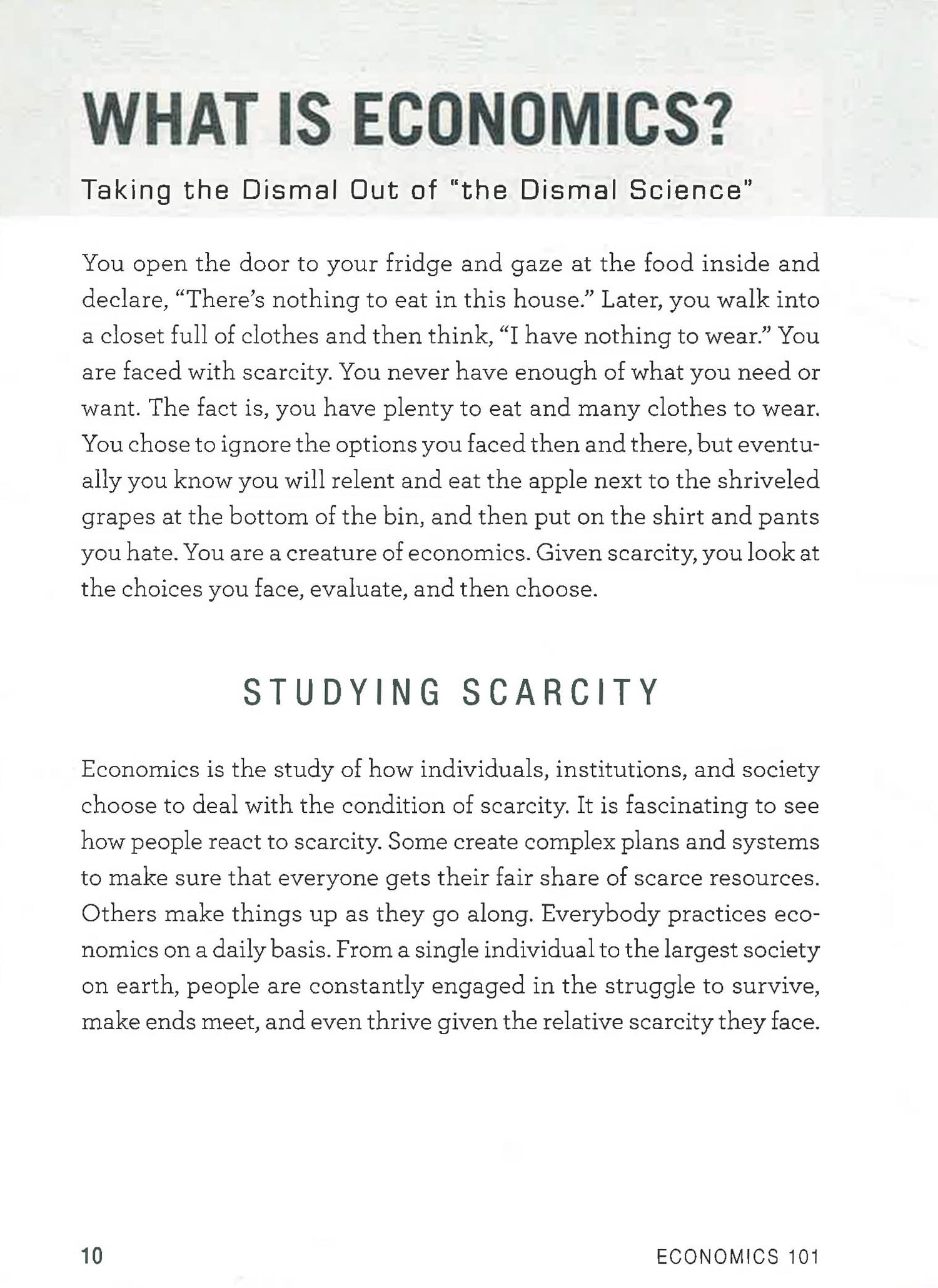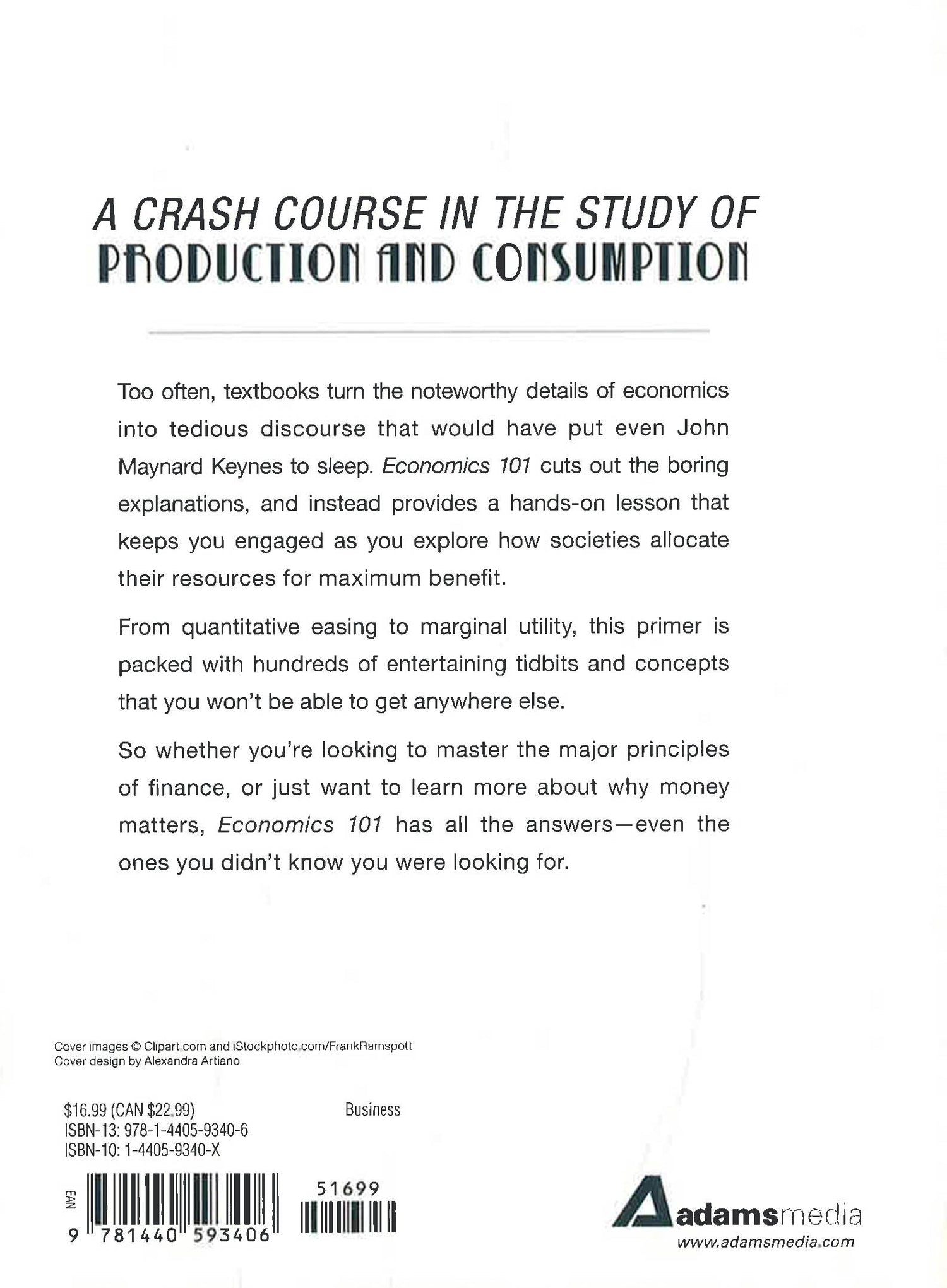 So much of the world revolves around economics, so why do most texts make it so dull and difficult to learn? But learning economics doesn’t have to be boring. In Economics 101, you’ll see how learning economics can be engaging.Too often, textbooks turn the noteworthy details of economics into tedious discourse that would put even Joseph Stiglitz to sleep. Economics 101 cuts out the boring explanations and instead provides a hands-on lesson that keeps you engaged as you explore how societies allocate their resources for maximum benefit. From quantitative easing to marginal utility, this primer is packed with hundreds of entertaining tidbits and concepts that you won't be able to get anywhere else. You’ll learn the basics on terms such as, monopolies and oligopolies, game theory, inflation, price ceilings, and so much more. Have you ever wondered about the origin of banking or how banks create money? You’ll find those answers here. Whether you're looking to master the major principles of finance, or just want to learn more about why money matters, Economics 101 has all the answers—even the ones you didn't know you were looking for.